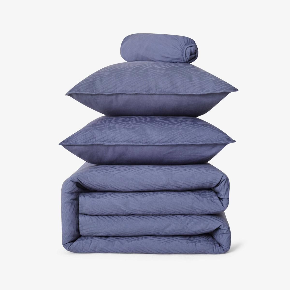 Our Freddie bed linen duvet set is the height of luxury in a bedroom. It is classic, stylish, and will never go out of style. Add this elegant jacquard pattern to your bedroom, and you'll enjoy a more sumptuous sleep experience. The 300T. C cotton sateen used to create its pattern ensures that it will look great for years to come. Made of 100% cotton, which is breathable and cool, the high-quality style and thread count will bring the feeling of a boutique hotel bed into your home. Available in classic navy or white, our Freddie jacquard bed comes with a double duvet cover, fitted sheet, 2 pillowcases and makes a luxurious addition to any bedroom..