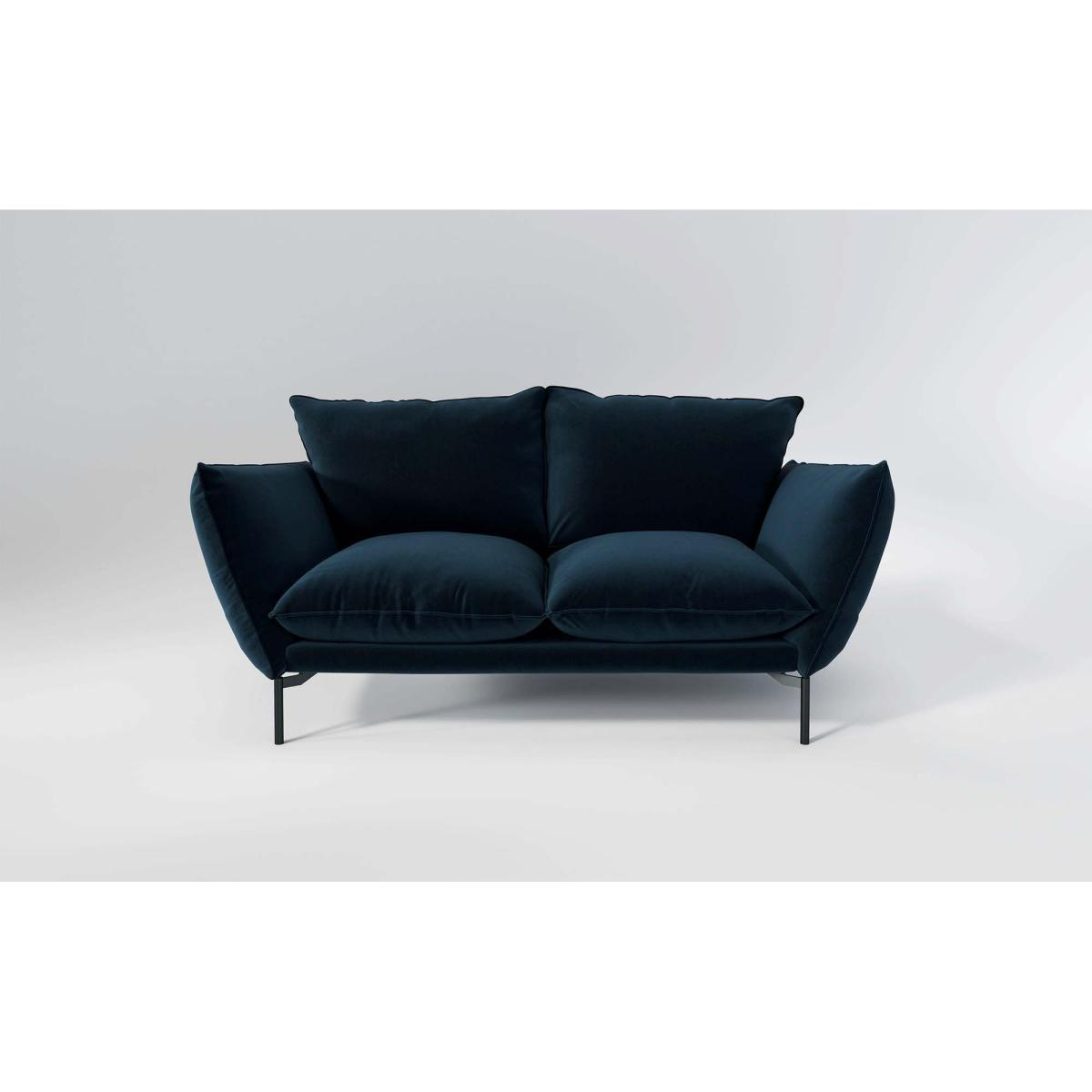 Freddie is the king of squishy comfort. Generously filled with foam and feathers, this contemporary design has a nod to stylish retro influences. The deep seat is supported by a tall back and angled arms, and the look is completed with sleek black metal legs. The perfect sofa to curl up in. Available in a range of sumptuous fabrics, you can tailor the Freddie to complement any interior space. Pictured: 2 seater sofa in Navy Blue Classic Velvet. Handmade in 8-10 weeks and then delivered usually within 10 working days.