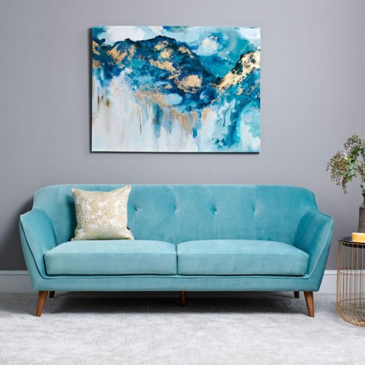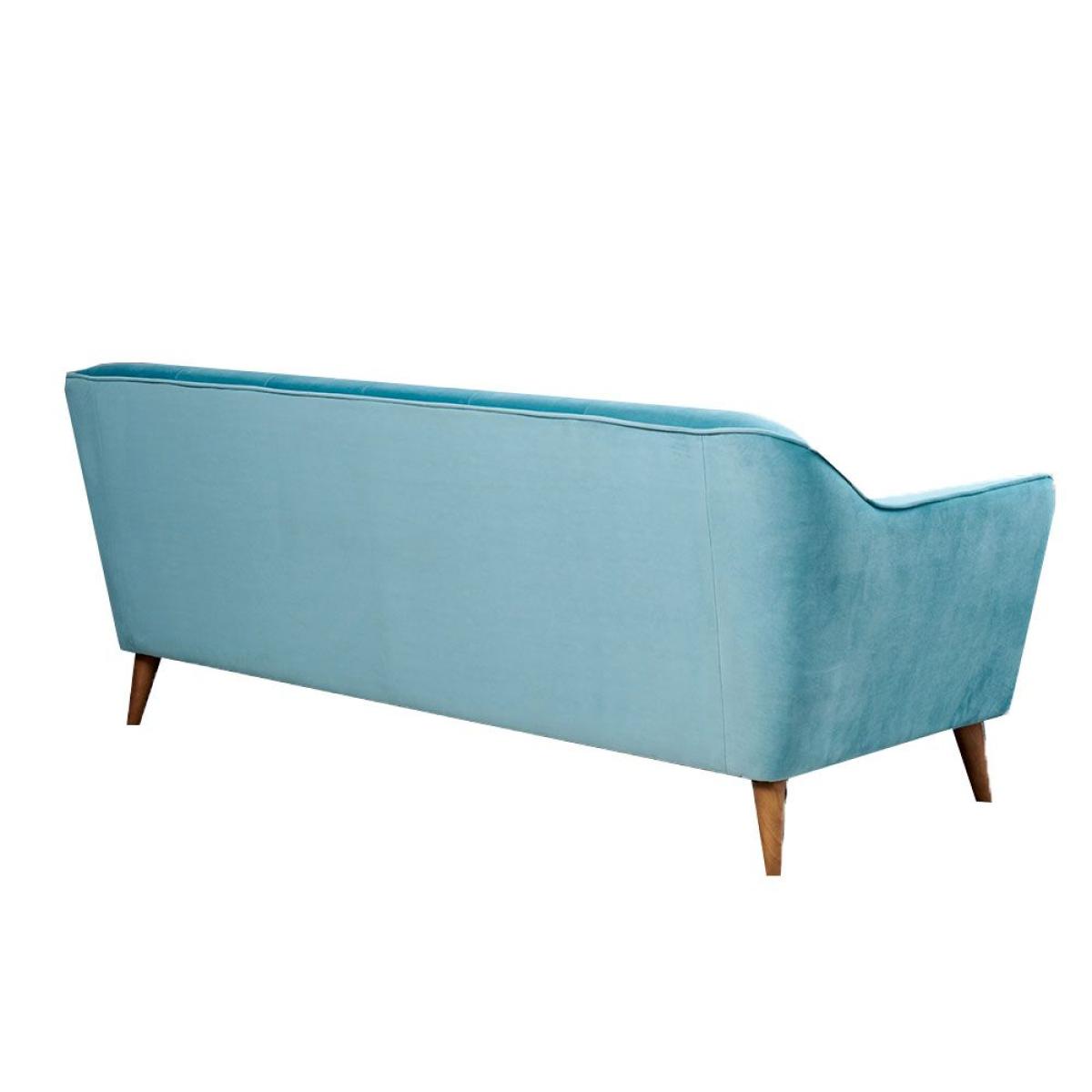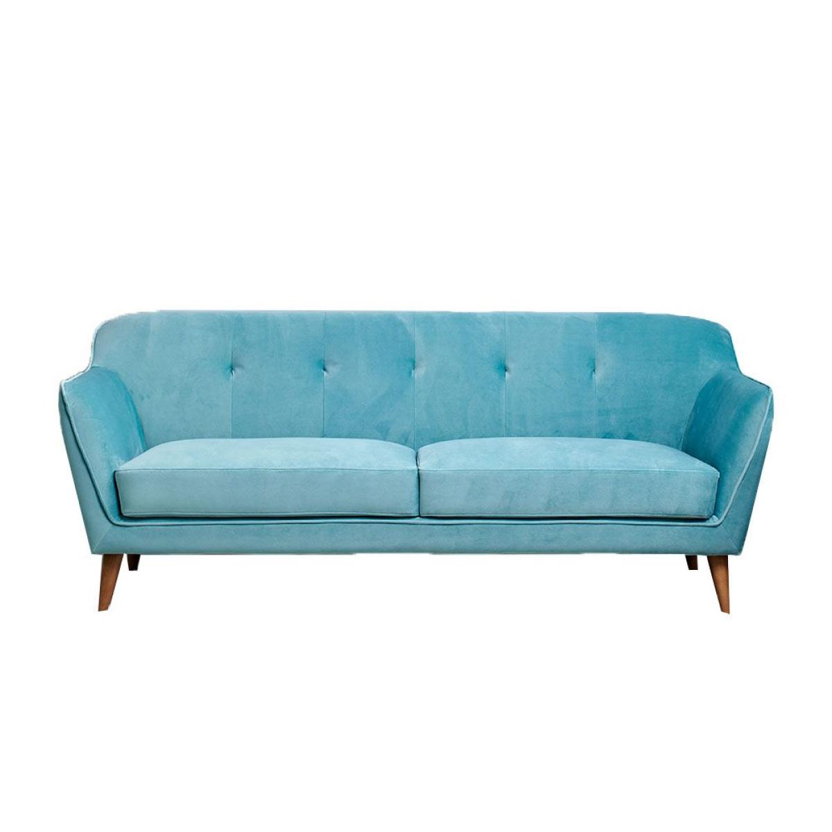 Featuring a beautiful, pale sky blue velvet upholstery which will help to create a light and airy environment, the Freddie 3 seater sofa combines a retro inspired shape as seen with its curved back and high arms with a modern design. Choose from a whole rainbow of colours that are perfect for brightening up your home. W194cm x D86cm x H78cm - Seat Height 40cm, Seat Depth 59cm. Swatch available on request. Simple self assembly