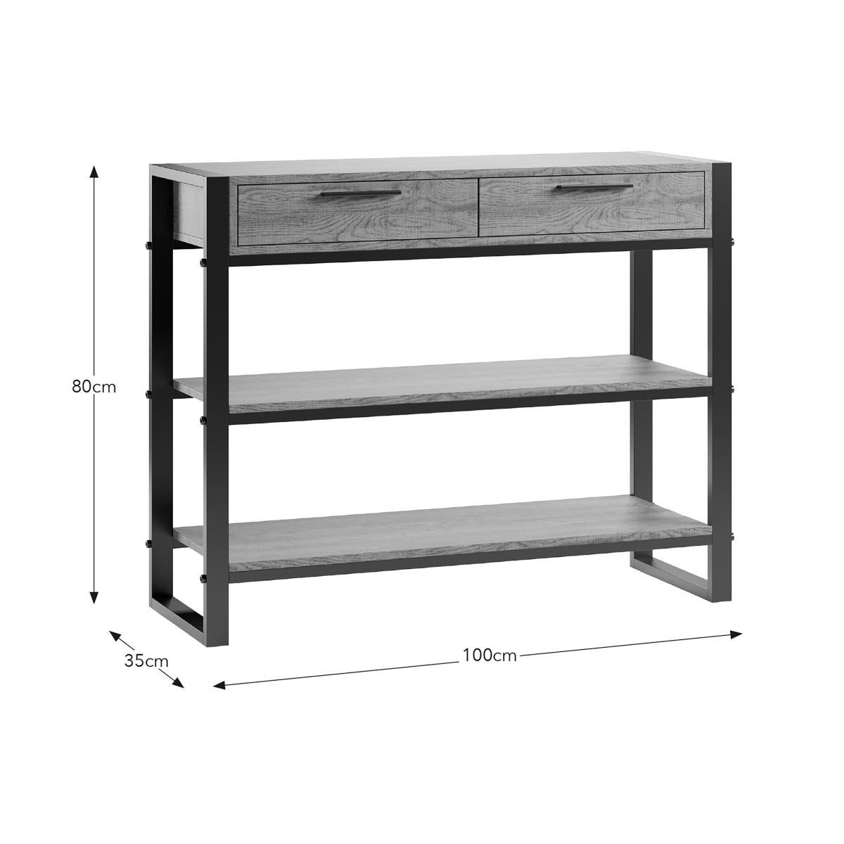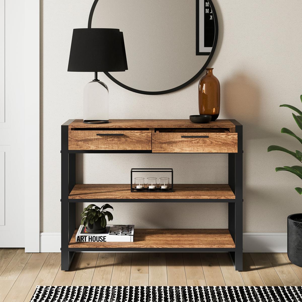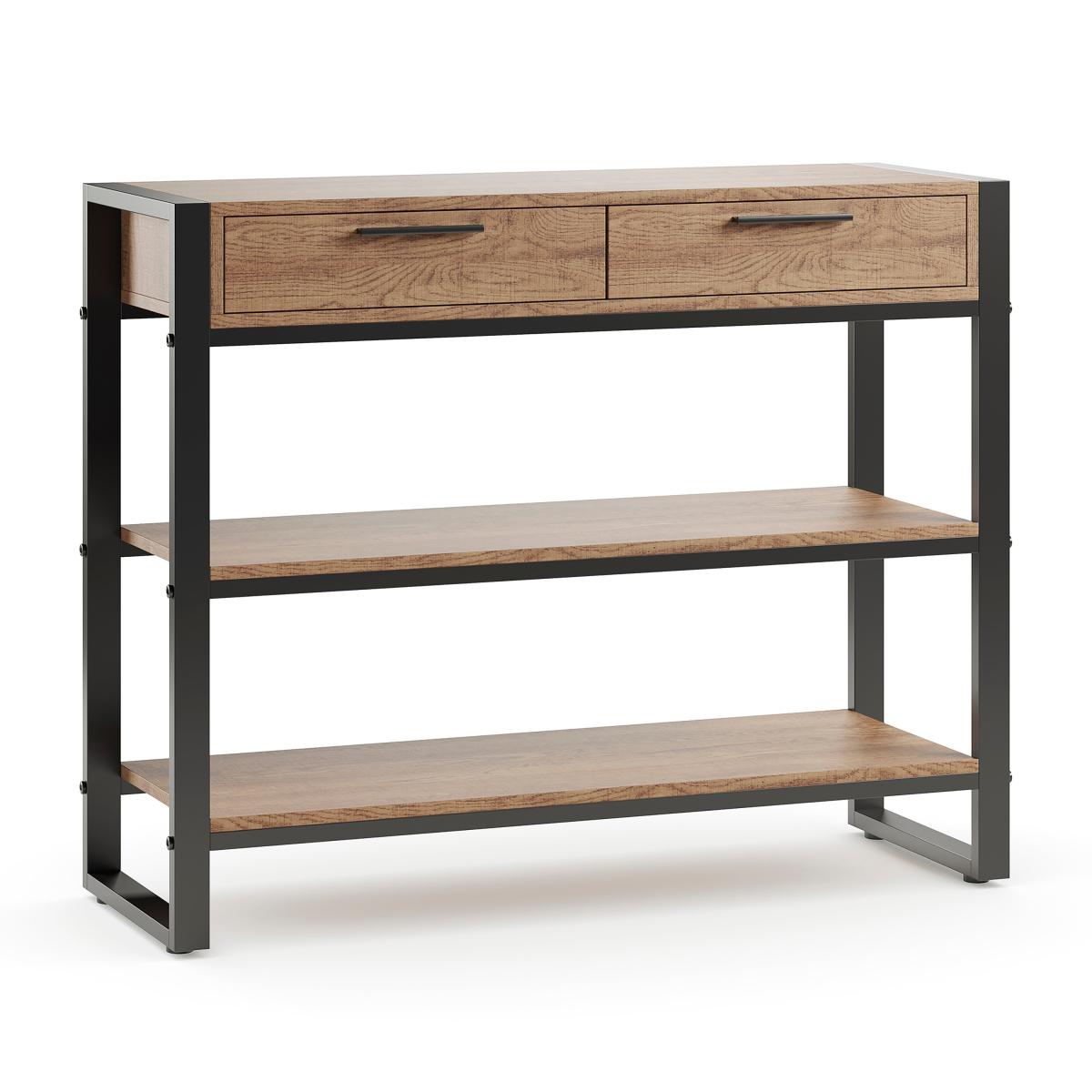 * Rustic Wood Effect* 2 Large Drawers* Metal Legs This console table effortlessly combines rustic charm with modern simplicity, featuring a rustic wood effect finish that adds warmth and character to any space. With its clean lines and understated design, it seamlessly complements a variety of home styles, making it a versatile choice for your hallway or living room. Equipped with two spacious drawers, it provides ample storage for organising daily essentials, while the large wooden top offers plenty of space for keys, glasses, photos, and more, helping you create a tidy and organized space.