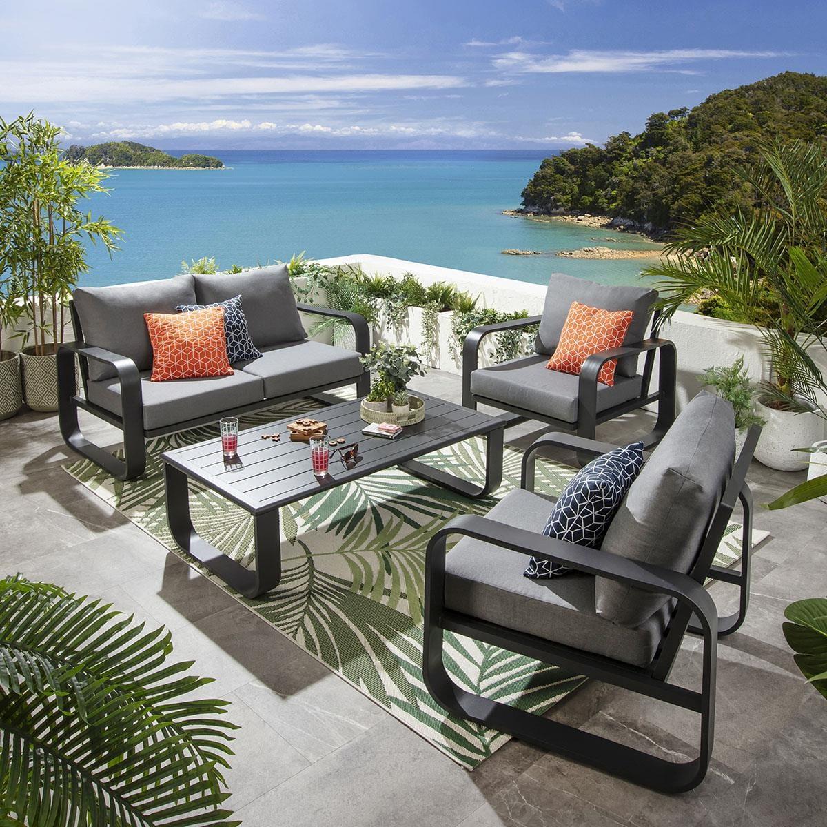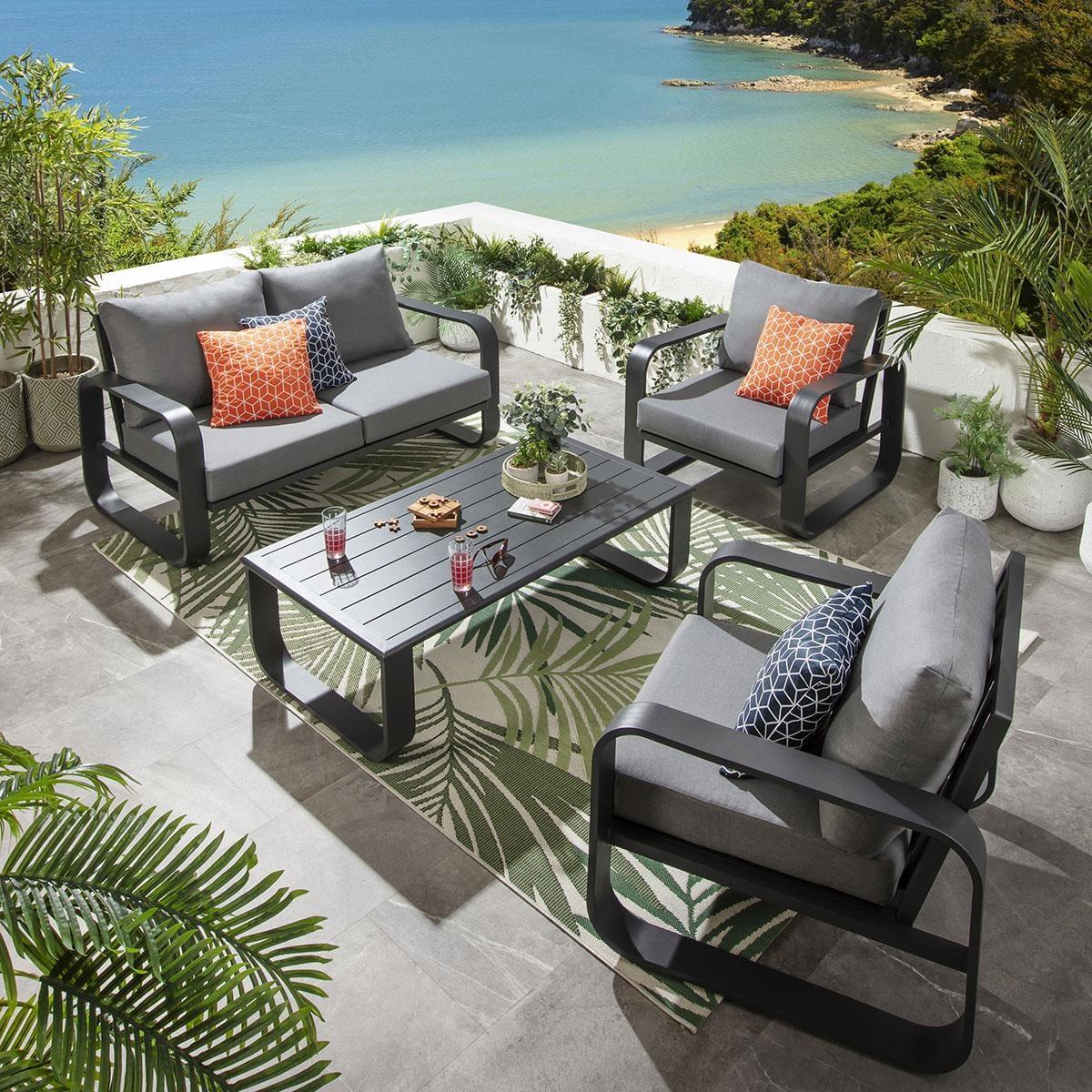 The Freddy 4-seater garden sofa set, with a patio sofa, 2 armchairs and a table, features a full aluminium construction for complete weather resistance. The sleek black frame of the outdoor sofas adds a modern touch to your patio or garden, complemented by thick, grey fabric cushions that ensure unparalleled comfort. Crafted for durability, Freddy's full aluminium composition guarantees weather-resistance and longevity, making it the perfect outdoor sofa for any season. The chunky proportions offer unparalleled comfort, striking the ideal balance between style and support. The modern black frame with a textured finish enhances the luxurious feel of this garden sofa set. The seats, made from high-grade foam, provides a plush foundation, while the softer, supportive wadding in the back ensures optimal comfort. Upholstered in premium grey fabric, the cushions add a touch of sophistication to your outdoor setting. For convenience, the cushions come with zips for easy removal of covers, ensuring hassle-free cleaning. We recommend storing the cushions when not in use to maintain their pristine condition. Assembling your Freddy garden sofa set is quick and easy, involving a few bolts to put the main panels together - all the necessary tools are provided. The included weather cover offers additional protection, ensuring the longevity of your outdoor sofa. The practical design, combined with the ease of assembly, makes the Freddy modern garden sofa a must-have for those seeking a blend of style, comfort, and durability in their outdoor living space. 2 Seater Sofa Size W160cm D92cm H84cm Armchair Size W90cm D92cm H84cm Weather covers are included