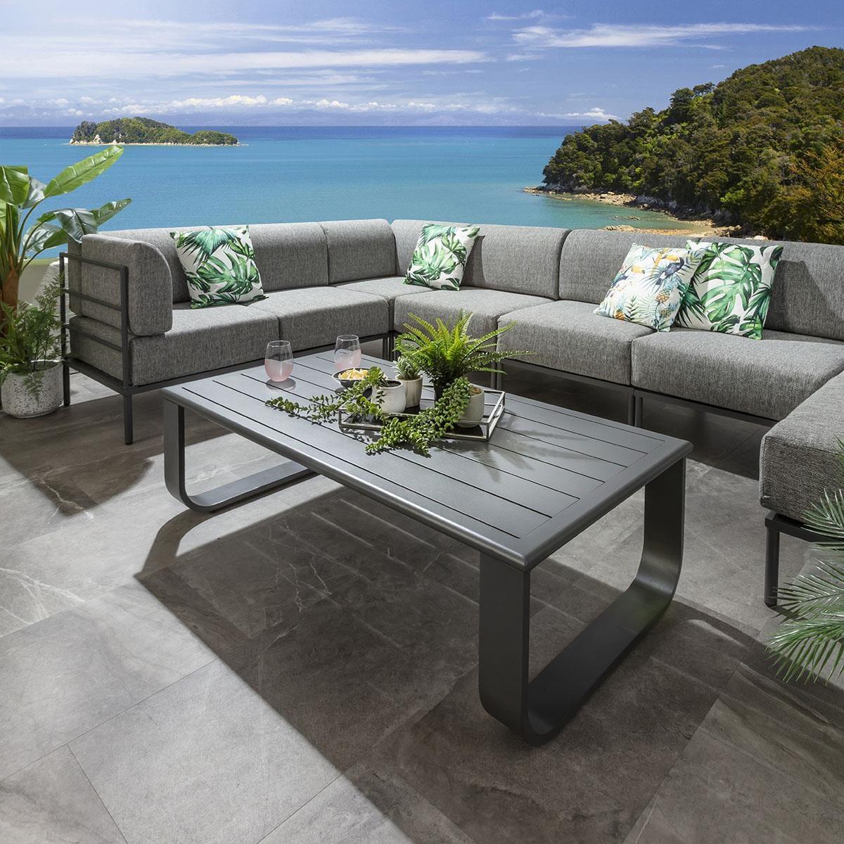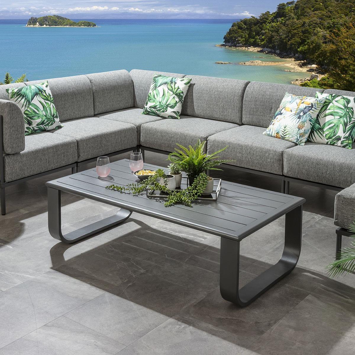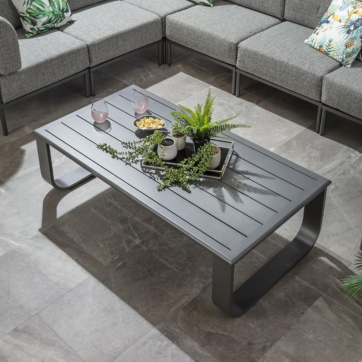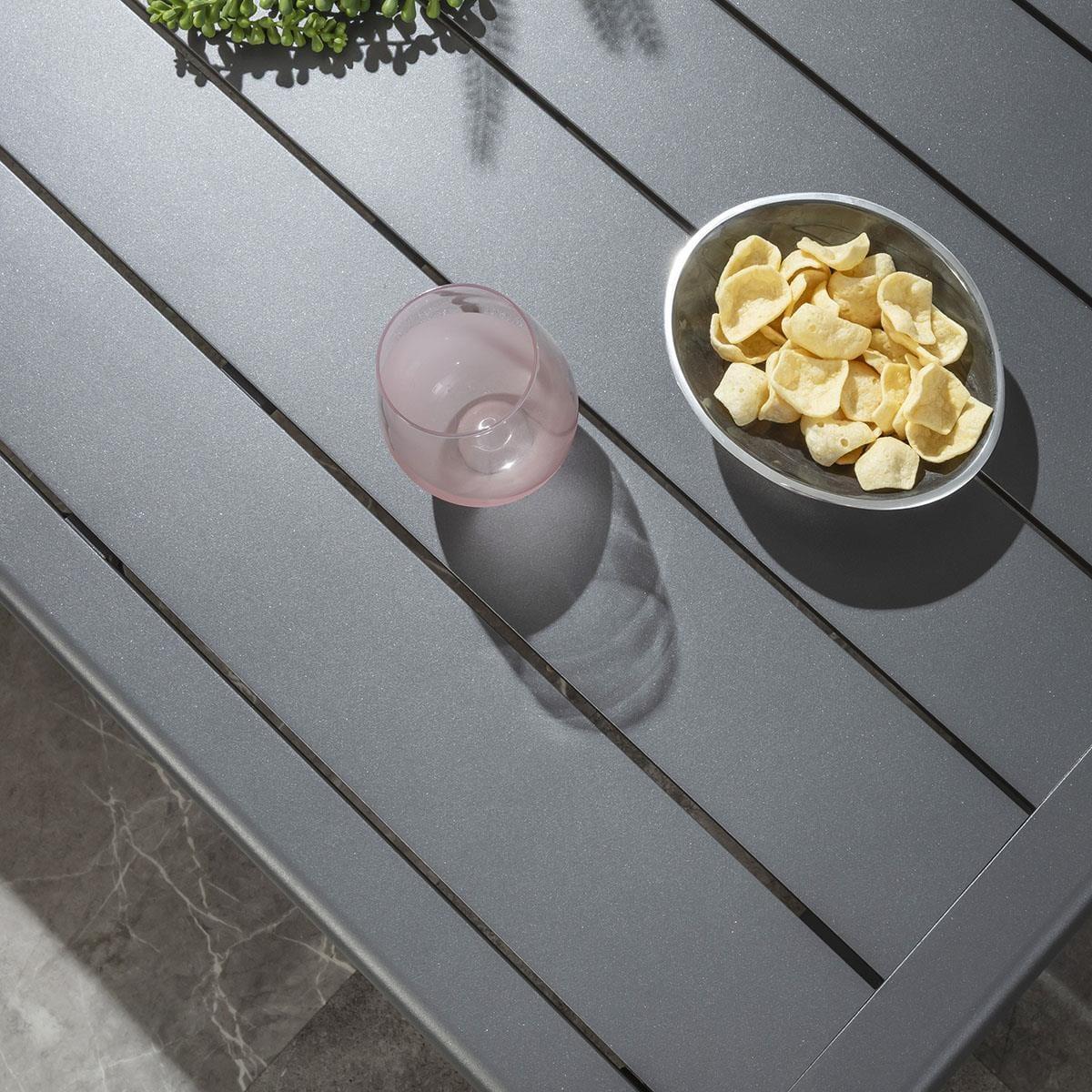 Upgrade your patio with this modern outdoor coffee table, crafted from rust-resistant aluminium for all-weather durability. Featuring a sleek slatted top and curved leg design, its a perfect coffee table for the garden. A rich grey powder-coated finish enhances its contemporary style. Built from high-quality aluminium, the Freddy patio coffee table withstands all seasons. Unlike steel, aluminium wont rust, so you can leave it uncovered all year round without worry. Ideal for long-lasting use in gardens, patios, and outdoor spaces. This exterior coffee table boasts a slatted aluminium top for a stylish yet practical surface. The curved leg design adds an elegant touch, making it a standout piece for any contemporary outdoor setting. Keep your garden coffee table spotless with the included protective cover. It shields against tree sap, bird mess, and debris, ensuring your modern outdoor coffee table stays clean and ready to use. W140cm D72cm H42cm Aluminium Frame Weather covers are included