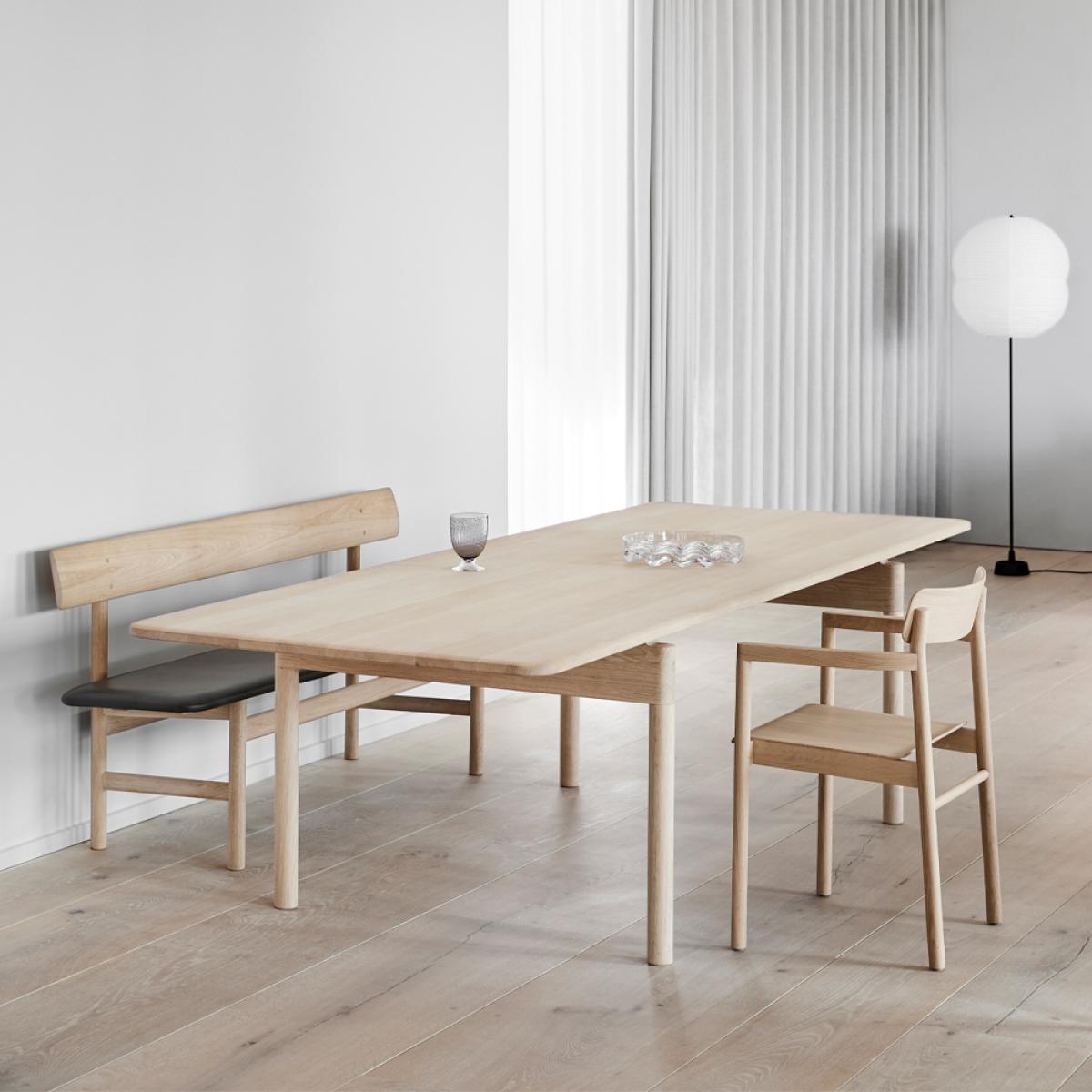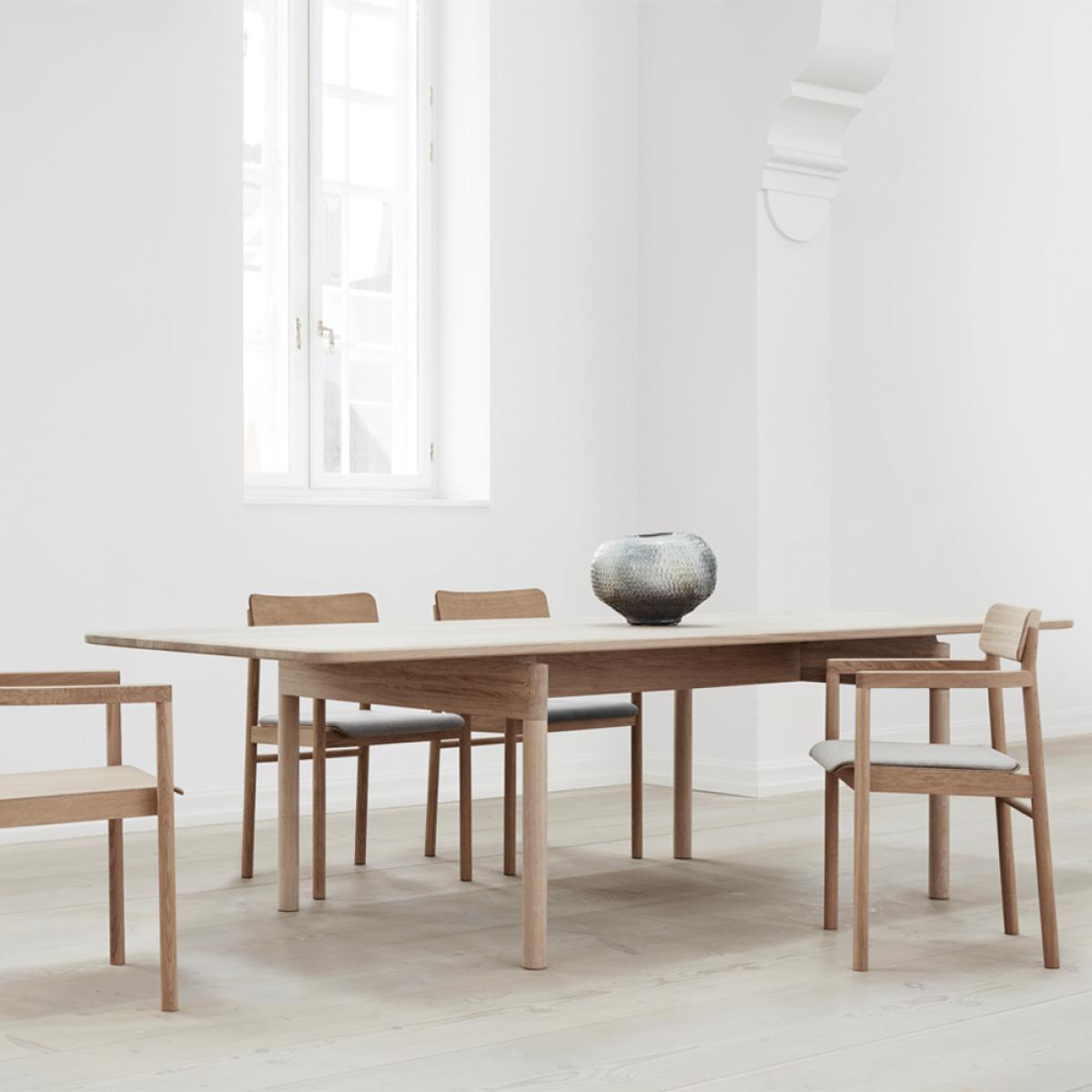Post 6440 dining table from Fredericia Furniture is a sleek table that combines modern minimalism with practical function. The long rectangular wood-veneer tabletop and the sturdy solid-wood legs provide a stable, timeless design. The table's generous proportions offer ample legroom at each end, making it easy to set for large dinner gatherings without feeling cramped. Post 6440 blends simplicity, calm, and functionality, becoming a natural centerpiece in the home for both everyday use and special occasions.
