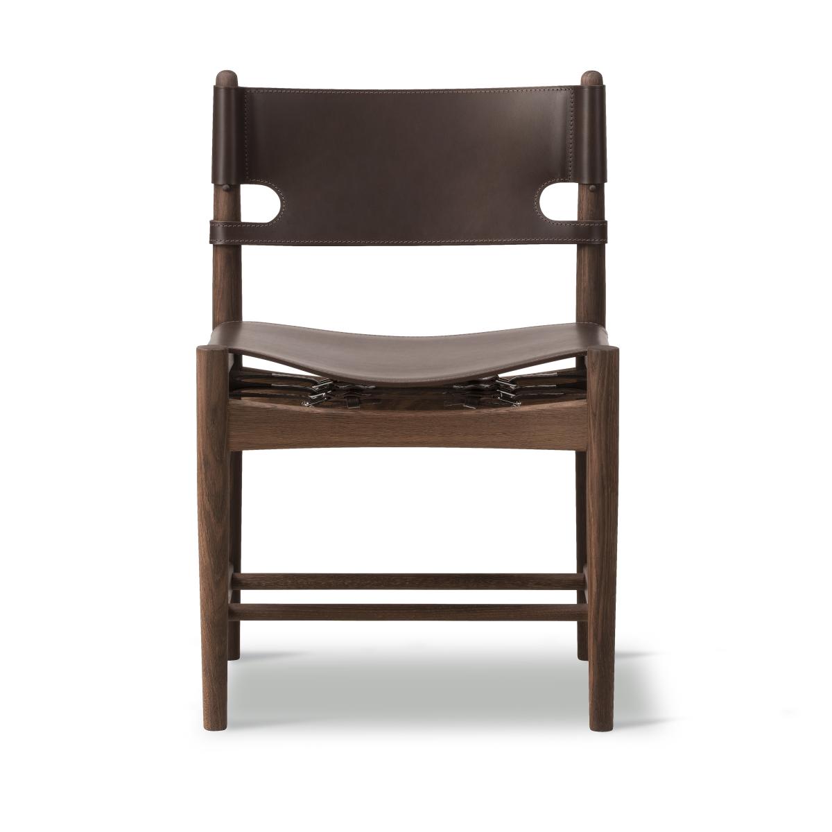 The Spanish Dining Chair from Fredericia Furniture is designed by Børge Mogensen. This chair is part of the saddle leather series and offers a unique combination of solid oak or walnut with premium full-grain leather. Over time the leather straps adapt and adjust for optimal comfort. This is a symbol of classic craftsmanship, with materials that age gracefully and develop a patina that enhances their beauty.