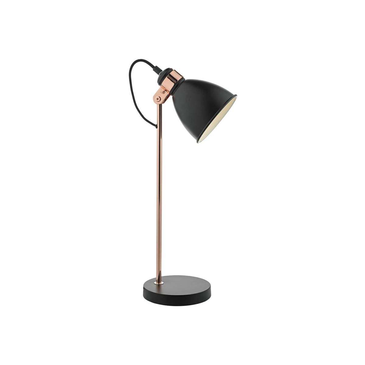 The Frederick Table Lamp is the perfect addition to any home due to its space saving design. This lamp from Dar Lighting features a black finish on the base and head of the lamp, whilst a copper finish throughout the stem completes the nordic style look. The Frederick Table Lamp is 510mm in height, 150mm in width and 210mm in length. It requires 1 x GLS ES light bulb with a maximum wattage of 40w. Dar Product Code: FRE4222 The Frederick Table Lamp is the perfect addition to any home due to its space saving design. This lamp from Dar Lighting features a black finish on the base and head of the lamp, whilst a copper finish throughout the stem completes the nordic style look. The Frederick Table Lamp is 510mm in height, 150mm in width and 210mm in length. It requires 1 x GLS ES light bulb with a maximum wattage of 40w. Dar Product Code: FRE4222