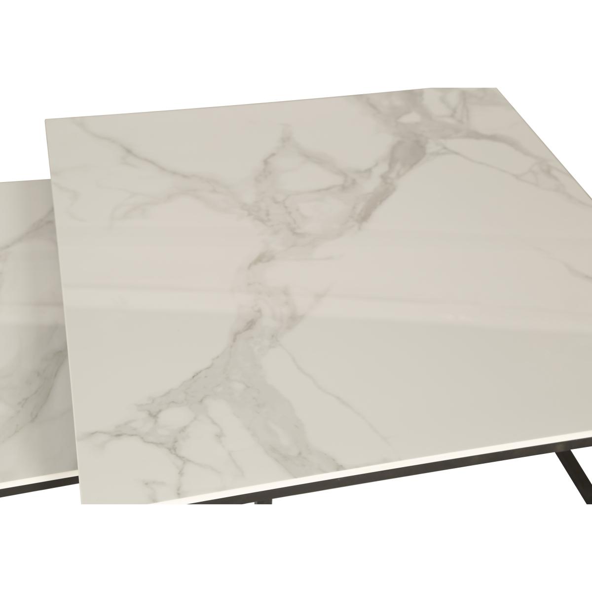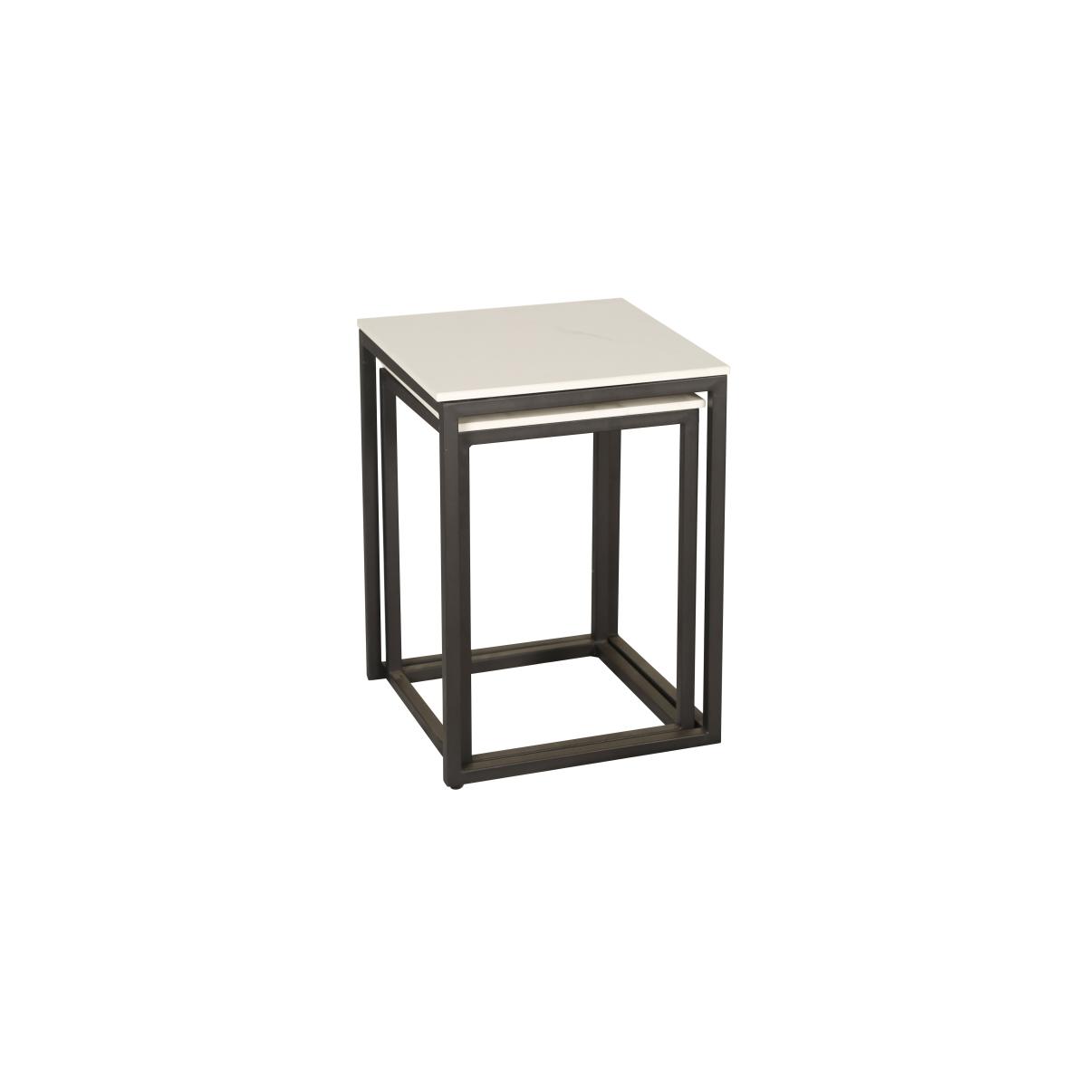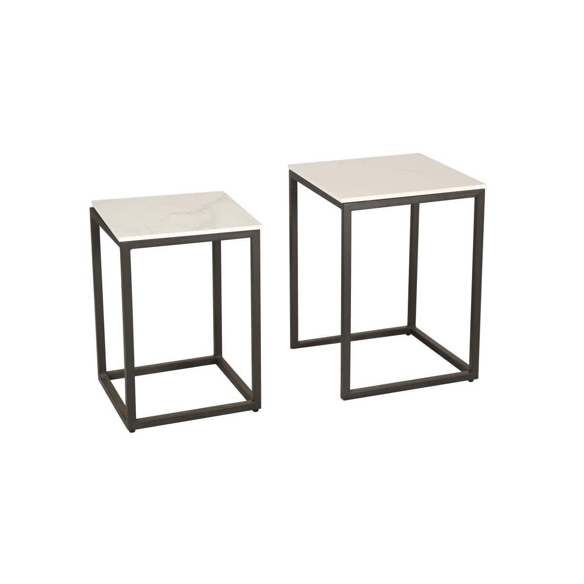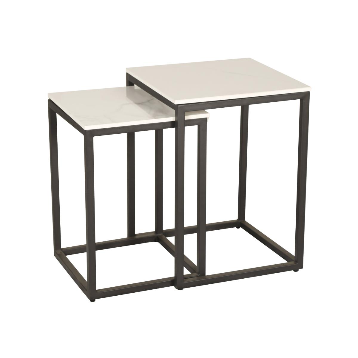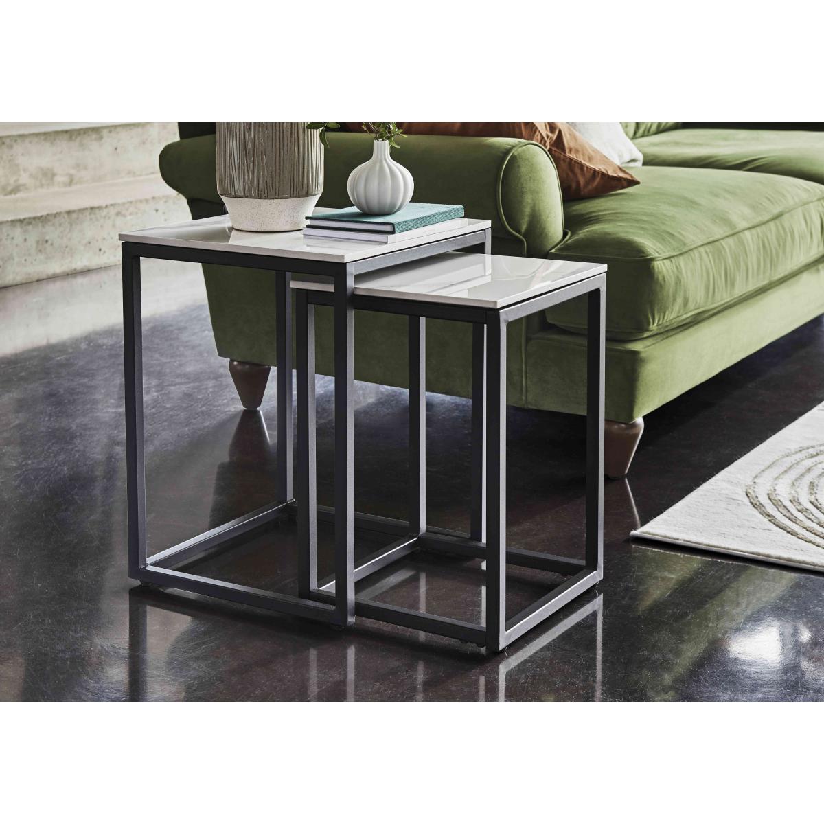 Stock code:9306AT3140. 1 Please note: this clearance item has limited stock and is subject to availability. Extra living room surface space is always handy, especially when guests drop by. This nest of two side tables serves up plenty of style as well as a place for cups of tea. Why you'll love it Stylish nest of side tables is a must-have for a compact living space. On-trend black and white look. Set of 2 square side tables with white ceramic tops. Tables have simple linear bases in black powder-coated metal. A great choice for family spaces, ceramic is heat-, scratch- and chip-resistant. This great-value nest of side tables is part of the Fredo range. What you need to know Ceramic tops, metal frames. Although very durable, ceramic is not 100% heatproof. Ceramic tops may vary in colour, tone and finish to the images shown. We recommend the use of coasters and placemats. Wipe clean with a soft, slightly damp cloth.
