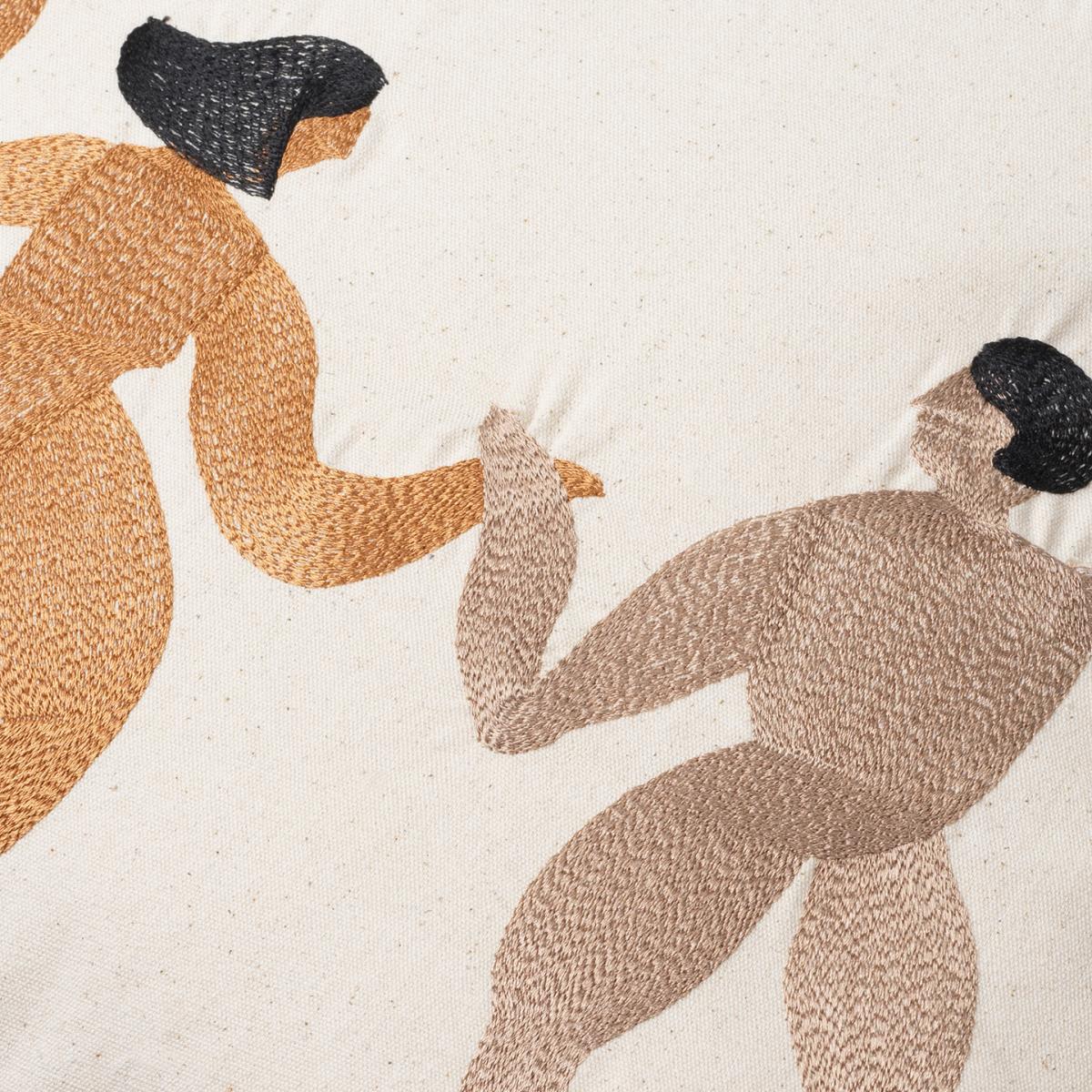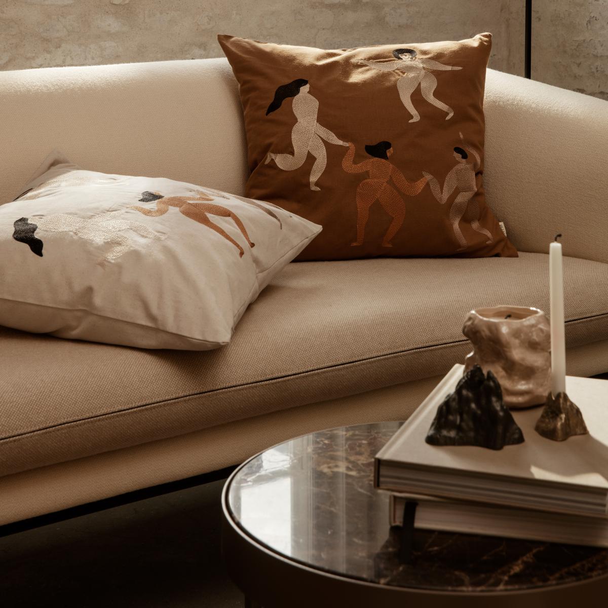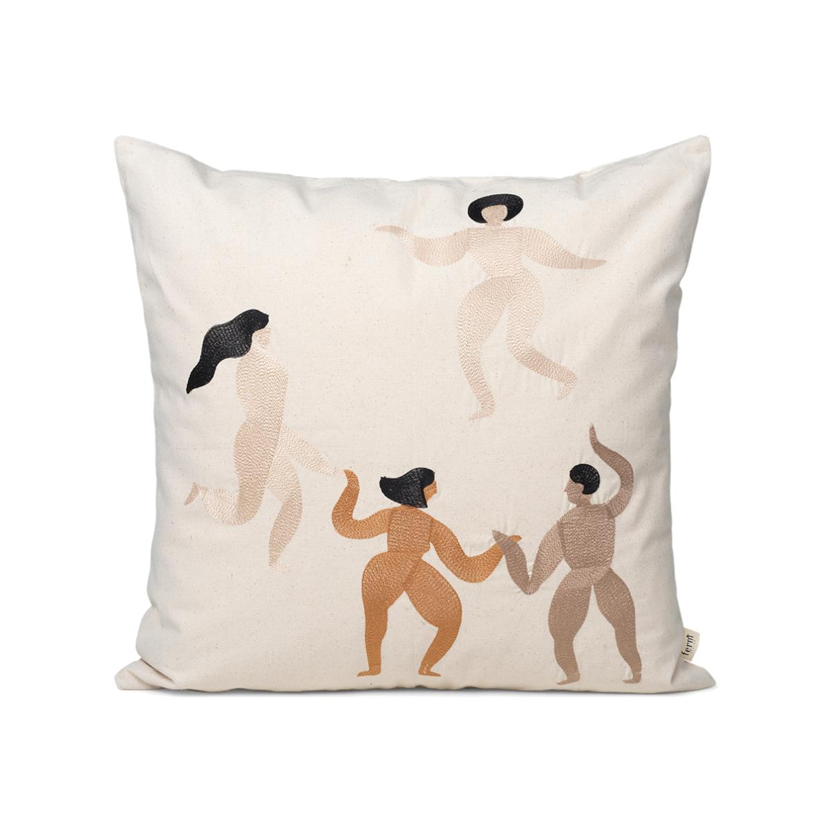 Free cushion 50x50 cm from Ferm Living has a jolly motif with dancing people, embroidered with luxurious silk thread. Bring the sofa to life with this dancing motif and add other cushions that complement the colours of the embroidery to create a harmonious whole.