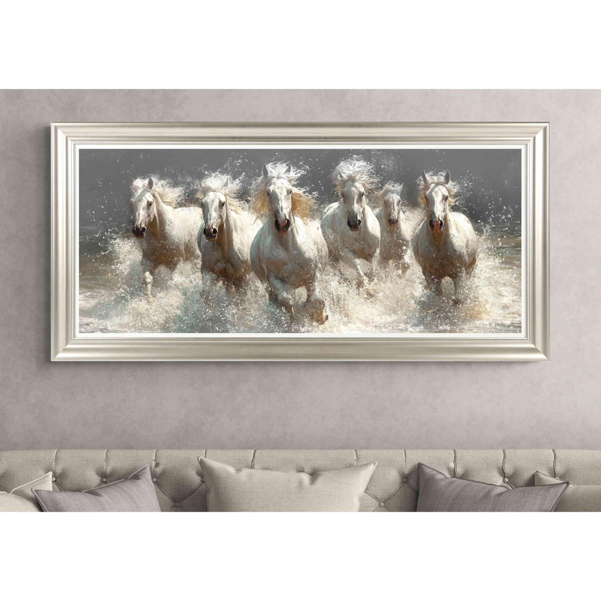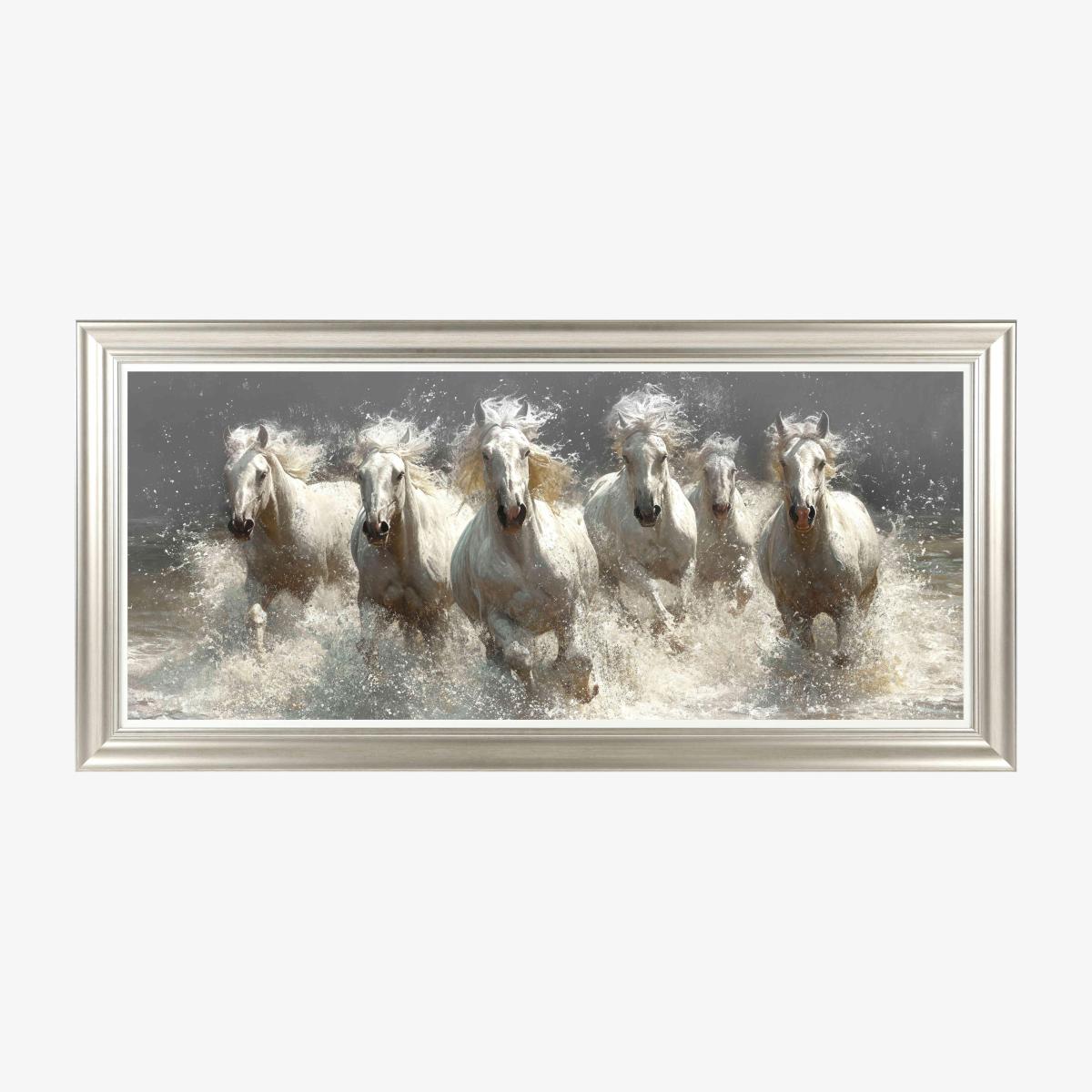 Our Free Spirit framed art is a dynamic piece that depicts the wild horses found in the Camargue area of southern France. A stunning work for any horse lover. Why you'll love it A beautiful piece of framed art that captures the spirit of wild horses. Hand-finished with acrylic paint for an authentic textured finish. A gold-toned glitter resin embellishment accentuates the splashing waves. Presented in an ornate silver-toned frame with a white accent border. A dynamic and striking piece for a living room wall. Made in England. This framed picture is part of the Furniture Village home accessories collection. What you need to know Supplied with a metal hanging fitting and nylon cord. Indoor use only. Dimensions Height: 61 cm (25 in). Depth: 4 cm (2 in). Width: 127 cm (50 in).