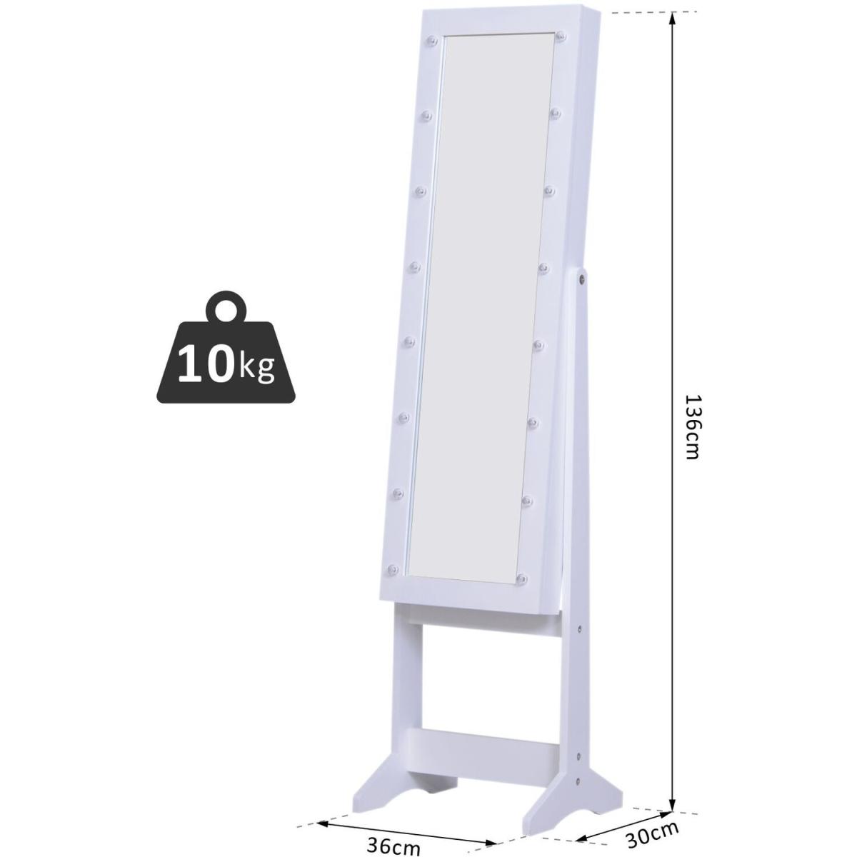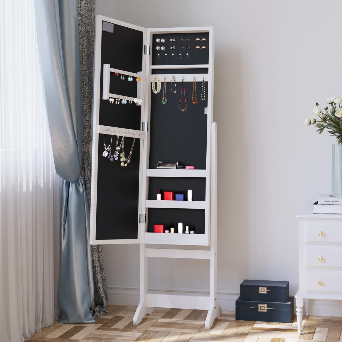 This floor standing jewellery cabinet from HOMCOM is perfect for keeping all your make-up, jewellery and other accessories together in one place. On the outside is a full-length mirror with battery-powered LED lights that create a soft and flattering glow, and on the inside is a fully-lined interior that can house up to 32 pairs of earrings, 70 rings, 12 hooks and three shelves. Made from a sturdy MDF board, the mirror can be adjusted to three different levels to suit your preferences. Clean, stylish and contemporary, this organiser is a beautiful addition to any style surrounding.
