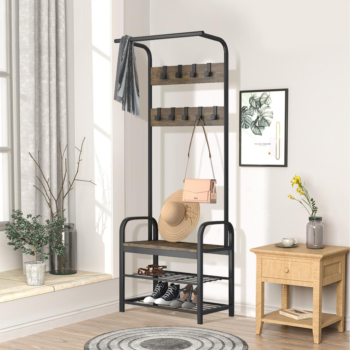 Looking for a quick and easy way to organize your clothes, shoes, and accessories? This coat rack with an integrated shoe rack is the perfect solution. The high hanging bar allows you to easily store long garments, while the hooks are perfect for hanging hats, bags, and other items. The bottom shoe rack provides convenient storage for your shoes, and the shelf on top offers additional space for storage boxes or baskets. With its sleek, curved design, this coat rack combines style with practicality, offering multiple storage functions to make your daily routine more efficient and your home more organised.