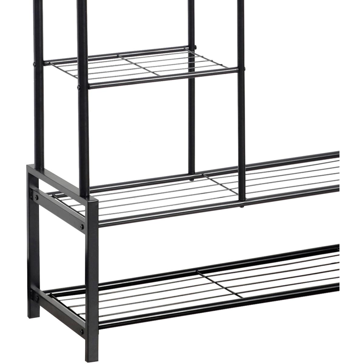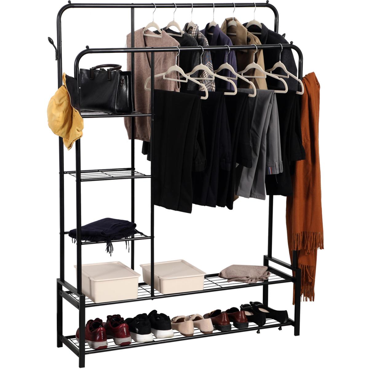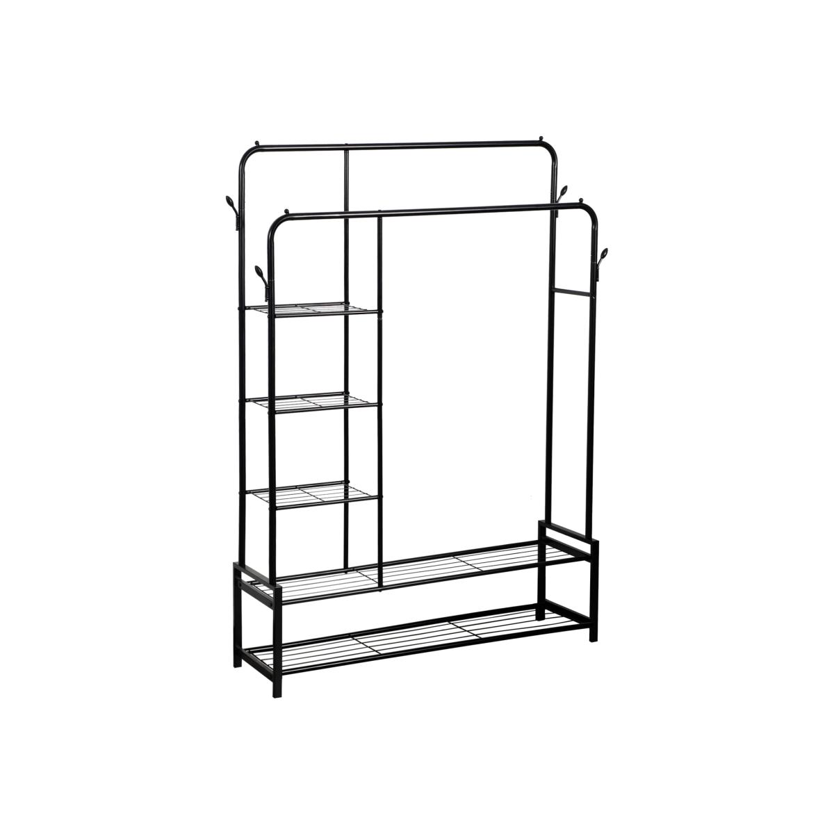 The double clothes rail features 2 shoe rack shelves and 3 additional shelves for clothing. This clothing rail also features 4 additional side hooks for hanging jackets or robes.