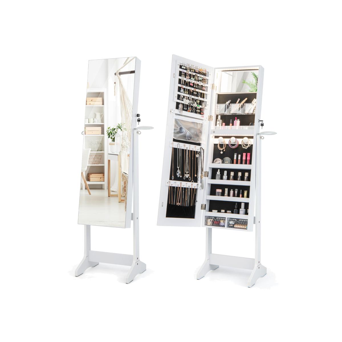 Our jewelry cabinet features a full length mirror and a built-in mirror, which is convenient for checking outfits, dressing up and making up. Also, the auto on LED lights have 3 color temperatures for you to choose, meeting your light requirement of different makeups. In addition, our jewelry cabinet armoire is built with a hairdryer mount to save your time and effort during dressing up. Coming with 2 keys, you can lock the cabinet door to keep your jewelry and cosmetics away from kids or pets. The large inside space is divided into lots of storage partitions, which helps you organize everything well. The high quality MDF construction is not easy to deform while wide feet ensure reliable stability. Following included instructions, the assembly is easy.