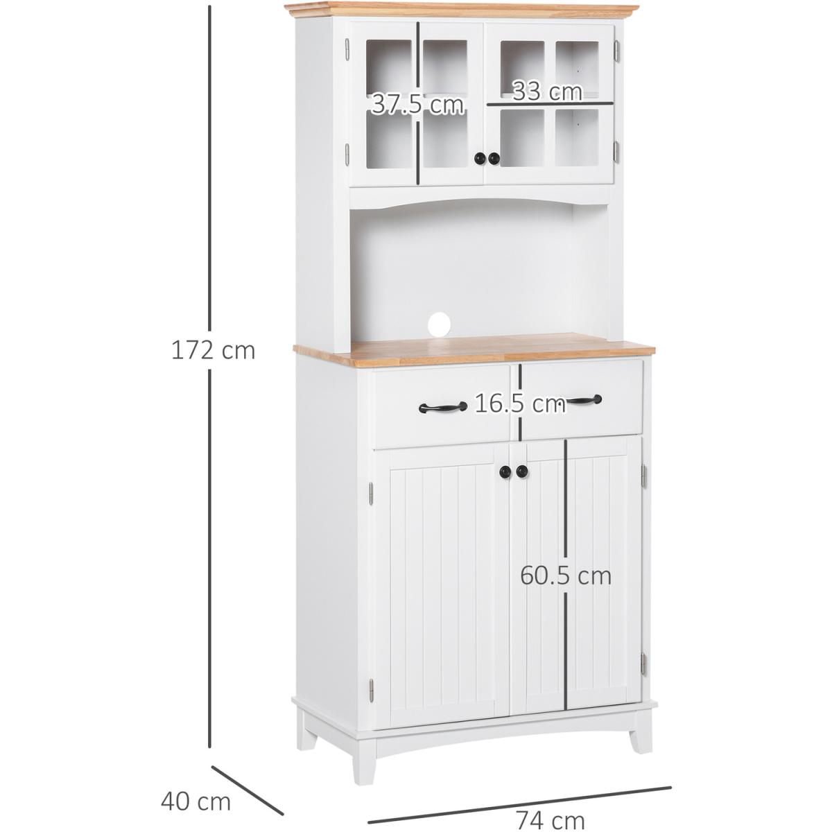 Organize your kitchenware and add more storage space with HOMCOM storage cabinets with doors and shelves. You can use the upper framed glass door cabinet to store plates or display your collections. And the lower cabinet for bigger items such as coffee machine, toaster and wines. Middle drawers can be used to put forks, knives and napkins. And the rubber wood table top offers you a spacious area to place your microwave oven, coffee machine with cable management system.