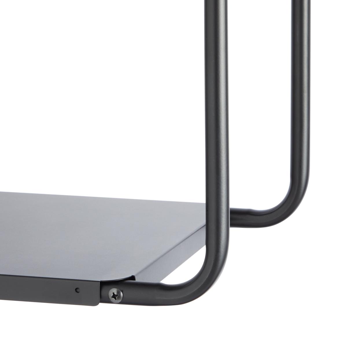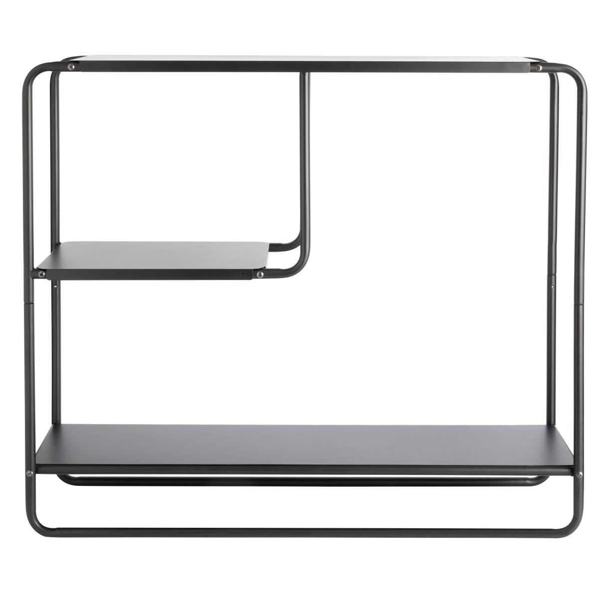 I love this black freestanding shelf because of its sleek, minimalist design that can easily fit into a variety of interiors. It’s particularly versatile in modern or industrial spaces, but can also add a contemporary touch to more traditional schemes. Practical styling tips include using it to display a mix of decorative objects, plants, and books to create visual interest, while keeping the shelves uncluttered for a fresh look. It works well as a statement piece in an entryway or living room, providing both function and style without overwhelming the space. Its understated aesthetic allows for flexible styling, making it an adaptable addition to many different interiors.