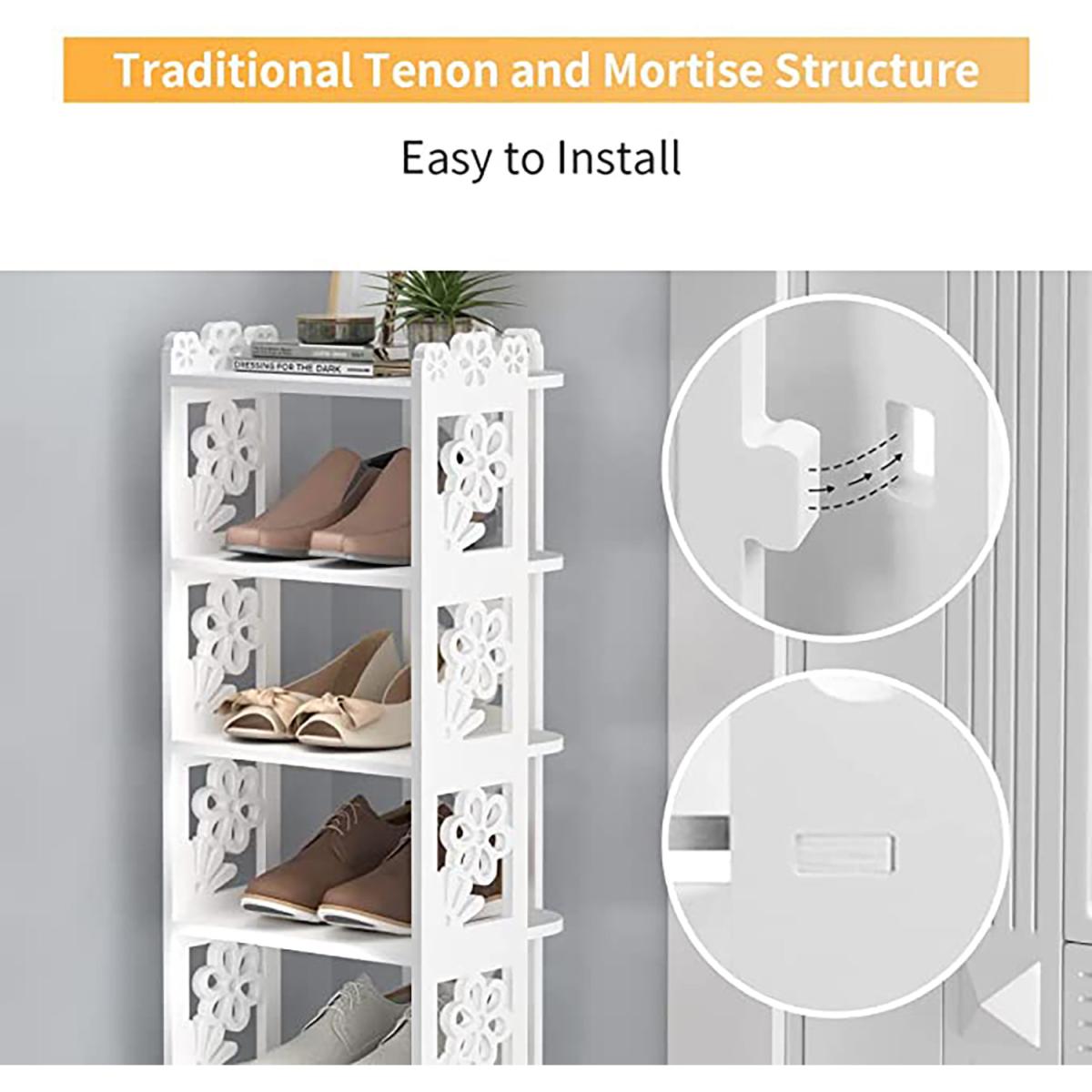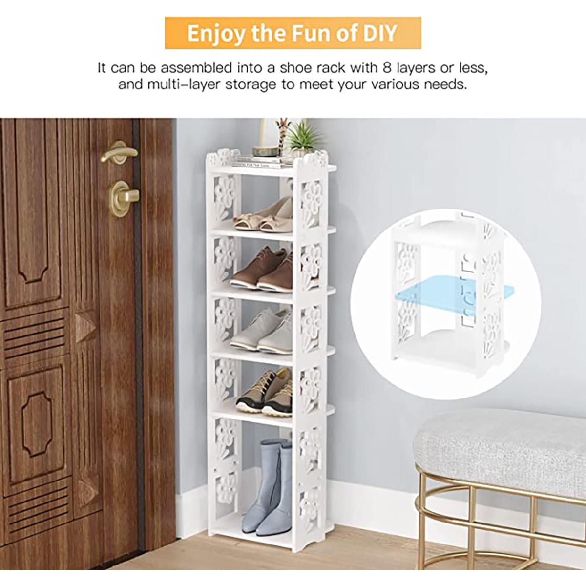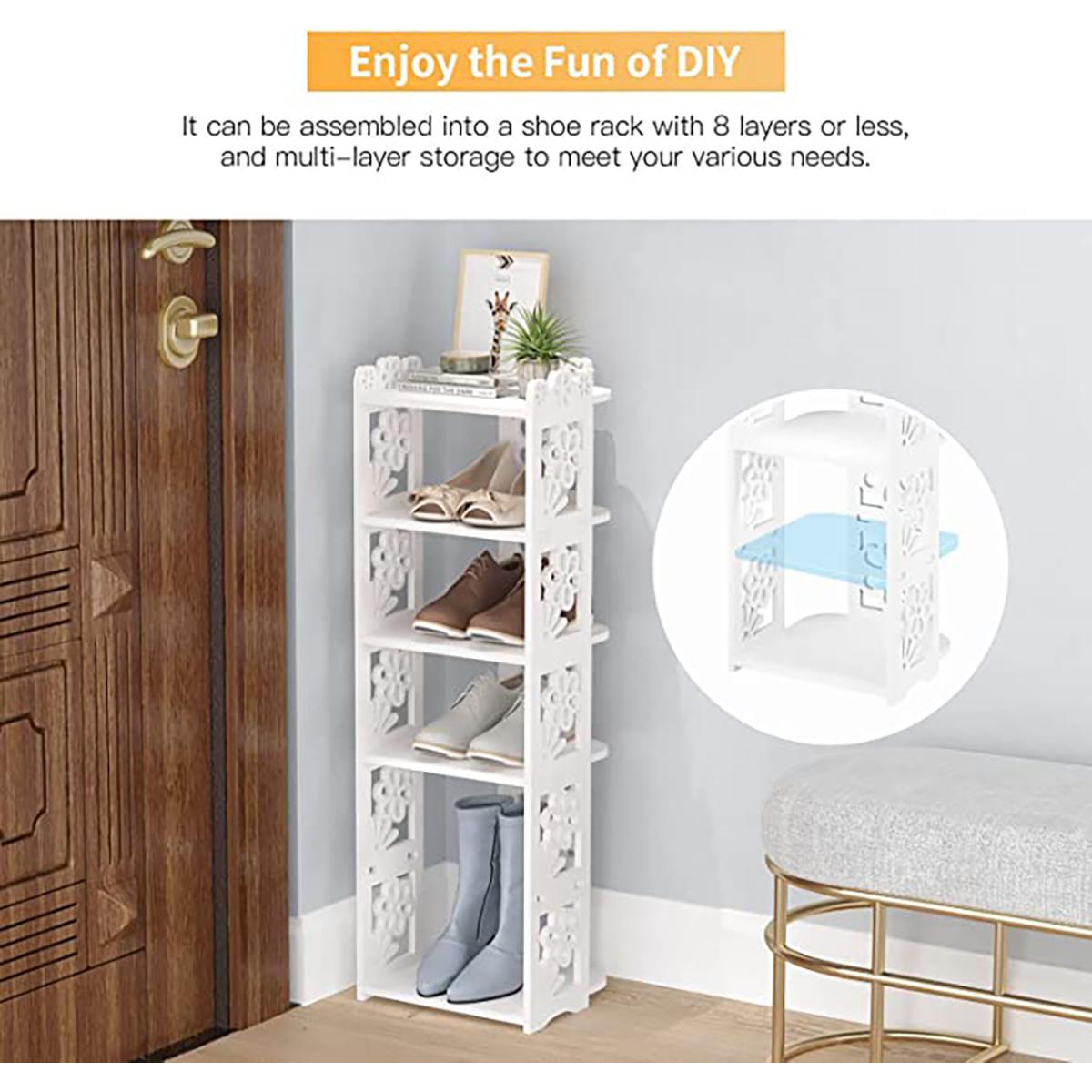Our shoe rack is made of PVC wood plastic composite which is a new eco-friendly material for furniture use. A strong and durable, smooth surface can be cleaned with a damp cloth. Small enough to be used in your hallway, living room, corner, or any other place you want. Designed into multiple storage spaces, it is also easy for you to classify different types of shoes, keep your shoes neat and orderly, and make the most of your living space. It is suitable as a shoe rack, display stand, plant rack, or mini bookcase for storing toys, books, or other small things in life. The top layer is the design of a storage desk, equipped with a border, which can facilitate the placement of keys, bags, umbrellas, etc. Easy to assemble and disassemble with a simple structure. You can assemble this shoe rack effortlessly even if you don't have great DIY skills.
