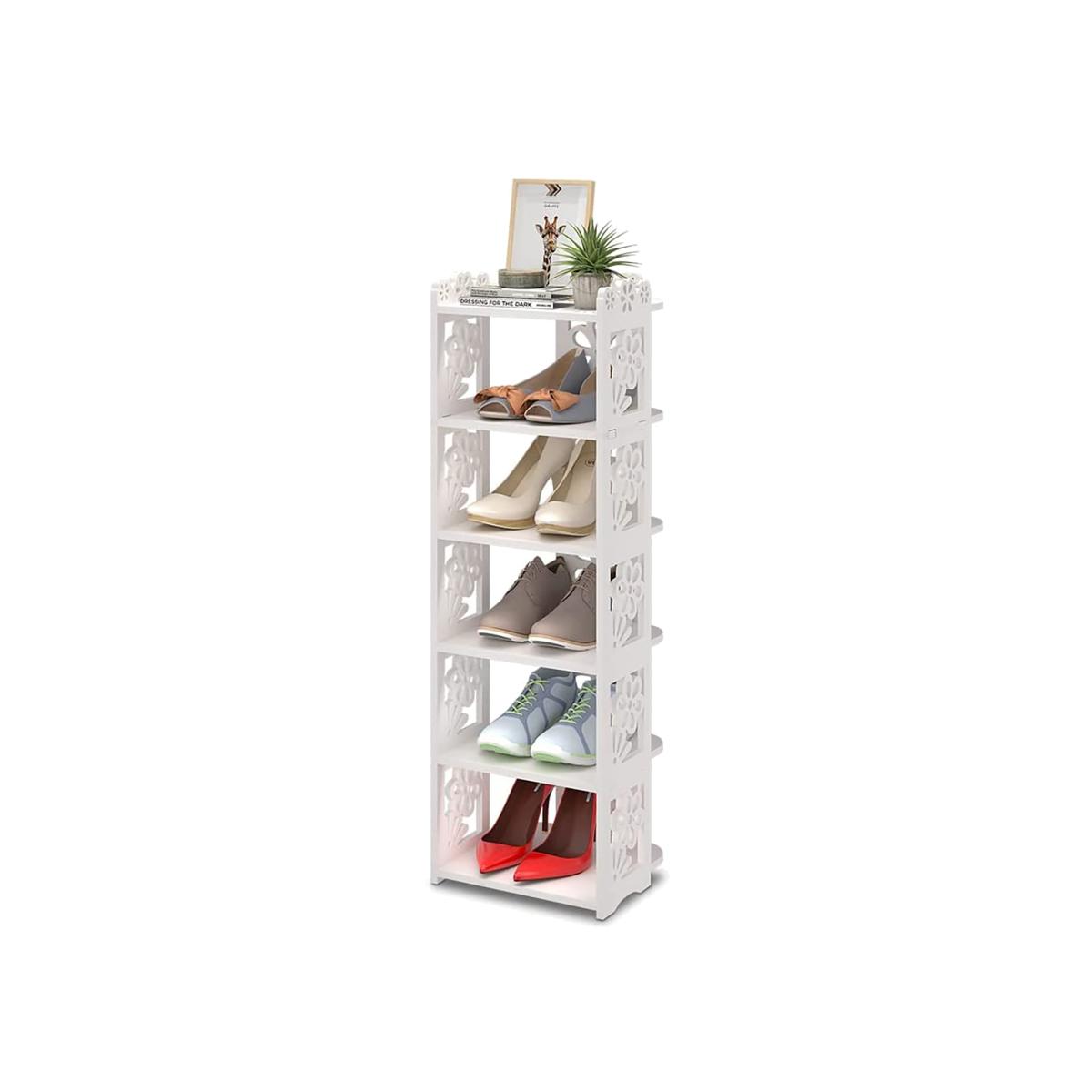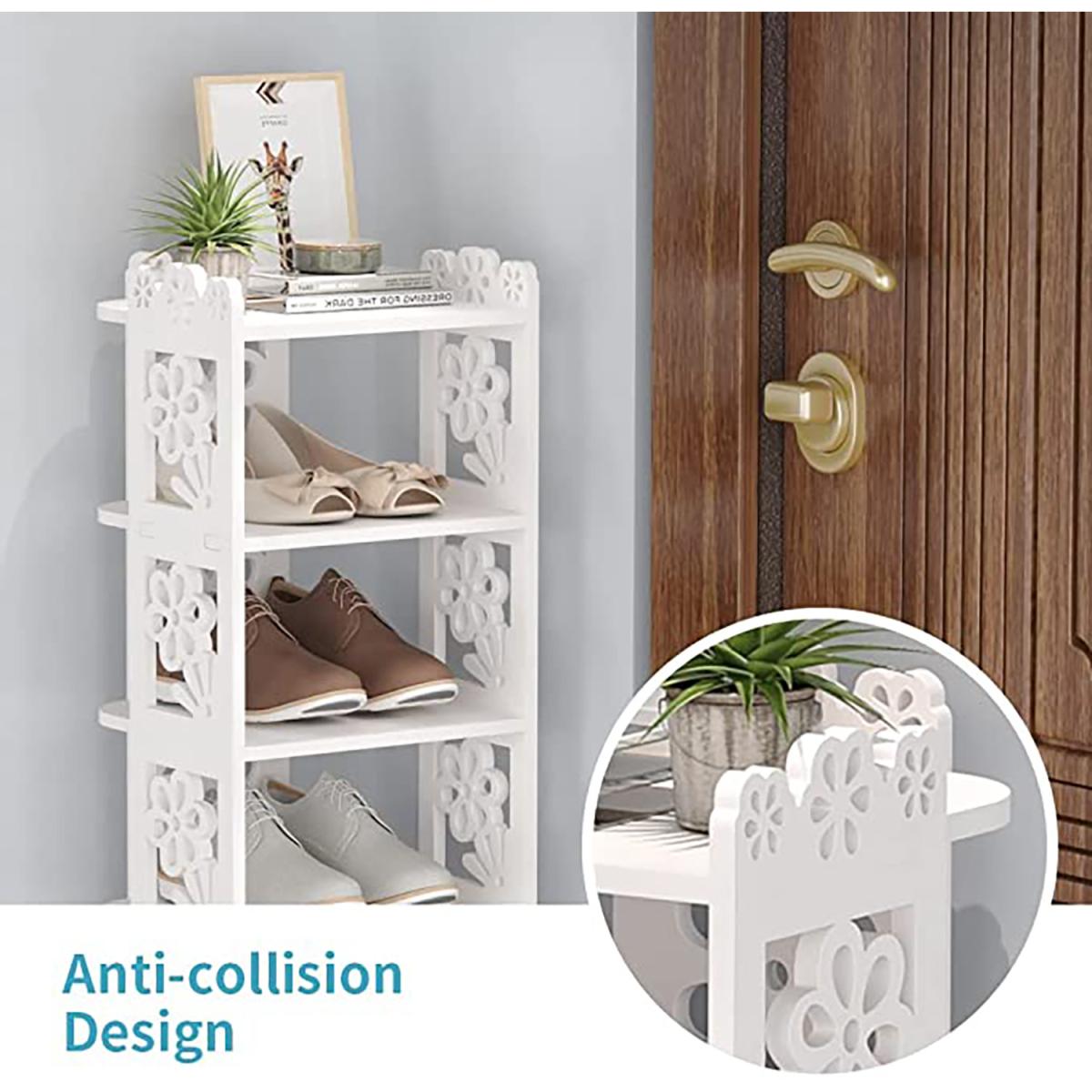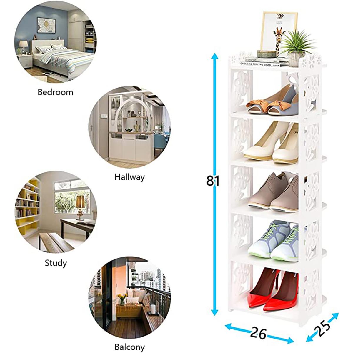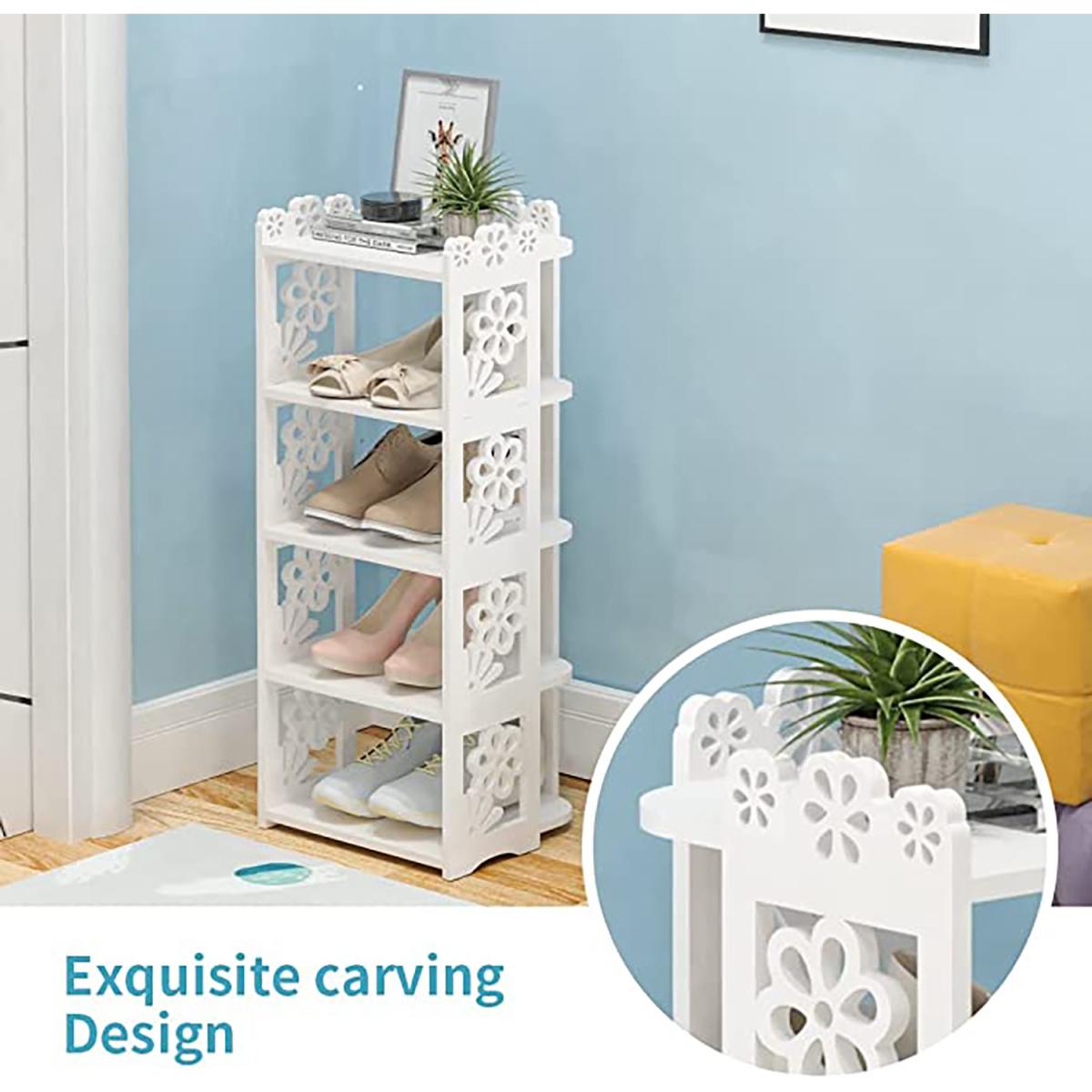Our shoe rack is made of PVC wood plastic composite which is a new eco-friendly material for furniture use. A strong and durable, smooth surface can be cleaned with a damp cloth. Small enough to be used in your hallway, living room, corner, or any other place you want. Designed into multiple storage spaces, it is also easy for you to classify different types of shoes, keep your shoes neat and orderly, and make the most of your living space. It is suitable as a shoe rack, display stand, plant rack, or mini bookcase for storing toys, books, or other small things in life. The top layer is the design of a storage desk, equipped with a border, which can facilitate the placement of keys, bags, umbrellas, etc. Easy to assemble and disassemble with a simple structure. You can assemble this shoe rack effortlessly even if you don't have great DIY skills.
