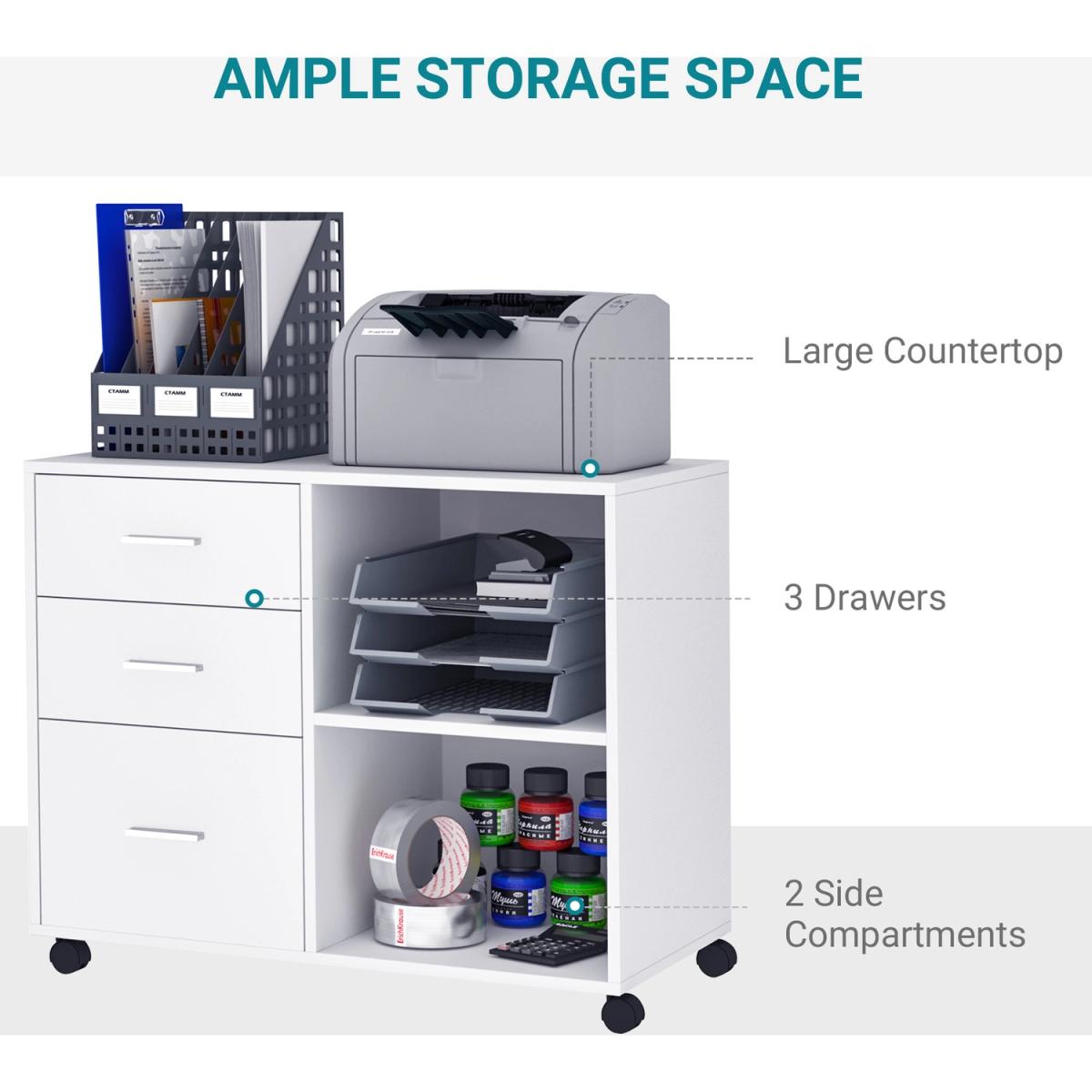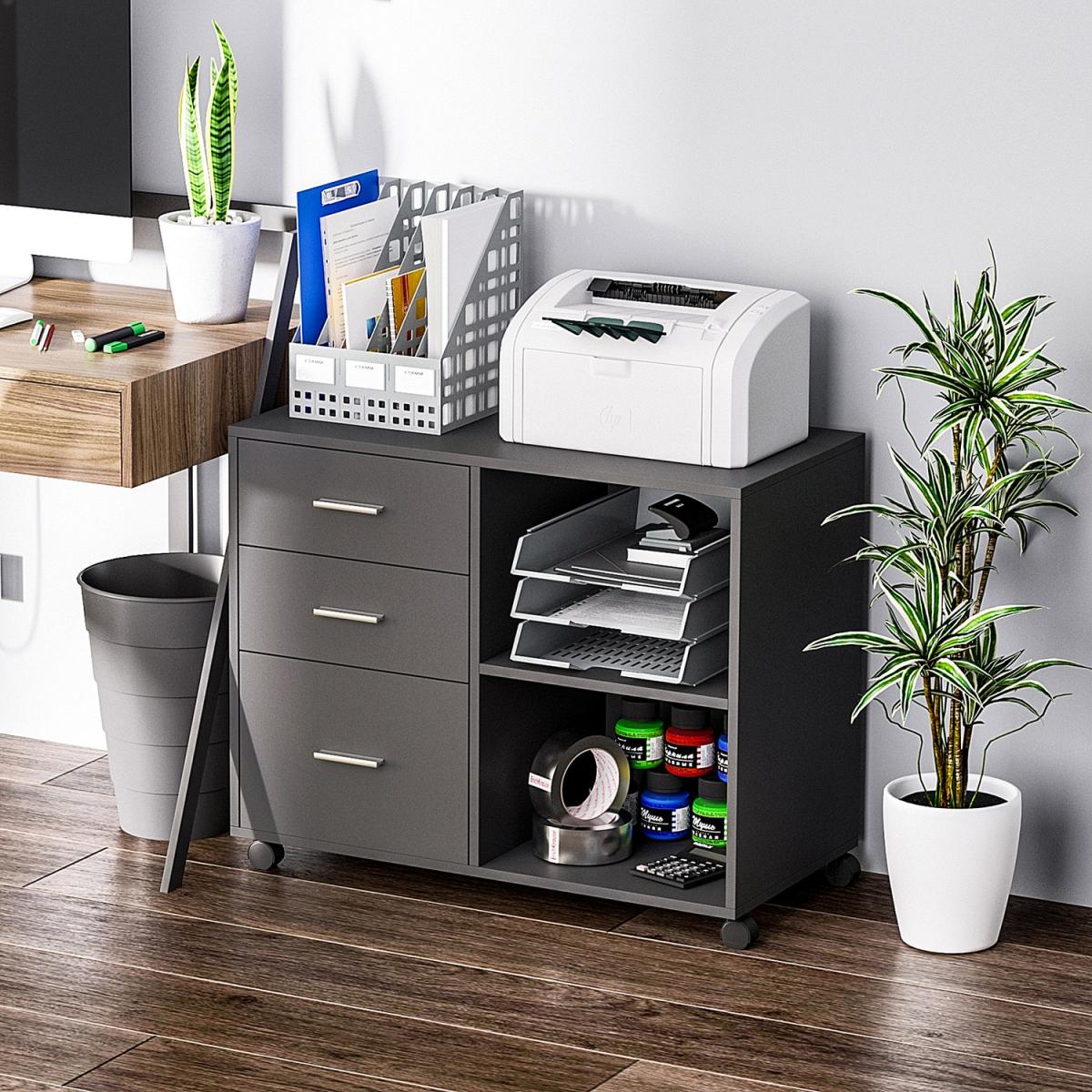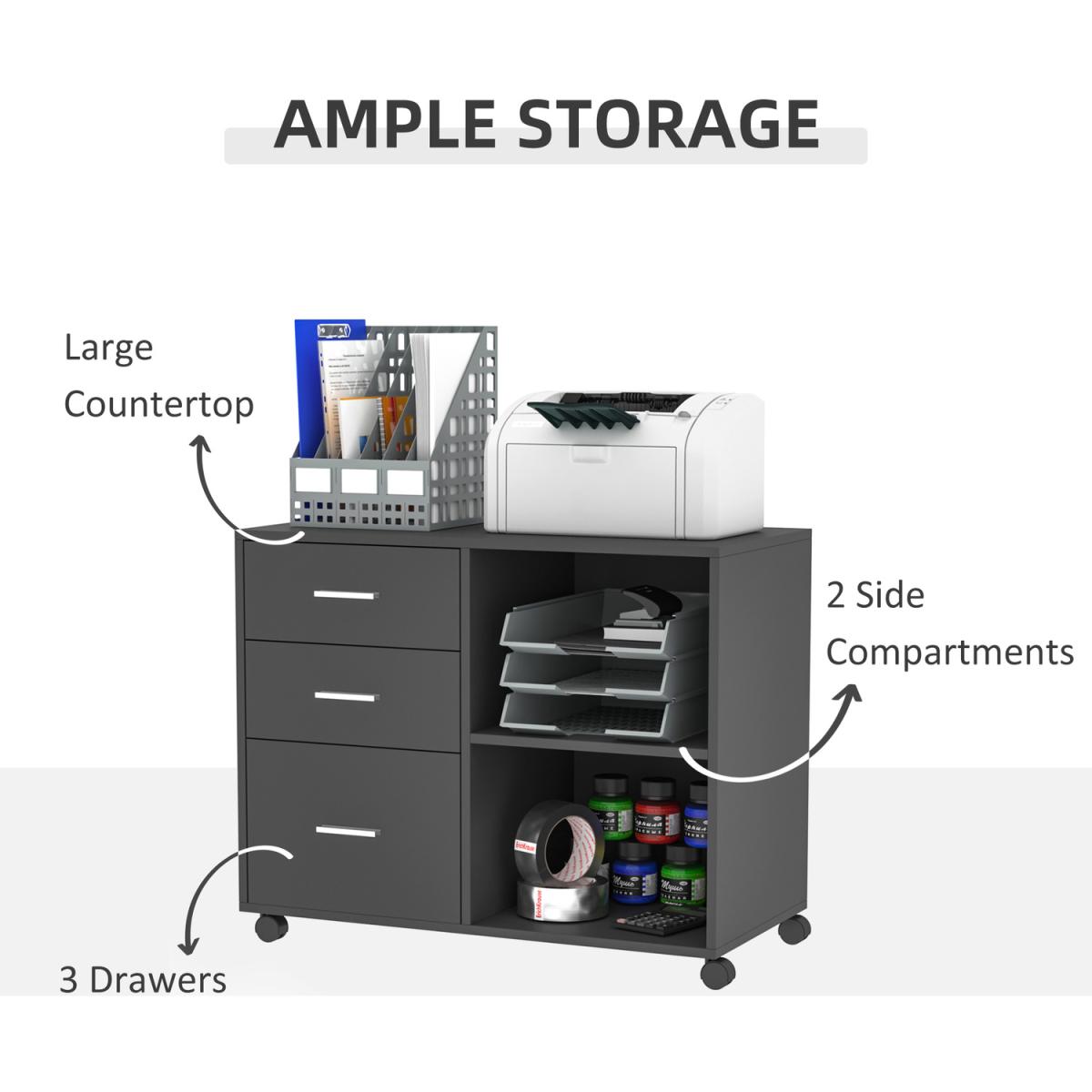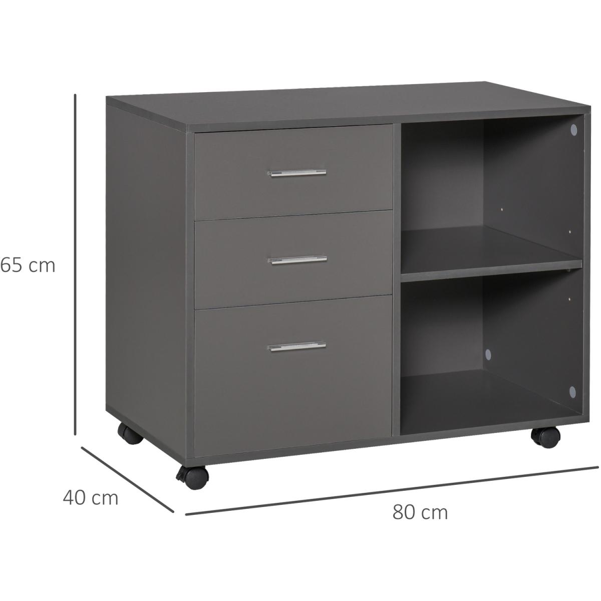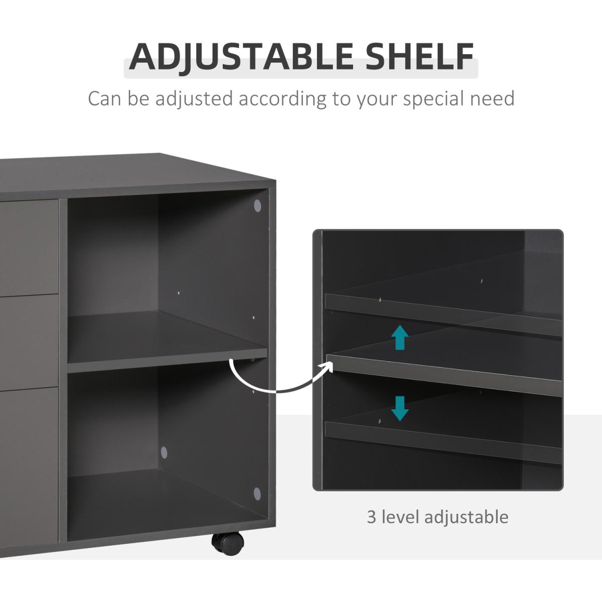 Give your office style and storage all at once with this cabinet from HOMCOM. It features two open compartments and three drawers giving you plenty of space to keep files, folders and stationery organised. The shelf on the right can be adjusted to suit your needs. Four caster wheels ensure easy movement, with two lockable to keep stationary. It's made from particleboard, ensuring it is tough and durable for everyday use, in black colour for a sleek addition that sits well placed anywhere.