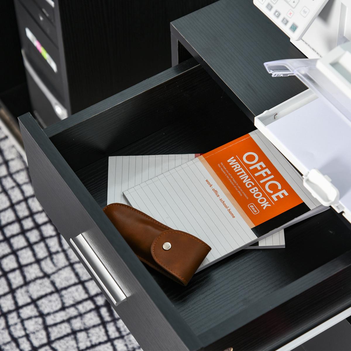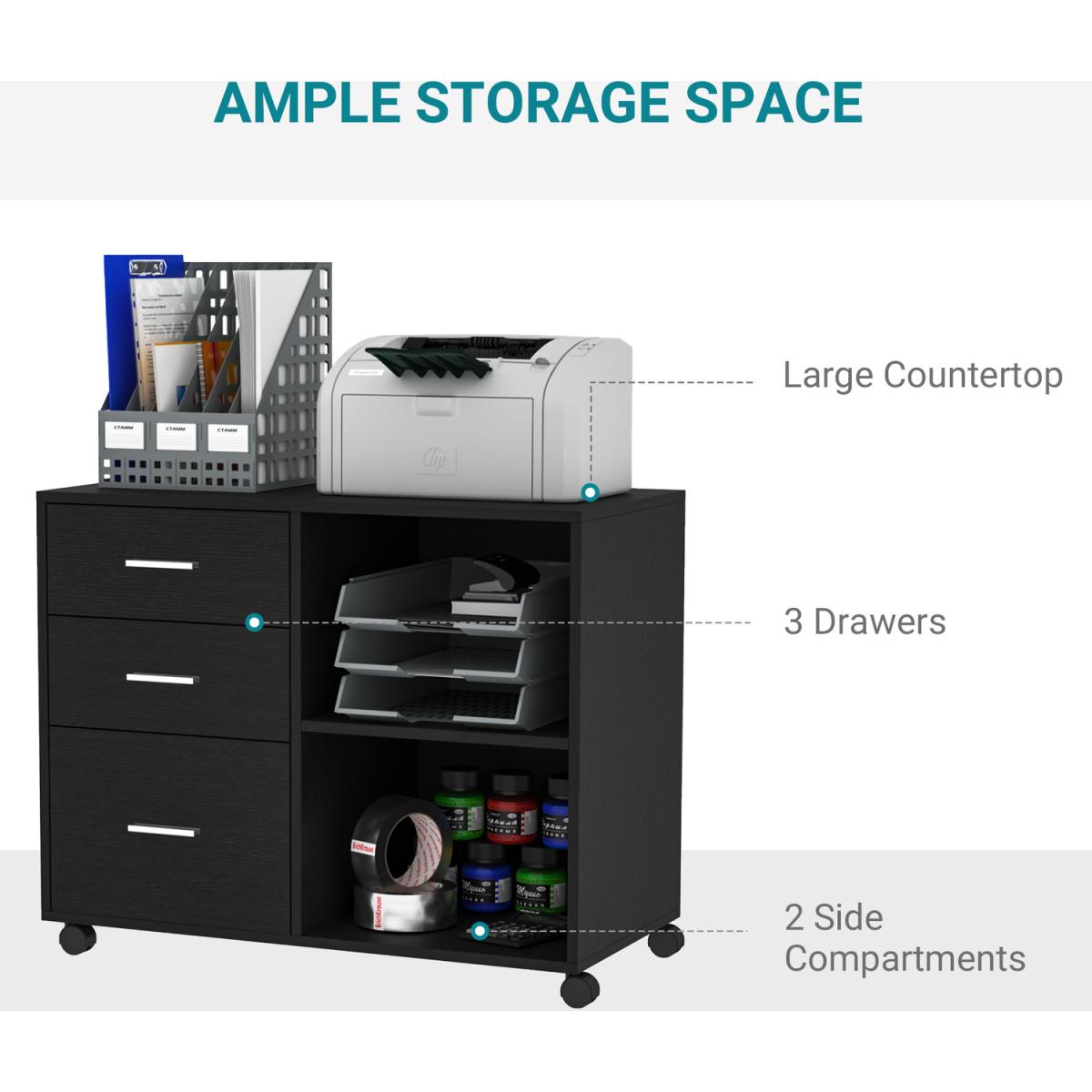 Give your office style and storage all at once with this cabinet from HOMCOM. It features two open compartments and three drawers giving you plenty of space to keep files, folders and stationery organised. The shelf on the right can be adjusted to suit your needs. Four caster wheels ensure easy movement, with two lockable to keep stationary. It's made from particleboard, ensuring it is tough and durable for everyday use, in black colour for a sleek addition that sits well placed anywhere.
