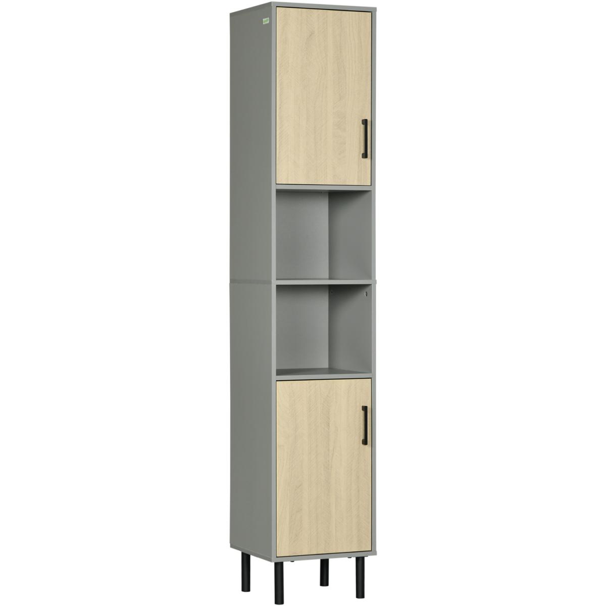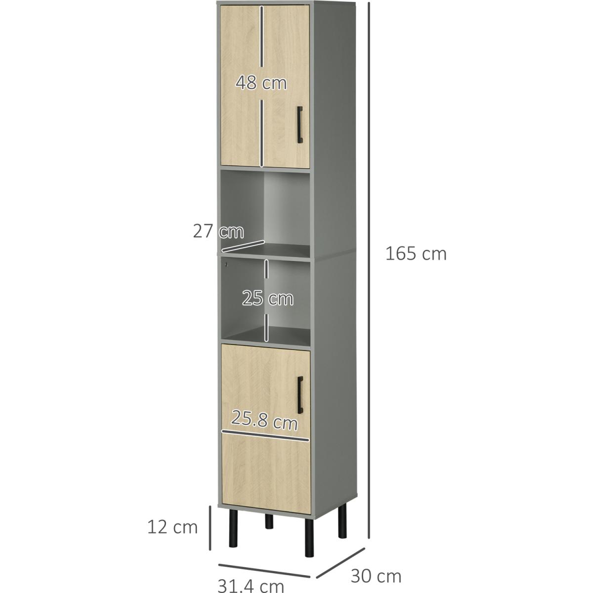 A clean-cut cabinet for a clean bathroom space this HOMCOM tallboy. A mid-grey frame, it comes with wood-effect doors for a simple Farmhouse style design. It features a top and bottom cupboard, with two middle shelves - plenty of open and closed storage. The shelves inside both cupboards can be moved and set to three different levels create a storage space size of your choice. Freestanding bathroom cabinet package comes with anti-tipping straps for safety.