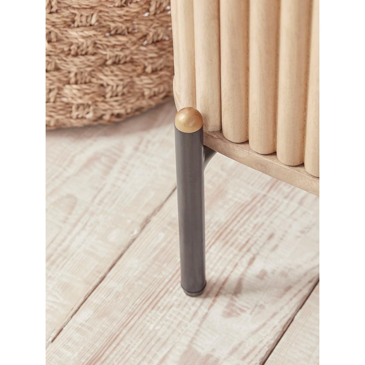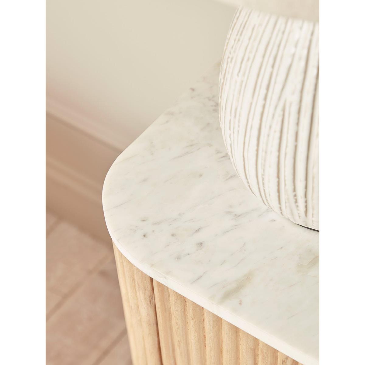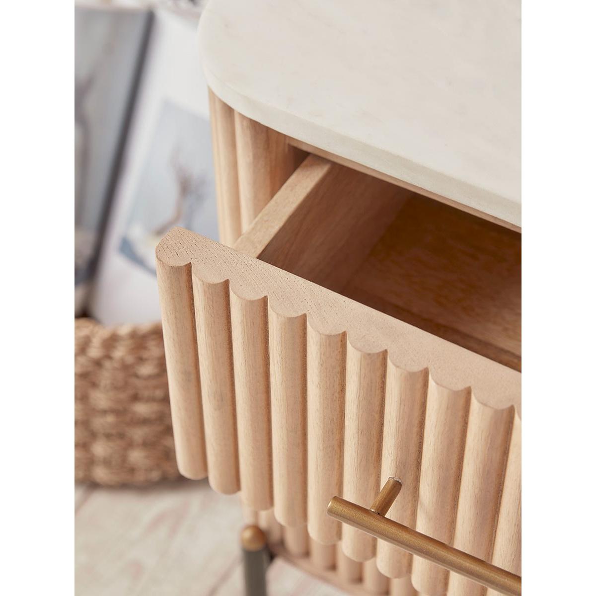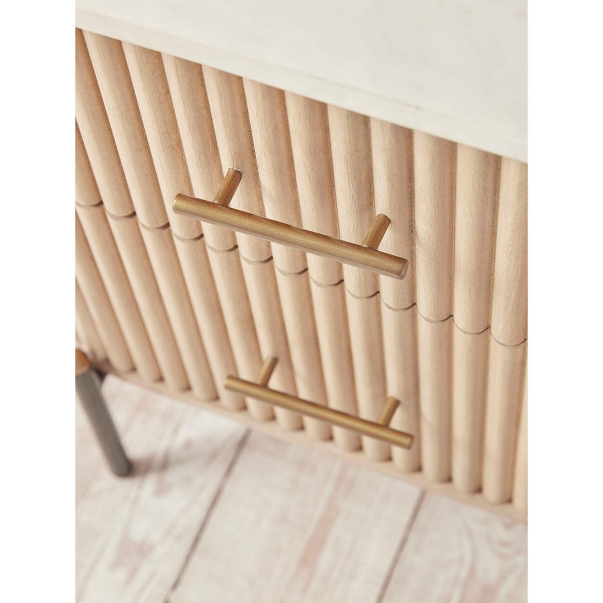 The smooth and cool white marble top of our Freja Bedside table contrasts beautifully with the rich palette of natural tones seen in the reeded wooden body and drawer fronts. Sitting on golden-capped black legs and offering lots of lovely storage space for nighttime rituals, the premium golden hardware adds to the textural luxe look. A sympathetic piece for an elegant bedroom – pair with a  table lamp or place beneath wall lights for a crisper look. Discover the complete Freja furniture collection.
