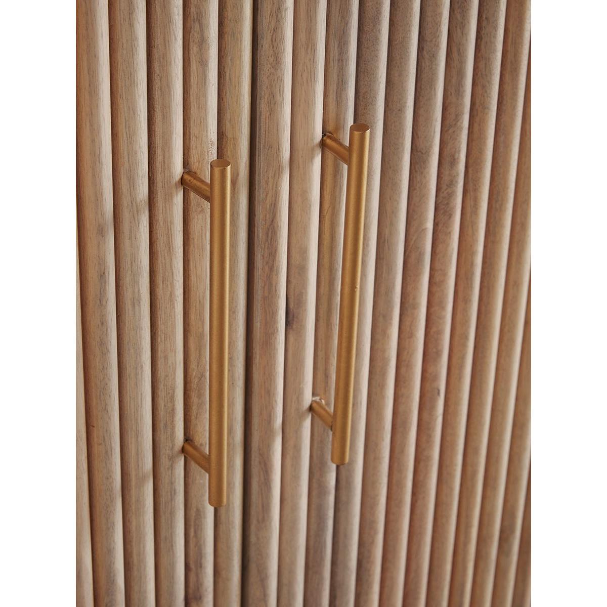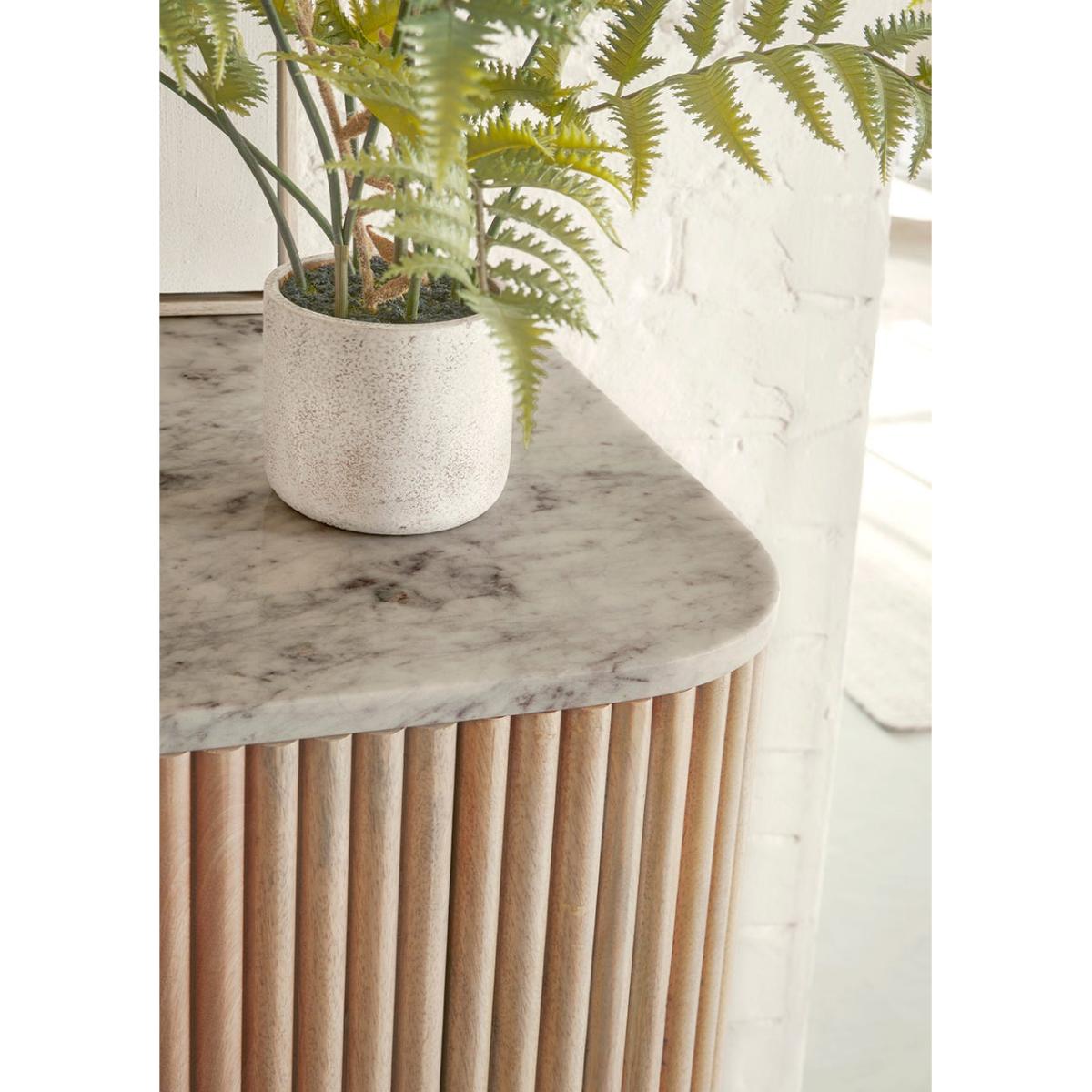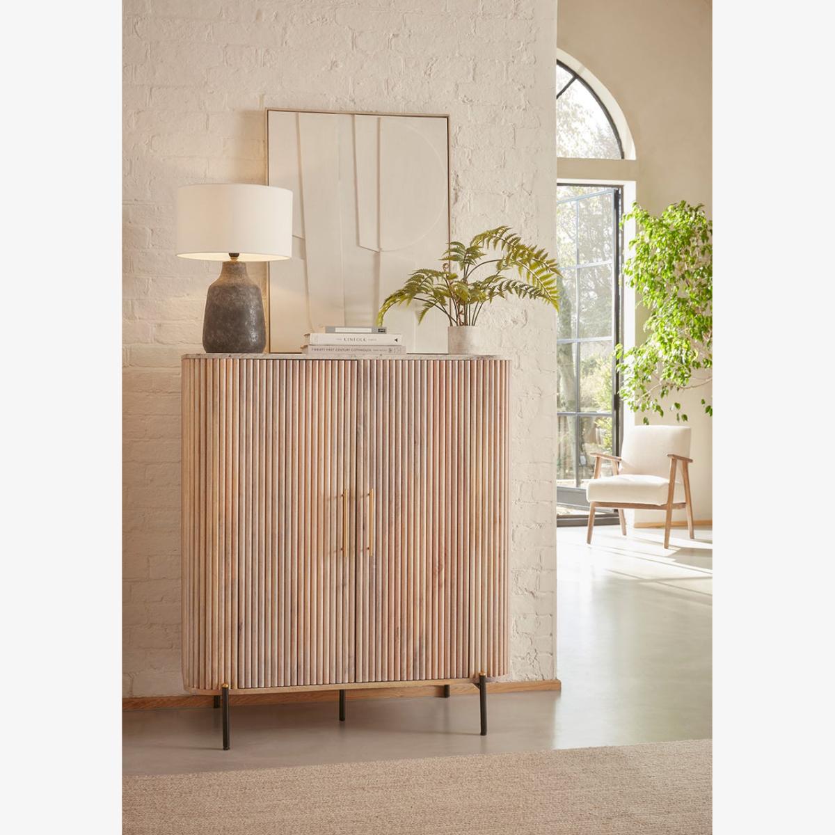 A welcome addition to our Freja range, this curvaceous cabinet offers a versatile range of uses, from cocktail cabinet to crockery storage. As with the other pieces in the range, this tall cabinet has a smooth white marble top which contrasts beautifully with the rich palette of natural tones seen in the reeded wooden body. Sitting on golden capped black legs the cabinet offers storage space over three shelves and two drawers, all concealed behind the beautifully curved doors. Premium golden hardware adds to the textural luxe look. Discover the complete Freja furniture collection.