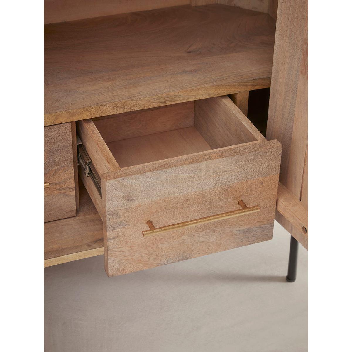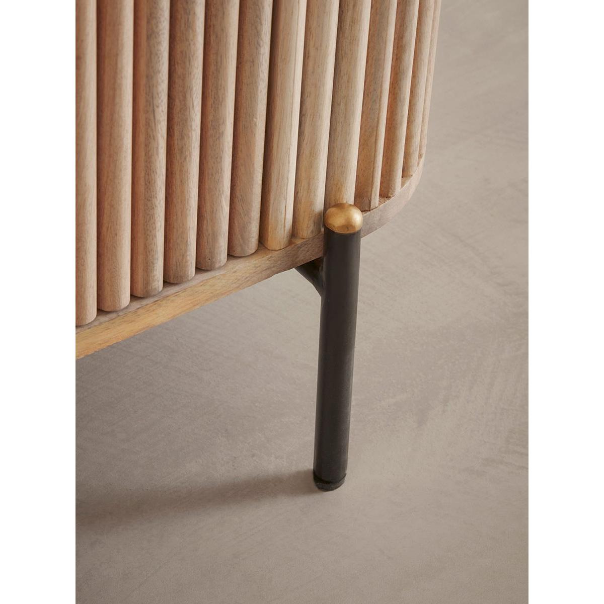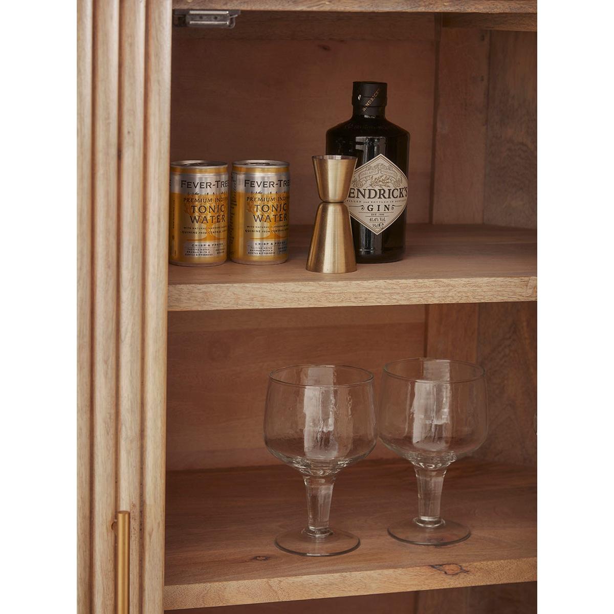 A welcome addition to our Freja range, this curvaceous cabinet offers a versatile range of uses, from cocktail cabinet to crockery storage. As with the other pieces in the range, this tall cabinet has a smooth white marble top which contrasts beautifully with the rich palette of natural tones seen in the reeded wooden body. Sitting on golden capped black legs the cabinet offers storage space over three shelves and two drawers, all concealed behind the beautifully curved doors. Premium golden hardware adds to the textural luxe look. Discover the complete Freja furniture collection.