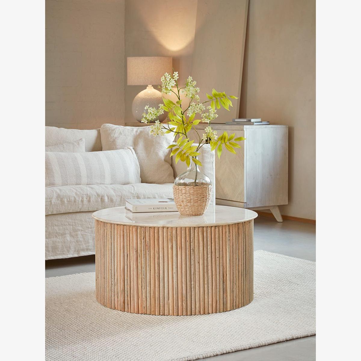 I’m a fan of this Freja table for its clean lines and mix of warm, fluted timber with a smooth, pale top - it brings just enough texture without overwhelming a space. It works equally well in Scandi-inspired living rooms, coastal retreats or laid-back boho schemes, thanks to its neutral tones and simple silhouette. For styling, keep the look uncluttered: place a low tray with a candle and a couple of coffee-table books in one corner, then balance with a small vase of fresh foliage. The rounded shape also makes it ideal for casual get-togethers - leave enough clear surface to rest drinks or breakfast bowls, and layer in a woven basket beside it for magazines or throws.