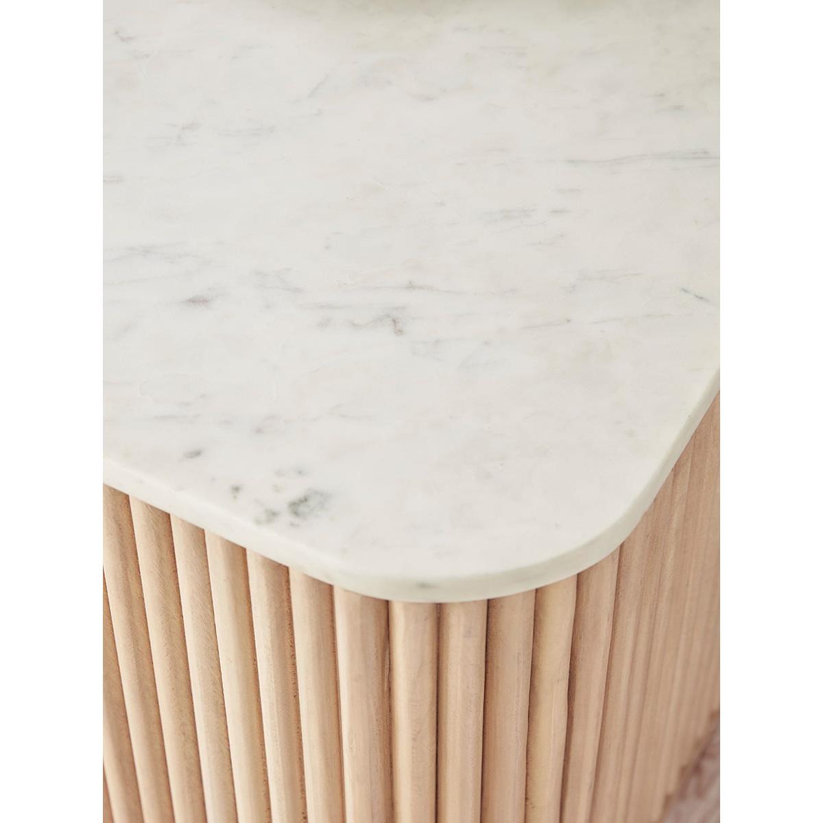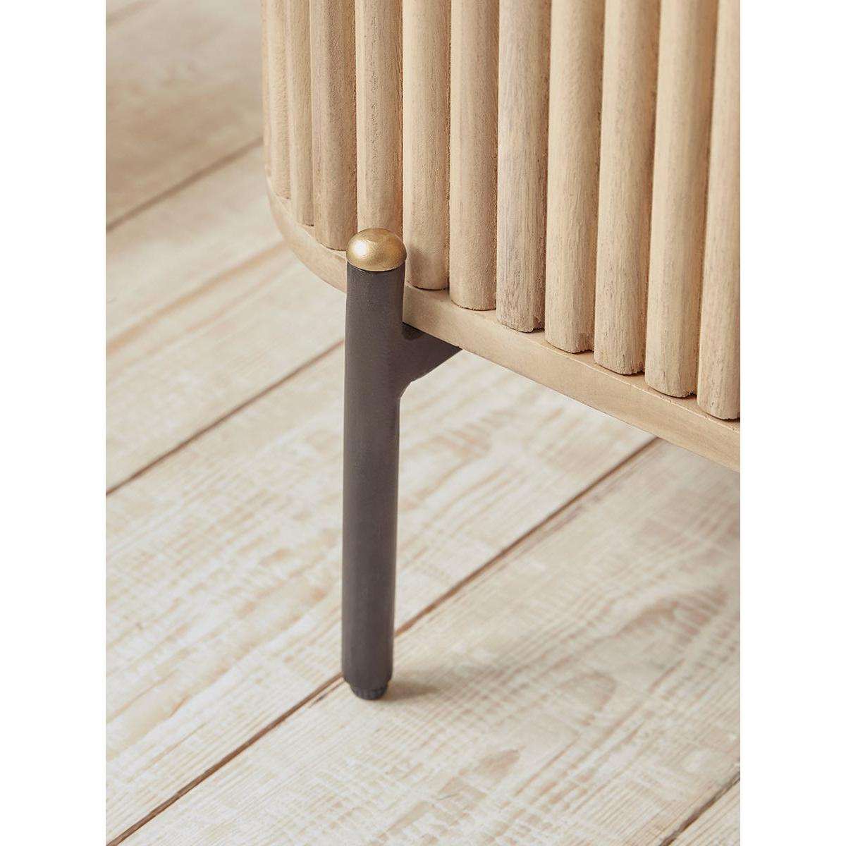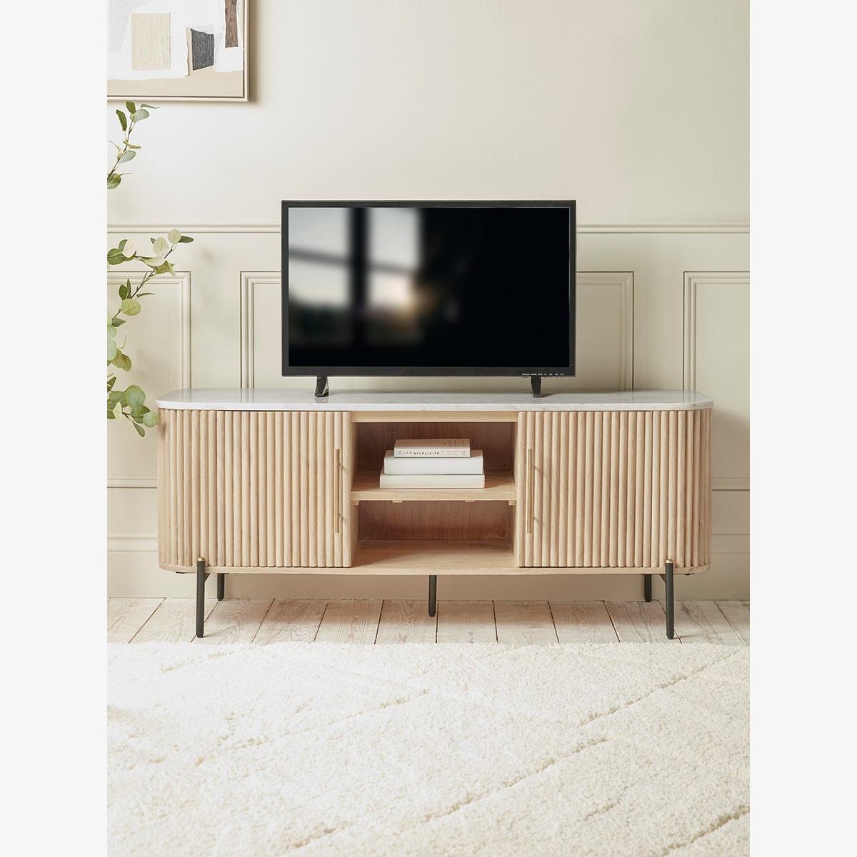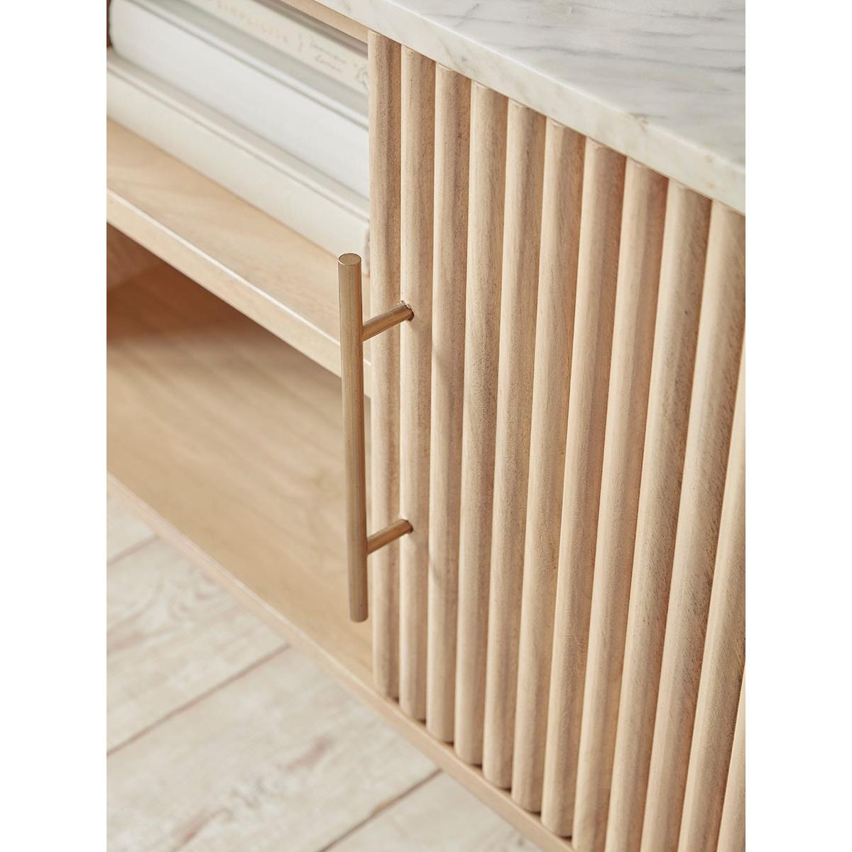 Whether placed as a standalone piece or with other items from our Freja furniture range, this media unit will offer some quiet glamour to your home. The cool white marble top contrasts beautifully with the rich palette of natural tones seen in the curvaceous lines of the reeded wooden body.  Two reeded fronted cupboards bookend the central alcove with a shelf. The whole unit sits on slender matte black legs with domed golden caps which echo the simple bar cupboard handles. Discover the complete Freja furniture collection.