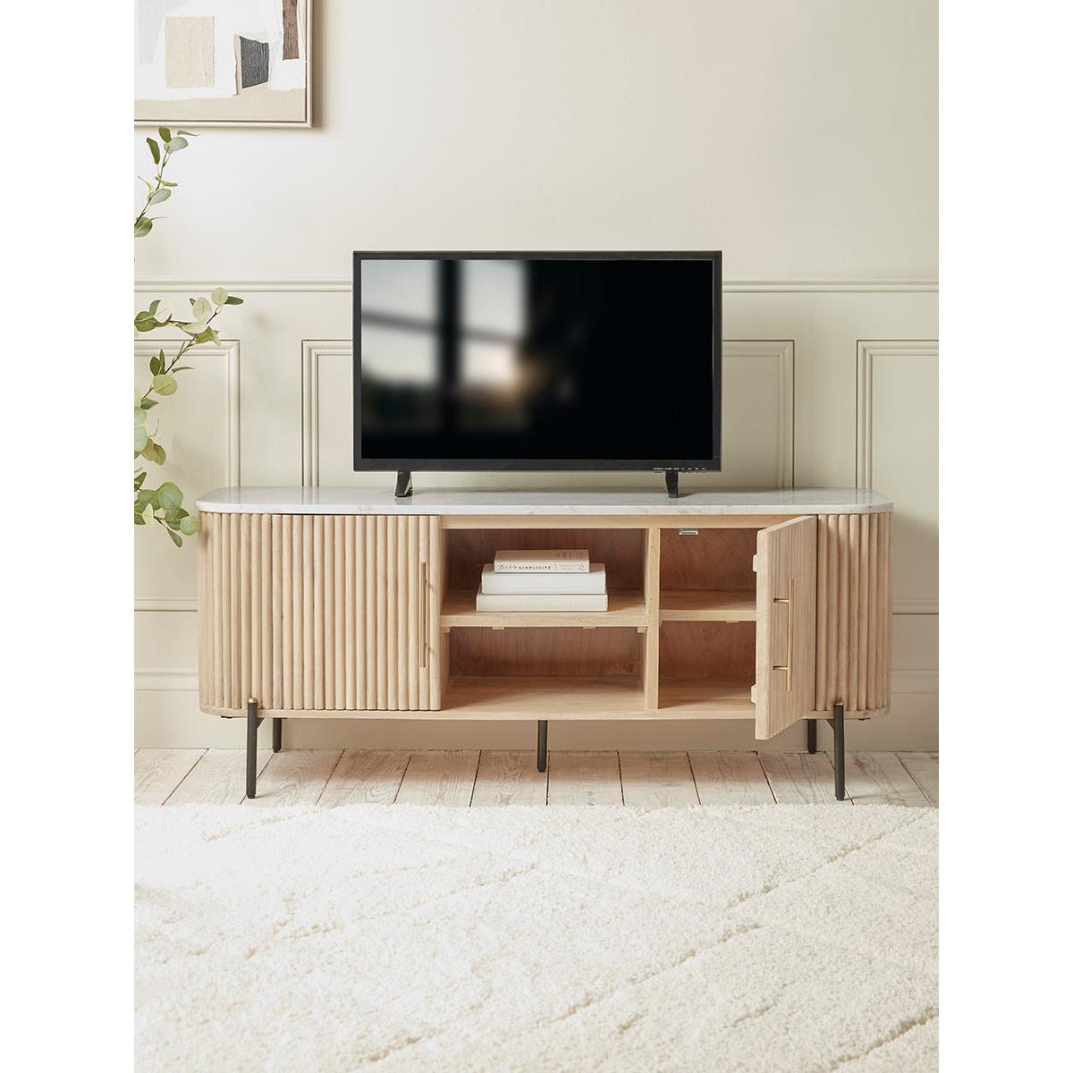 I’m a big fan of this Freja unit for its clean lines and subtle fluting, which add texture without overwhelming the space. Its pale timber finish and slender metal legs make it versatile in Scandi-inspired, contemporary or coastal interiors, while the central shelf is perfect for stacking a few coffee-table books or a slim soundbar. When styling, keep the top uncluttered - a low vase of foliage on one side and a framed print or speaker on the other will balance the look. Use woven baskets or boxes behind the doors to hide remotes, cables and games, and position a cosy rug in front to tie the room together.