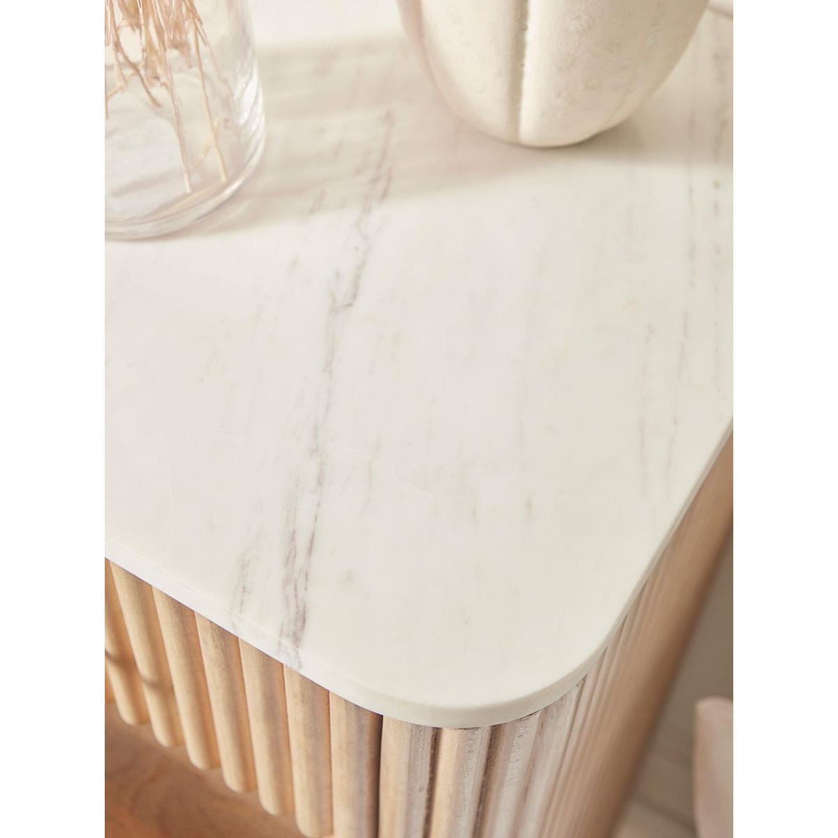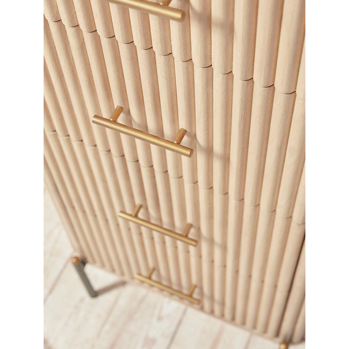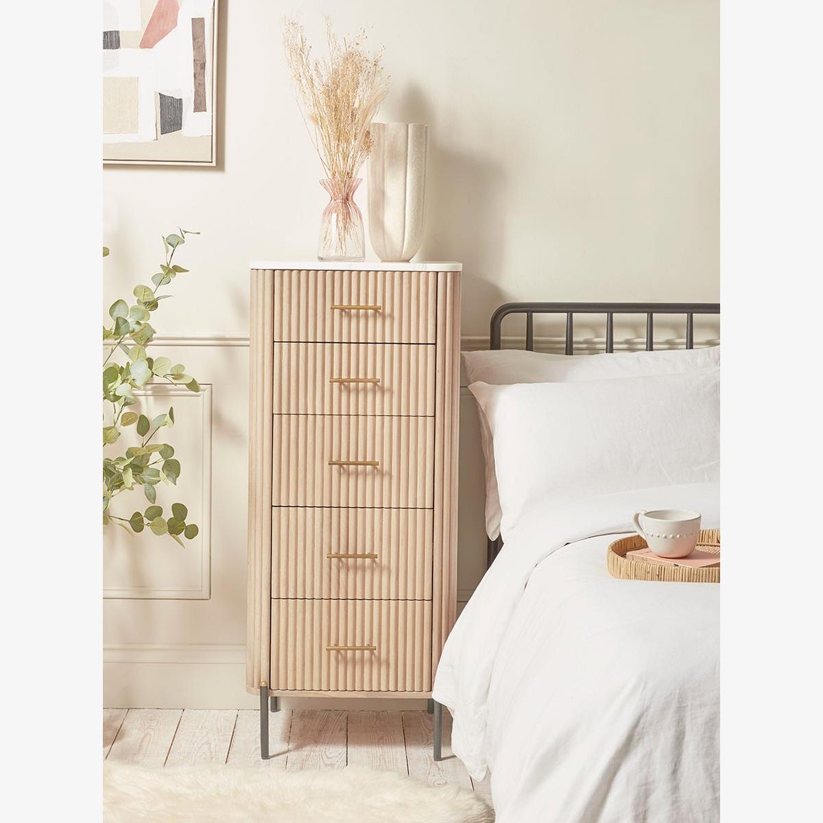 A welcome addition to our popular Freja range, this tall chest of drawers is perfect for smaller spaces or for creating a varied eye line in your room. With the same cool marble top contrasting beautifully with the rich palette of natural tones seen in the reeded wooden body and drawer fronts, the chest features five drawers and sits on slender matte black legs. Golden caps on the legs and matte gold handles add a luxurious touch to this already glamorous furniture collection. Discover the complete Freja furniture collection.