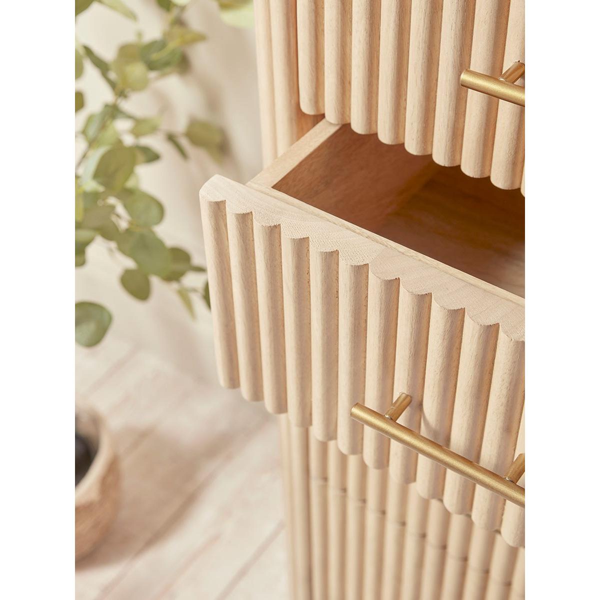 I’m a fan of the Freja chest for its slim, rib-front design and light oak finish - it works brilliantly in Scandi, mid-century or contemporary schemes where space is tight. The brass-tone handles lend a touch of warmth, while the vertical grooves add texture without overwhelming a room. For styling, top it with a simple ceramic vase of dried grasses or a small round mirror to add height and interest. In a bedroom you can layer framed prints above and coordinate with neutral linens and a soft runner rug to keep the look calm and cohesive.