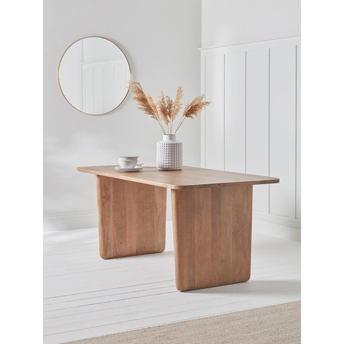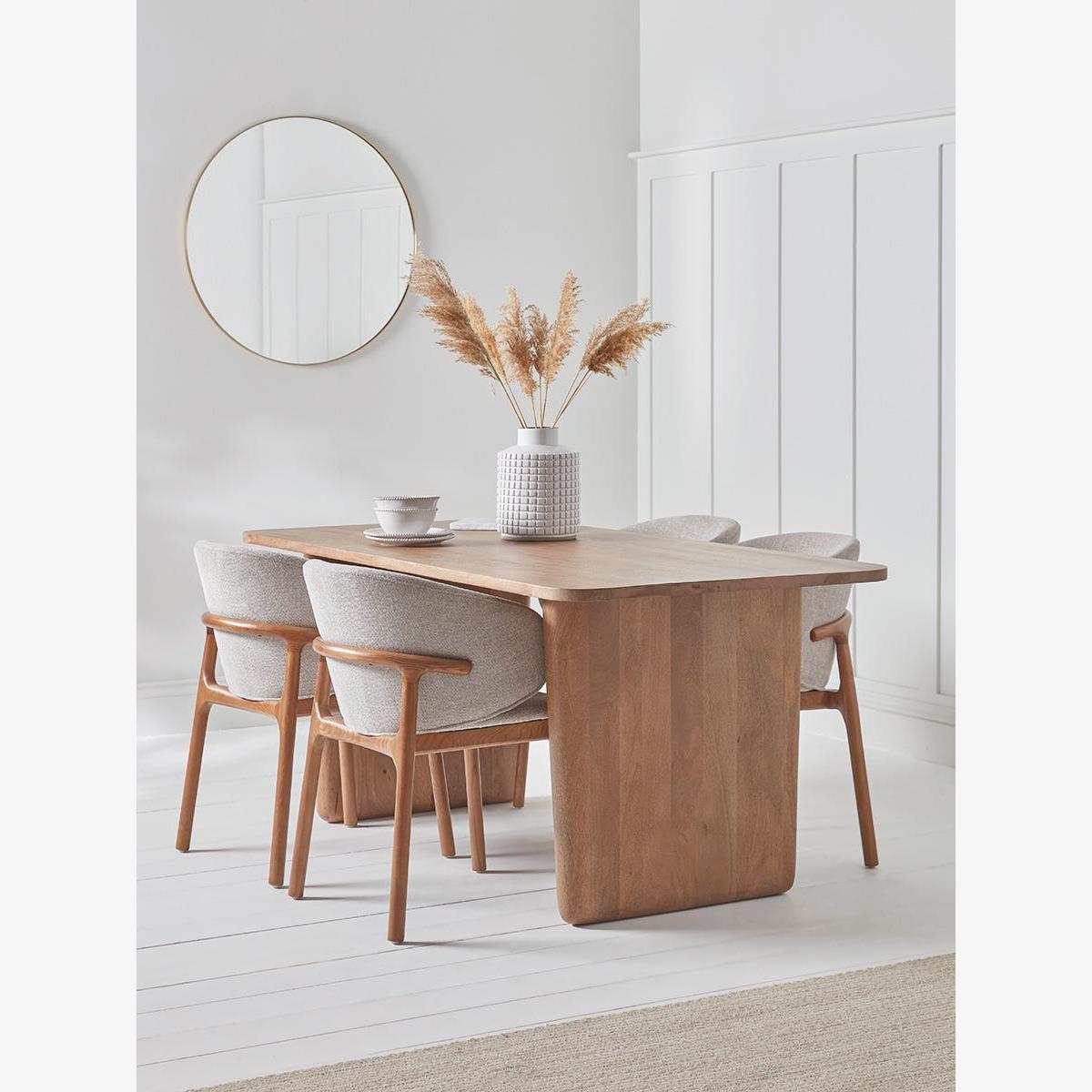 I’d choose the Fremont table for its clean-lined silhouette and warm oak finish - it’s sturdy yet unfussy, so it sits just as comfortably in a Scandi-inspired kitchen as it does in a modern farmhouse or coastal pad. The broad plinth base gives you plenty of leg room and a solid feel without overwhelming a small space. Styling-wise, keep centrepieces low and simple - a ceramic trough with dried florals or a row of stoneware candles works well - and layer in natural textures through woven placemats or a jute runner. You can mix and match seating (try upholstered chairs on the long sides with a wooden bench at one end) and hang a slim pendant light centrally to anchor the look.