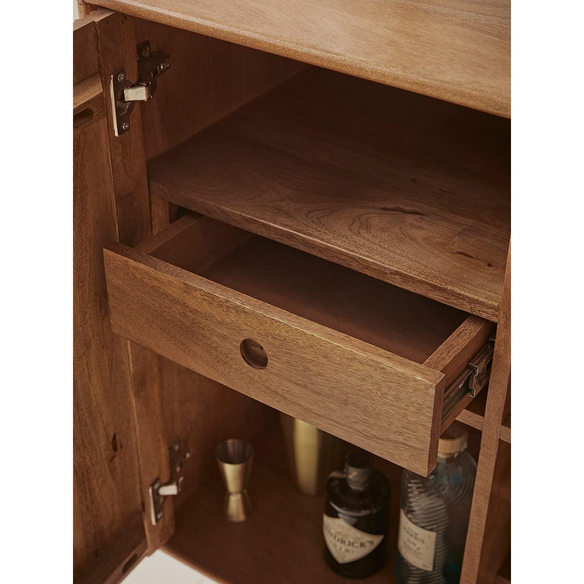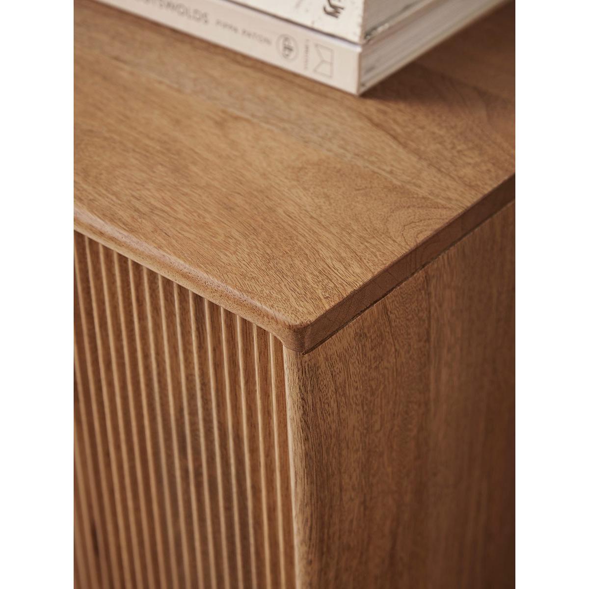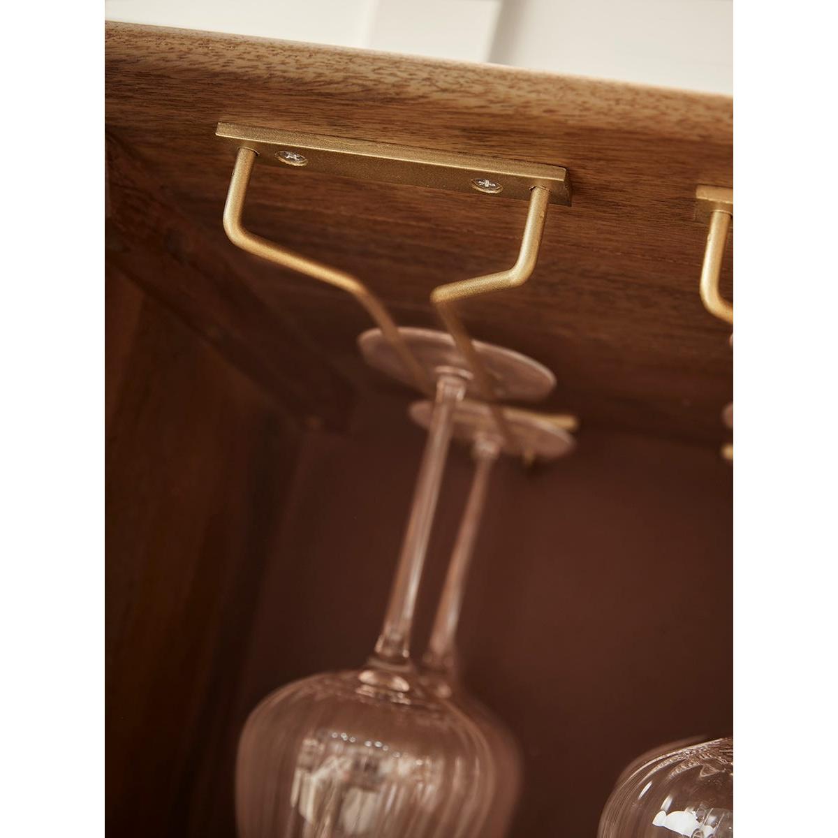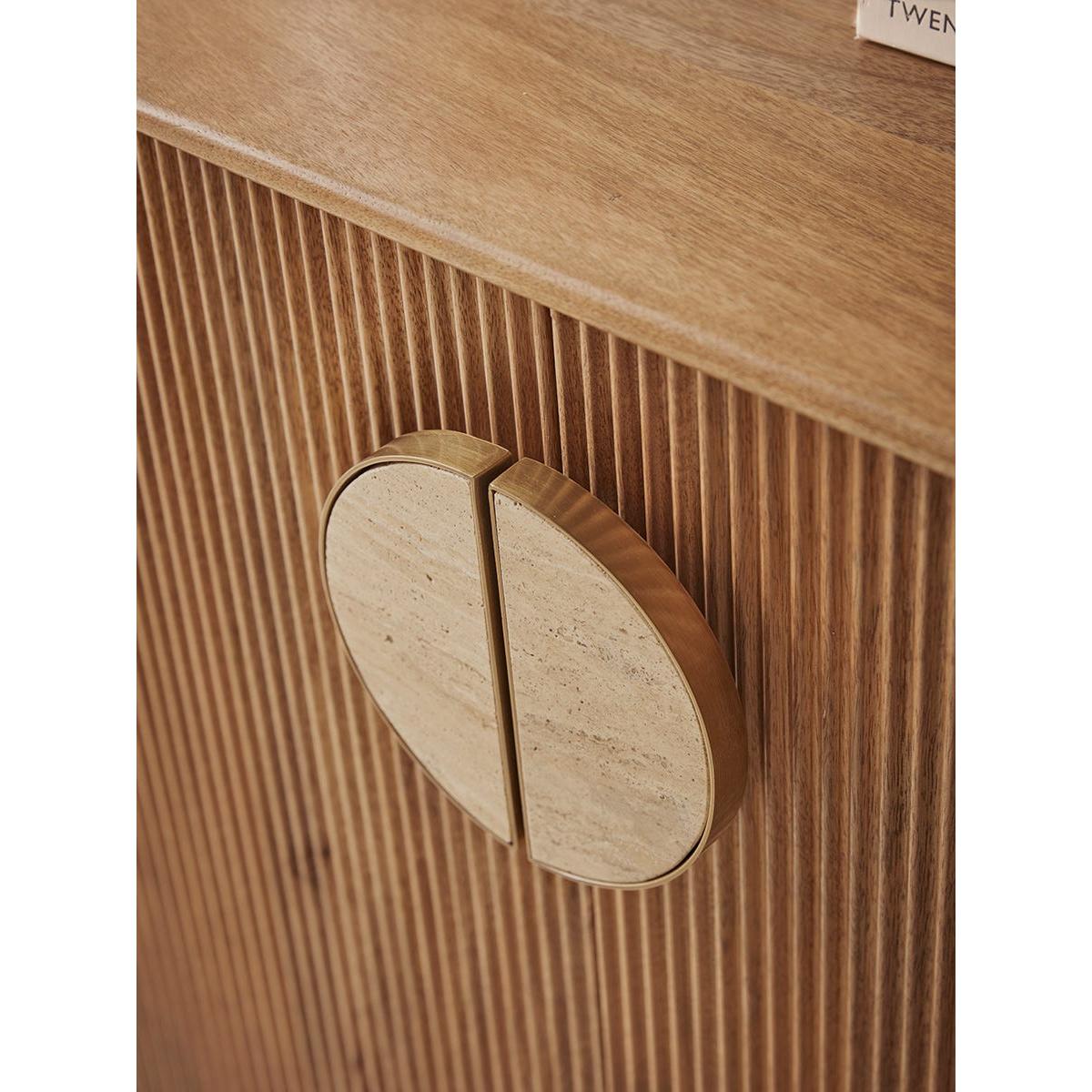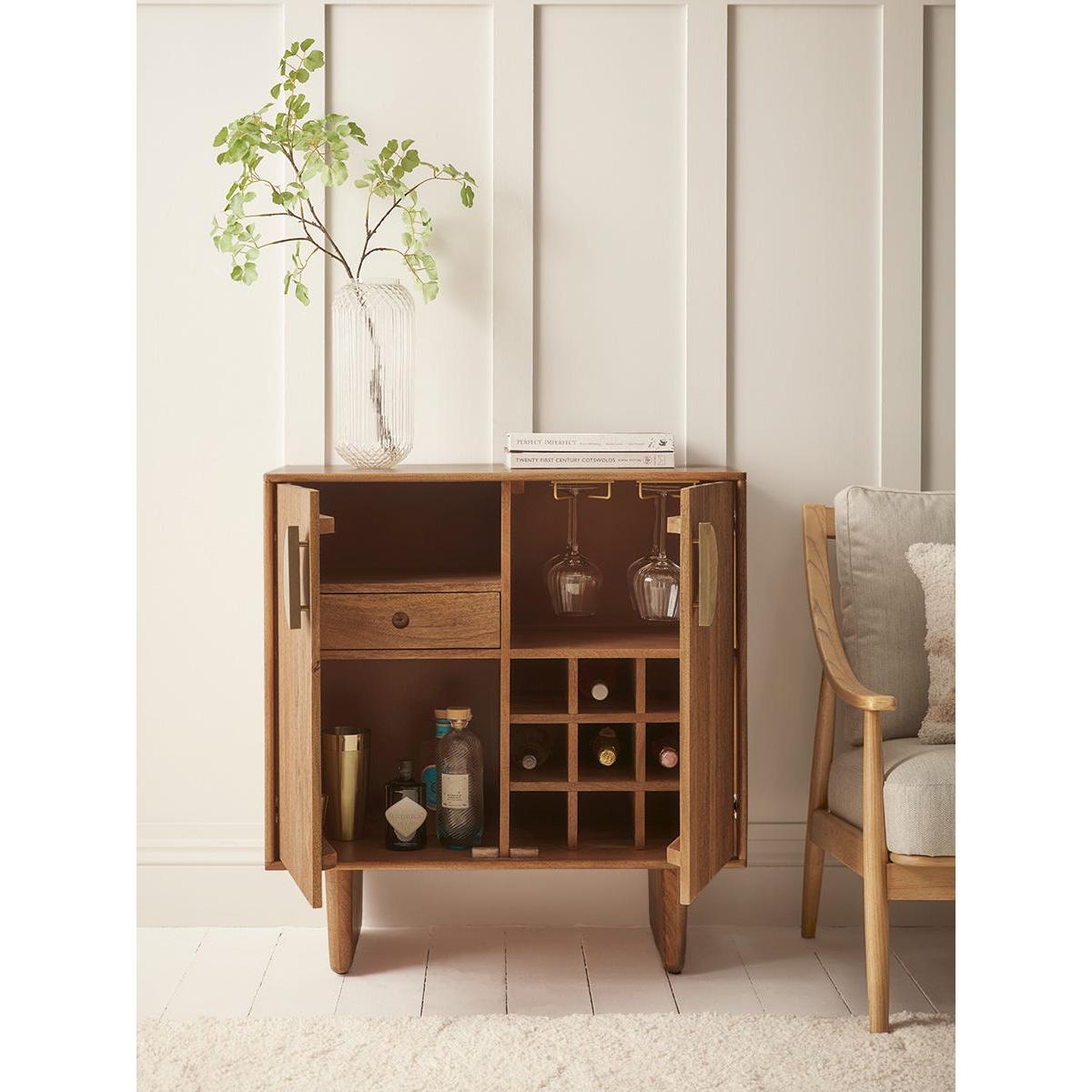 Our Fremont Display Cabinet is just as beautiful on the inside as it is on the outside. Our Fremont collection has a warmer, zen style which works well for those hoping to introduce a quiet style and infuse Scandi-goodness into their home. The warmth of the natural wood is fully celebrated in the wonderful organic lines of the ribbed front of this cabinet. The statement semi-circular gold-trim door handles and solid legs add additional character. Opening the doors is like lifting the lid on a jewellery box. Here you will find all the makings of a chic drinks cabinet, with a wine rack area, two hanging rails for stemmed glasses, a drawer for the corkscrew and plenty cubby hole space for any extras. Explore the complete Fremont Range.