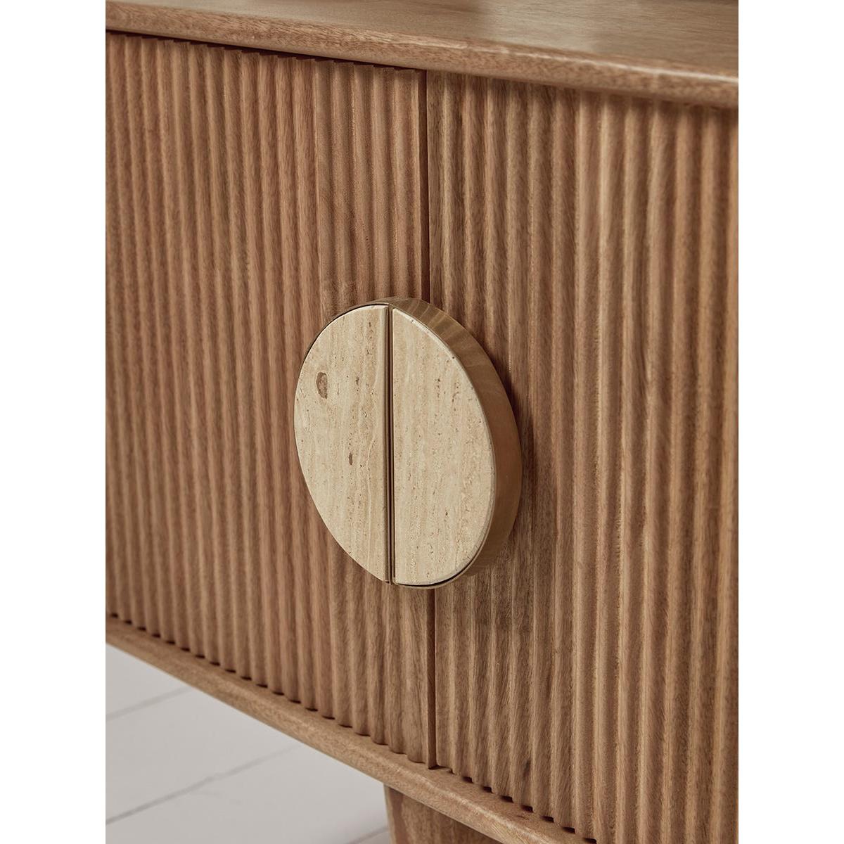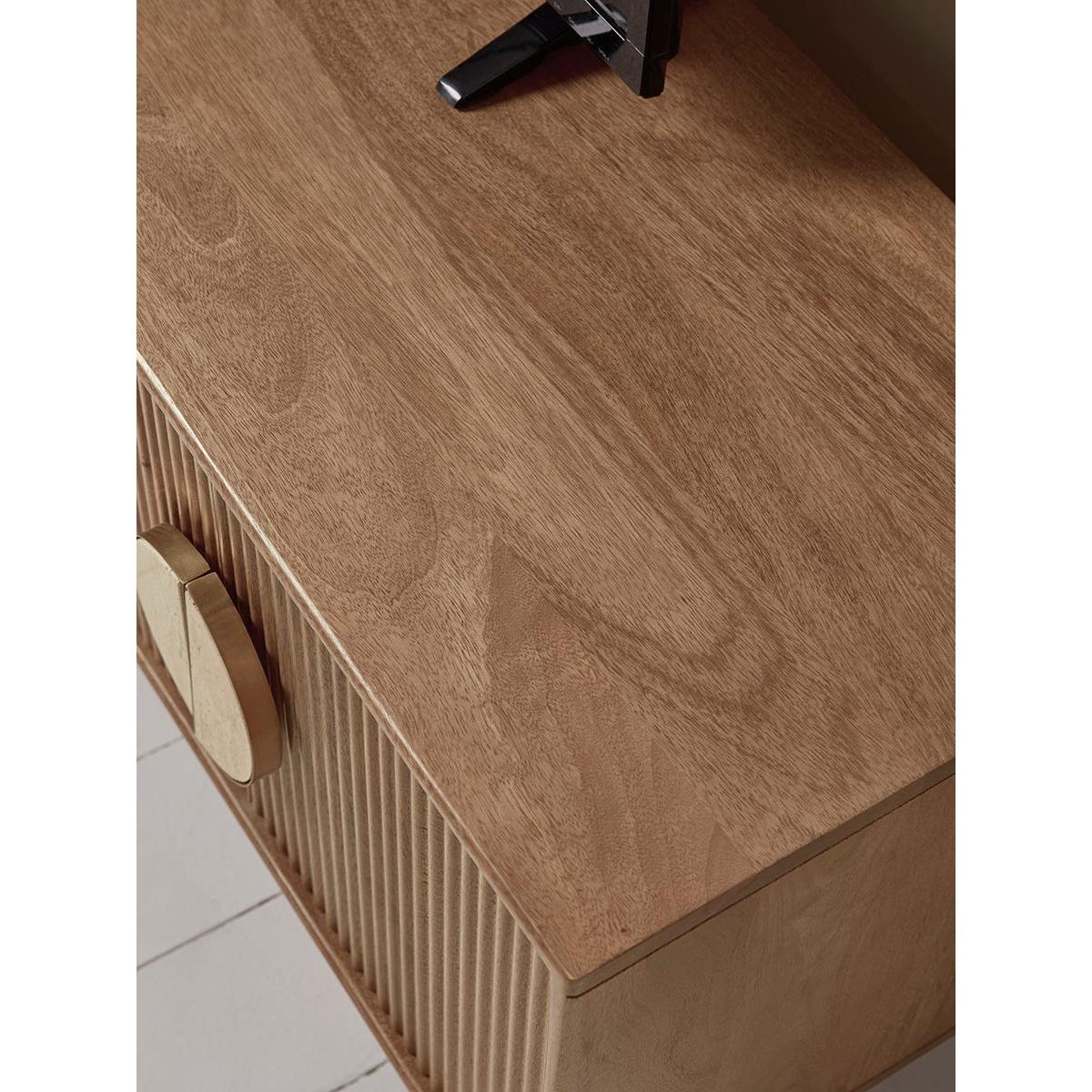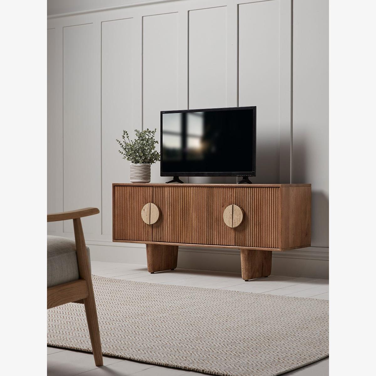 A complement to our Fremont sideboard, this media unit offers the same level of warm, zen styling which works well for those hoping to introduce a quiet style and infuse Scandi-goodness into their home. The warmth of the natural mango wood is emphasised by the organic lines of the ribbed front. Statement semi-circular travertine door handles trimmed in gold add additional character. With space for a TV on top and two cupboards beneath offering shelf space and holes for concealed wiring, this unit provides a stylish solution to your living room storage. Explore the complete Fremont Range.