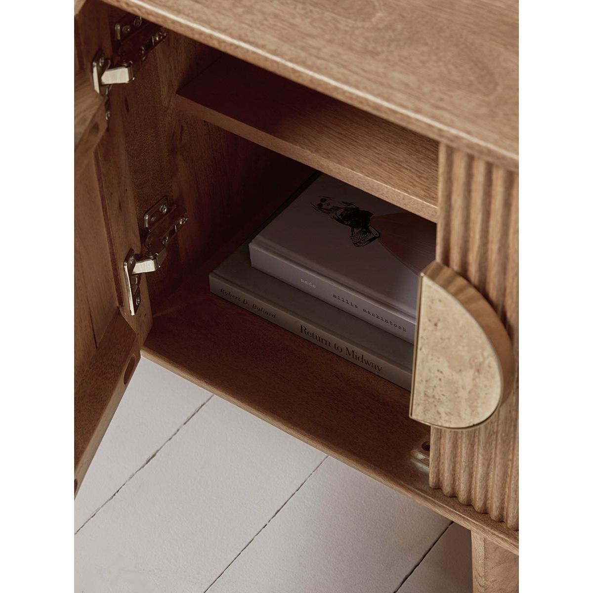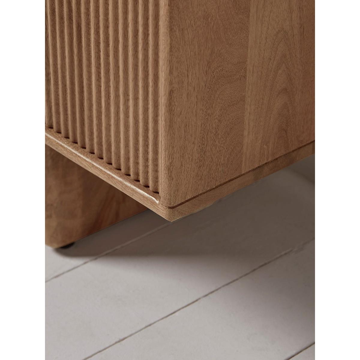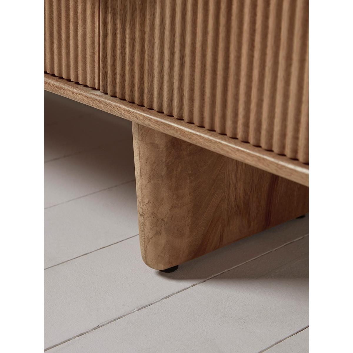 A complement to our Fremont sideboard, this media unit offers the same level of warm, zen styling which works well for those hoping to introduce a quiet style and infuse Scandi-goodness into their home. The warmth of the natural mango wood is emphasised by the organic lines of the ribbed front. Statement semi-circular travertine door handles trimmed in gold add additional character. With space for a TV on top and two cupboards beneath offering shelf space and holes for concealed wiring, this unit provides a stylish solution to your living room storage. Explore the complete Fremont Range.