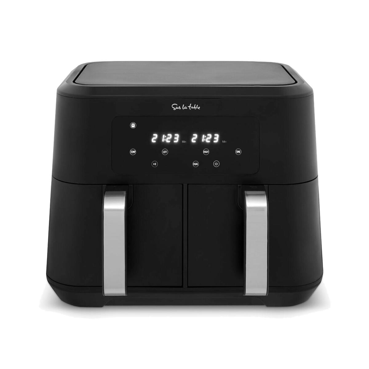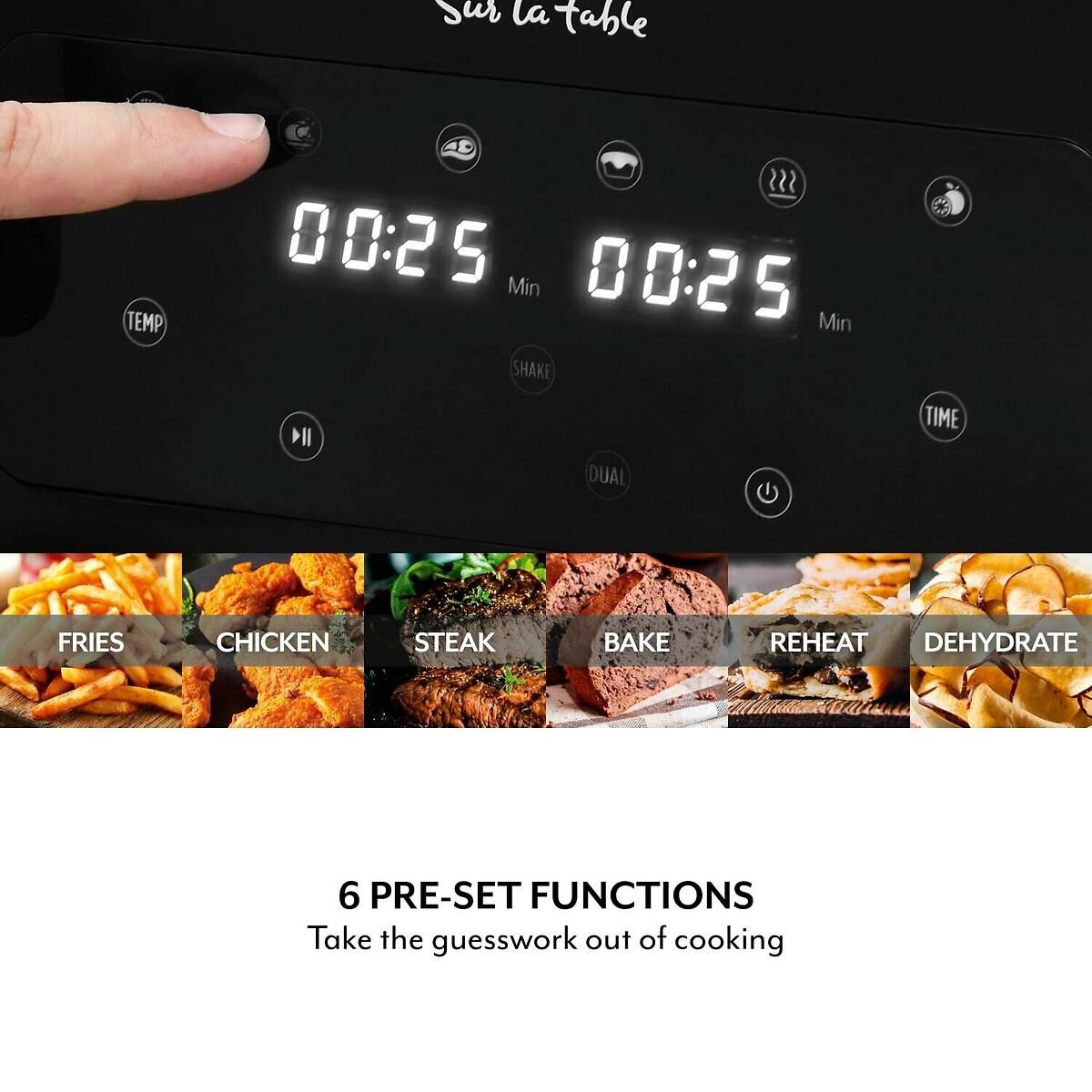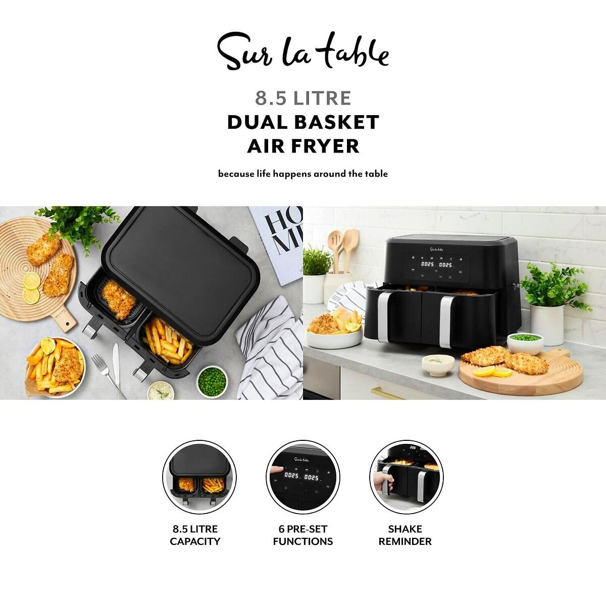 Air fryers have become a staple in kitchens, offering endless culinary possibilities. The Sur La Table duo basket digital air fryer is a faster, more energy-efficient alternative to oven cooking. With two 4.25. L non-stick baskets, it's perfect for family meals. You can create crispy dishes with little to no oil for healthier cooking. Smart Finish cooks two foods simultaneously at different times and temperatures, finishing together. Dual allows both baskets to cook at the same temperature and time, easily doubling your portions. Includes six pre-set options for Fries, Chicken, Steak, Bake, Reheat, and Dehydrate to simplify your cooking at the touch of a button. A shake reminder ensures even results. This dual basket air fryer also features adjustable temperatures, a digital LED display, auto-off safety feature, and non-slip feet. The non-stick grill plates makes it versatile and easy to clean. Explore and be amazed at what you can cook.2400W Air Fryer with 60 minute timer/24hr for dehydrate 8.5. L capacity2 x 4.25 Litre Cooking Baskets6 Functions: Air Fry. Roast. Steak. Bake. Dehydrate. Reheat. Rapid air circulation cooking technology for crispy foods. Synchronized heating for different start time with same finish time. Digital control panel/over heat protection Non stick cooking basket for easy clean/non slip feet. Includes crisper grill plate Item Dims: 28.8. H x 33.3W x 27D. Product Packaging: Full colour box. This product will be dispatched by one of our trusted suppliers. You’ll be contacted by their selected courier about your delivery.