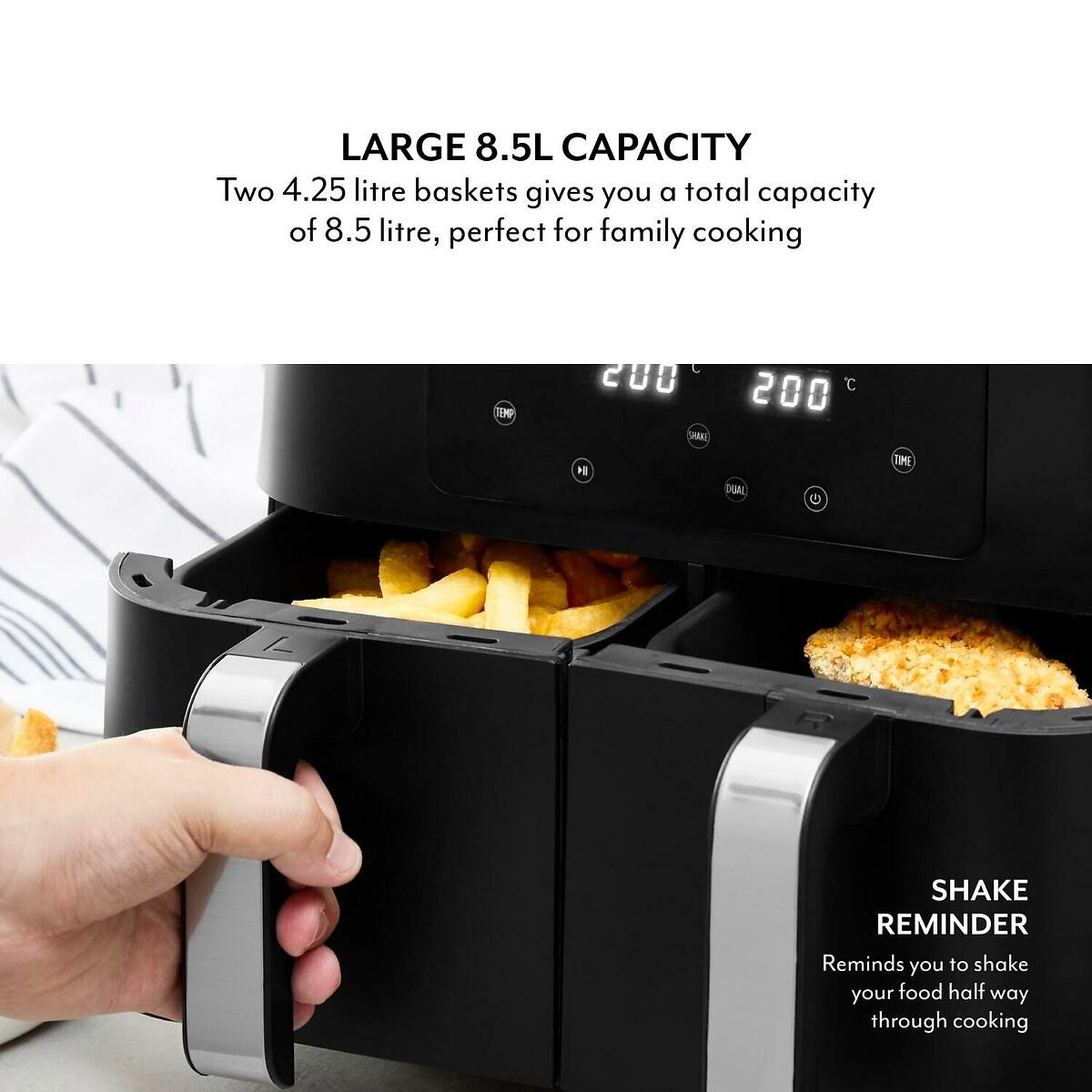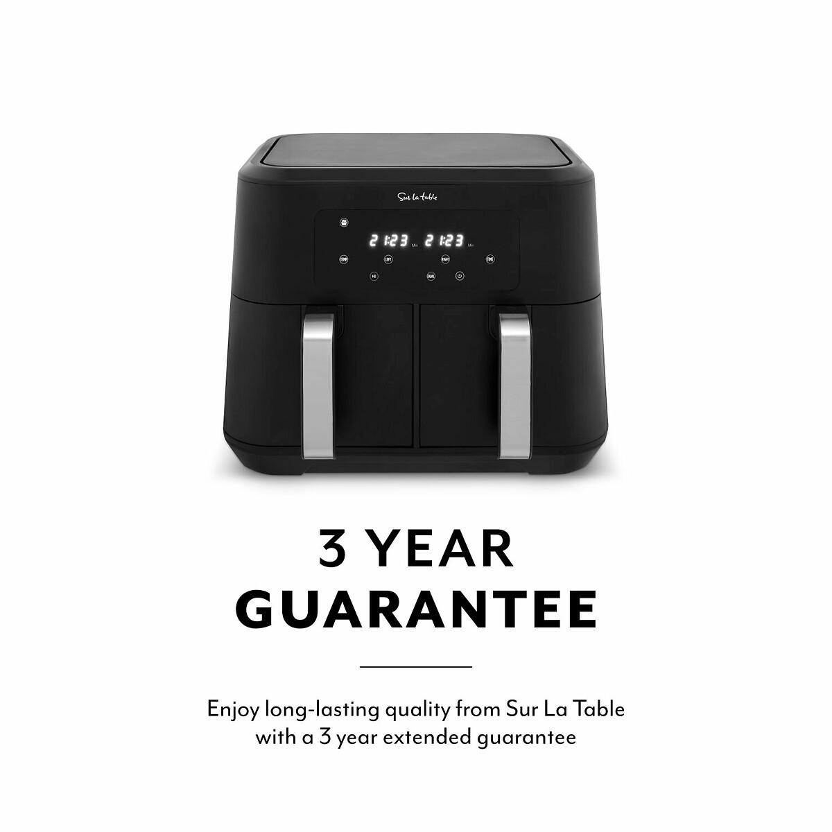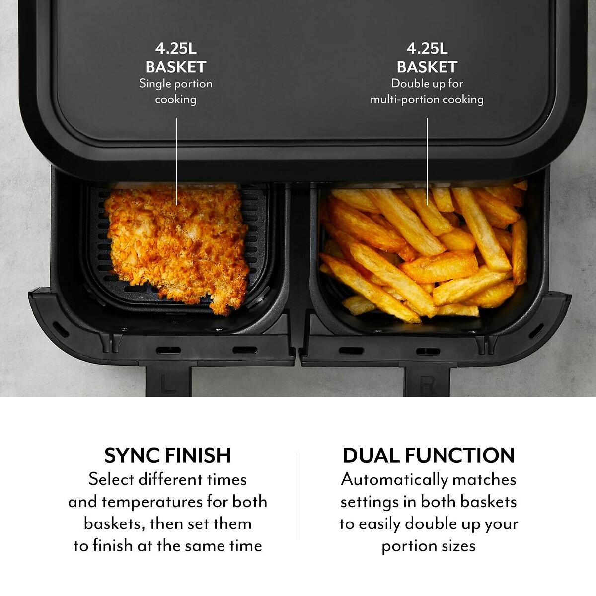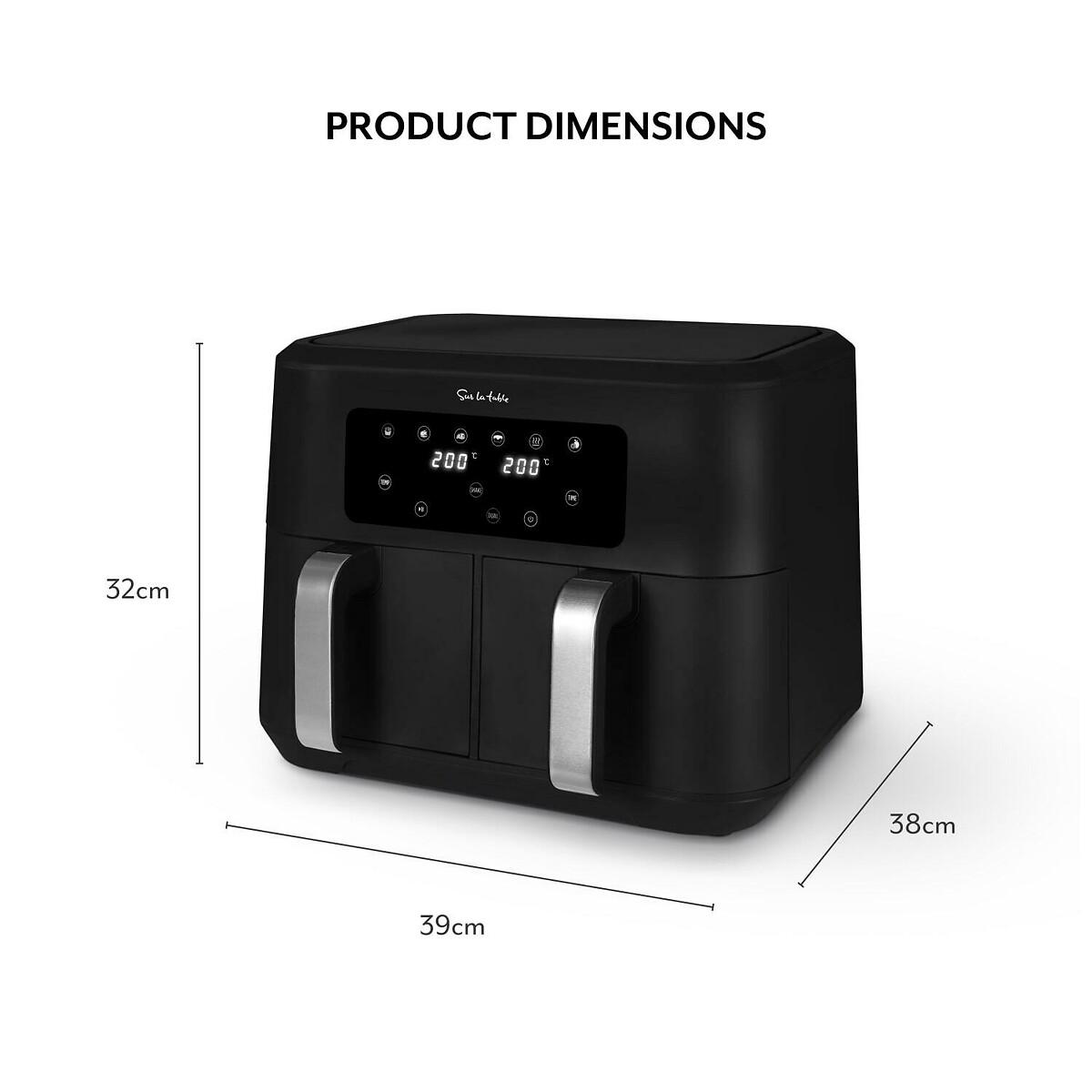 Air fryers have become a staple in kitchens, offering endless culinary possibilities. The Sur La Table duo basket digital air fryer is a faster, more energy-efficient alternative to oven cooking. With two 4.25. L non-stick baskets, it's perfect for family meals. You can create crispy dishes with little to no oil for healthier cooking. Smart Finish cooks two foods simultaneously at different times and temperatures, finishing together. Dual allows both baskets to cook at the same temperature and time, easily doubling your portions. Includes six pre-set options for Fries, Chicken, Steak, Bake, Reheat, and Dehydrate to simplify your cooking at the touch of a button. A shake reminder ensures even results. This dual basket air fryer also features adjustable temperatures, a digital LED display, auto-off safety feature, and non-slip feet. The non-stick grill plates makes it versatile and easy to clean. Explore and be amazed at what you can cook.2400W Air Fryer with 60 minute timer/24hr for dehydrate 8.5. L capacity2 x 4.25 Litre Cooking Baskets6 Functions: Air Fry. Roast. Steak. Bake. Dehydrate. Reheat. Rapid air circulation cooking technology for crispy foods. Synchronized heating for different start time with same finish time. Digital control panel/over heat protection Non stick cooking basket for easy clean/non slip feet. Includes crisper grill plate Item Dims: 28.8. H x 33.3W x 27D. Product Packaging: Full colour box. This product will be dispatched by one of our trusted suppliers. You’ll be contacted by their selected courier about your delivery.