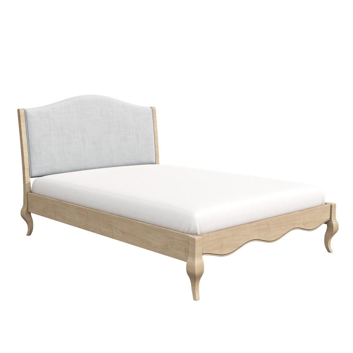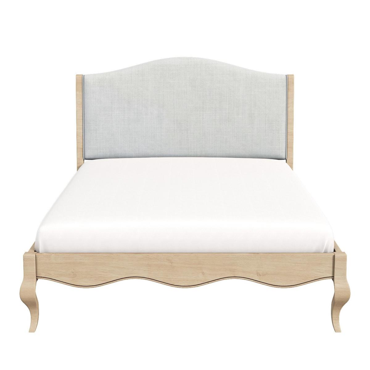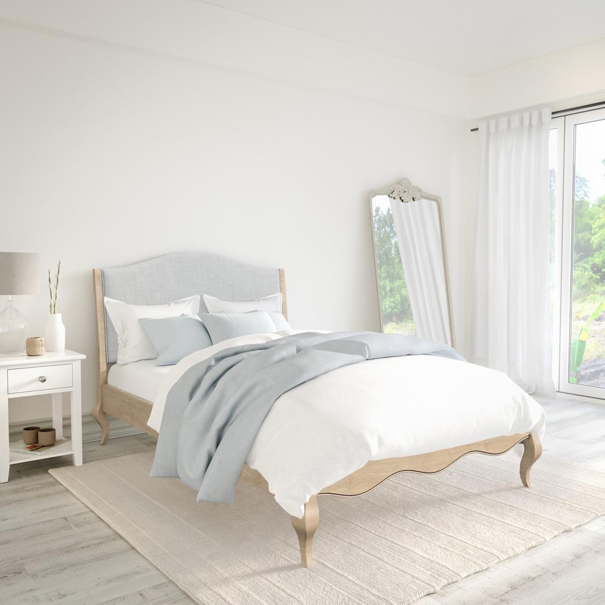 Features we love Beautiful king size bed frame with limed oak finish French-inspired design with curved legs and foot end Headboard upholstered in a chic powder blue linen fabric Sturdy wooden slatted base to support your mattress A classic piece that adds luxury to any bedroom All about me Add a touch of elegance to your bedroom with the Genevieve French-style bed frame with a woven linen fabric headboard. The limed-oak finish creates a washed effect, whilst the upholstered headboard adds a refreshing texture. The boutique blue headboard is perfect for the French style boudoir. This bed fits a standard UK king size mattress which is not included, but can be purchased separately. Need to know Dimensions:H116.5 x W162.6 x D222.2 cm Packaging dimensions:Box 1 - H24 x W173 x D126 cm, Box 2 - H17 x W218 x D25 cm Size: UK Standard King Size (5ft) Product weight: 43kg Colour: Limed oak and powder blue linen fabric Finish: Lacquered Material: Solid oak wood, oak veneer and MDF Assembly required: Yes