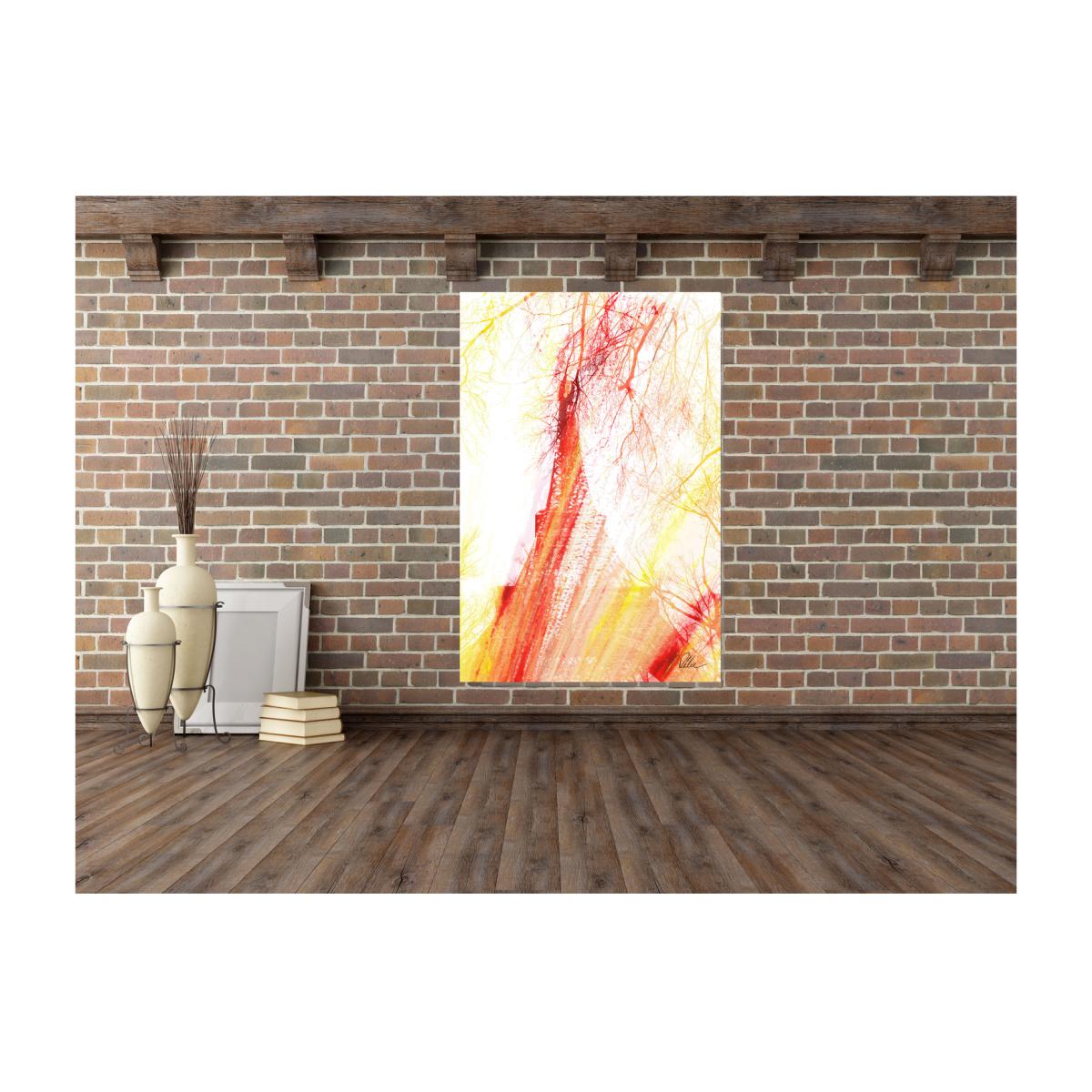 I love this piece for its bold, energetic yellows and dynamic composition, which can act as a focal point in various interior styles. It works particularly well in modern, minimalist spaces where its vibrant colour can stand out, or in eclectic interiors that embrace statement artwork. Practical styling tips include pairing it with neutral furniture to let the artwork take centre stage, or placing it above a simple sideboard or sofa to add warmth and visual interest. Its generous size makes it ideal for filling large wall spaces, and it’s versatile enough to work equally well in living rooms, offices or even bedrooms seeking a punch of colour.