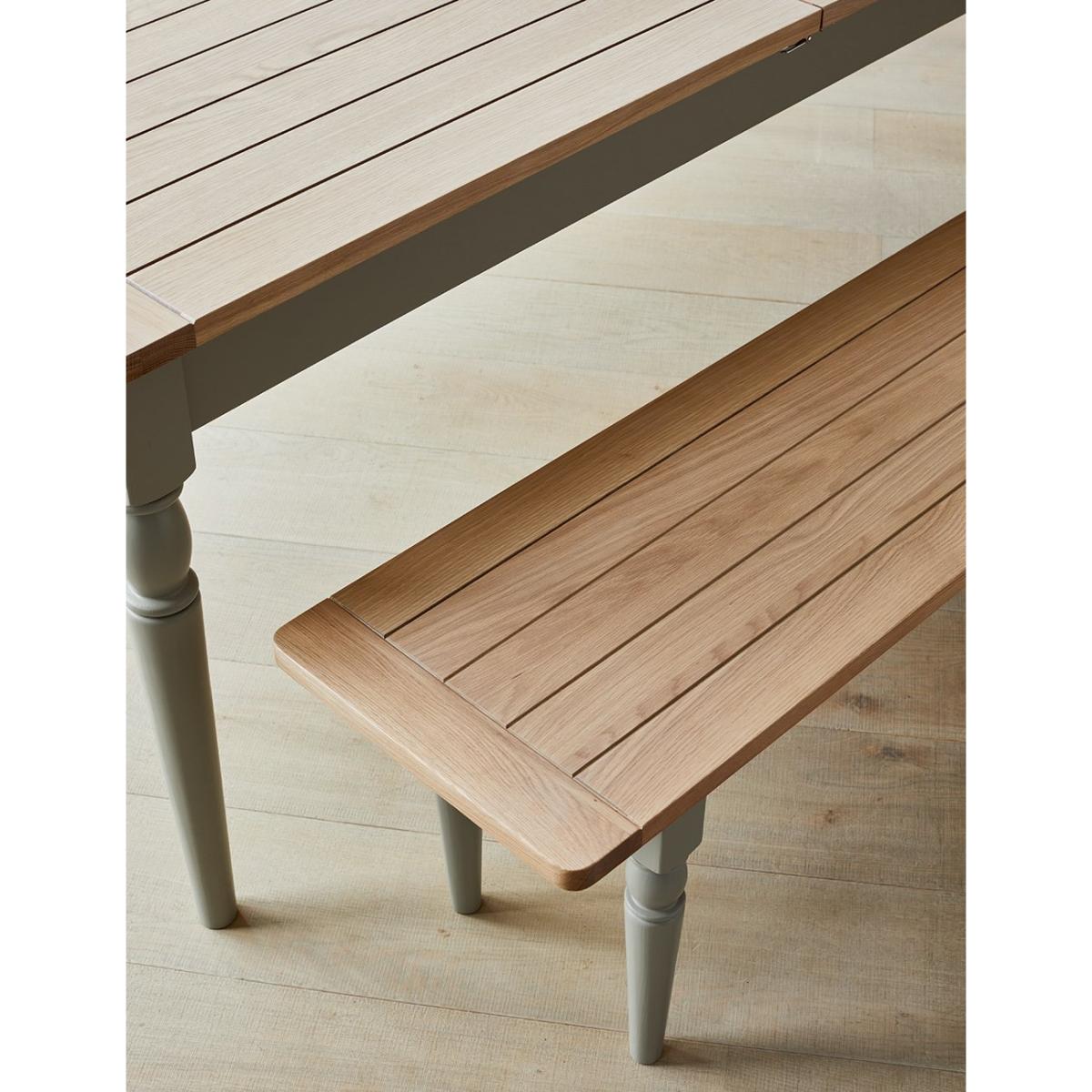 Transform your dining area with our French Grey Luxury Oak Dining Table Bench. Expertly crafted from solid oak, this dining room bench features a modern take on the classic country farmhouse design, complete with a grooved seat, turned spindle-style legs, and a solid oak underframe. Built to last and designed with both functionality and style in mind, our Oak Dining Table Bench perfectly complements our French Grey Oak Extendable Dining Table. At 152cm in length, this bench provides ample seating for up to three people, making it a practical and space-saving choice for any dining room.