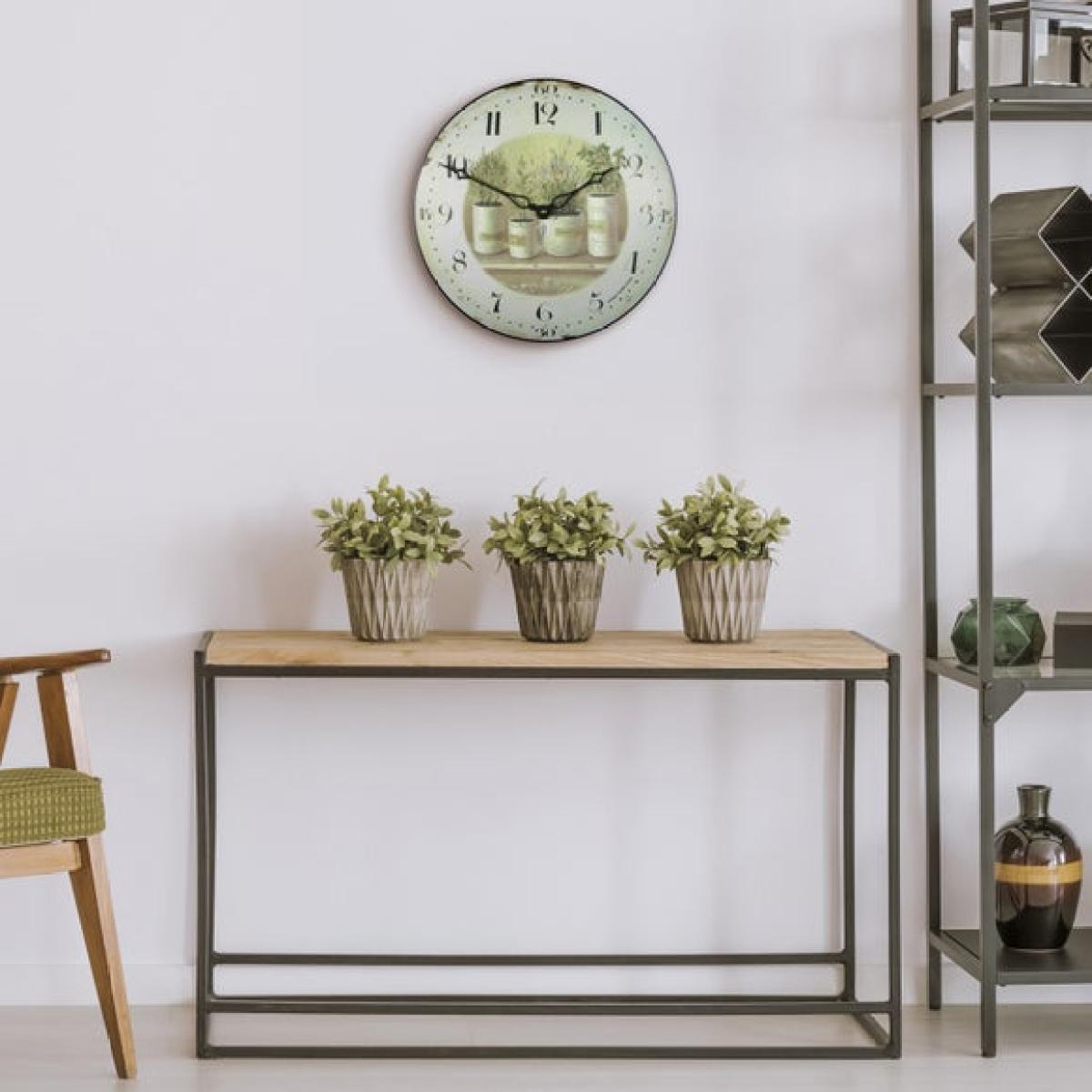 I love this wall clock because it combines practicality with a subtle touch of greenery, making it a versatile piece for many interiors. The herb pots design adds a quirky, fresh element that works especially well in kitchens, breakfast areas, or even herb-themed rooms. It pairs nicely with modern, Scandinavian, or rustic styles, where clean lines and natural touches are key. To style it effectively, consider complementing it with neutral tones and simple wooden furniture, and don’t forget to keep the herbs up to date for a real touch of freshness. It’s a practical yet charming addition that can serve as both a functional timepiece and a decorative statement.