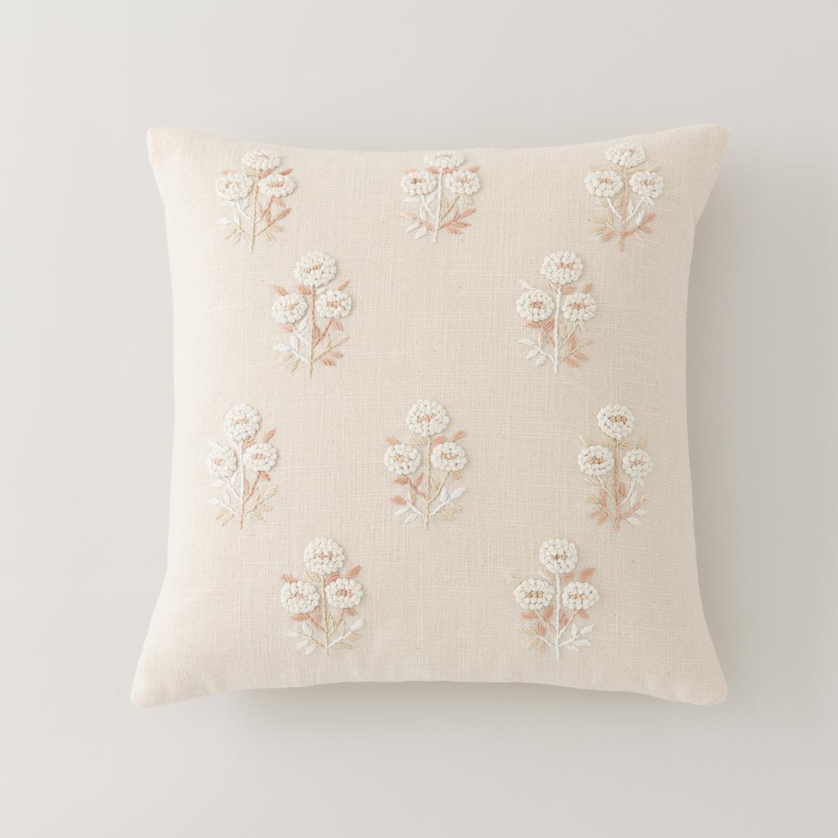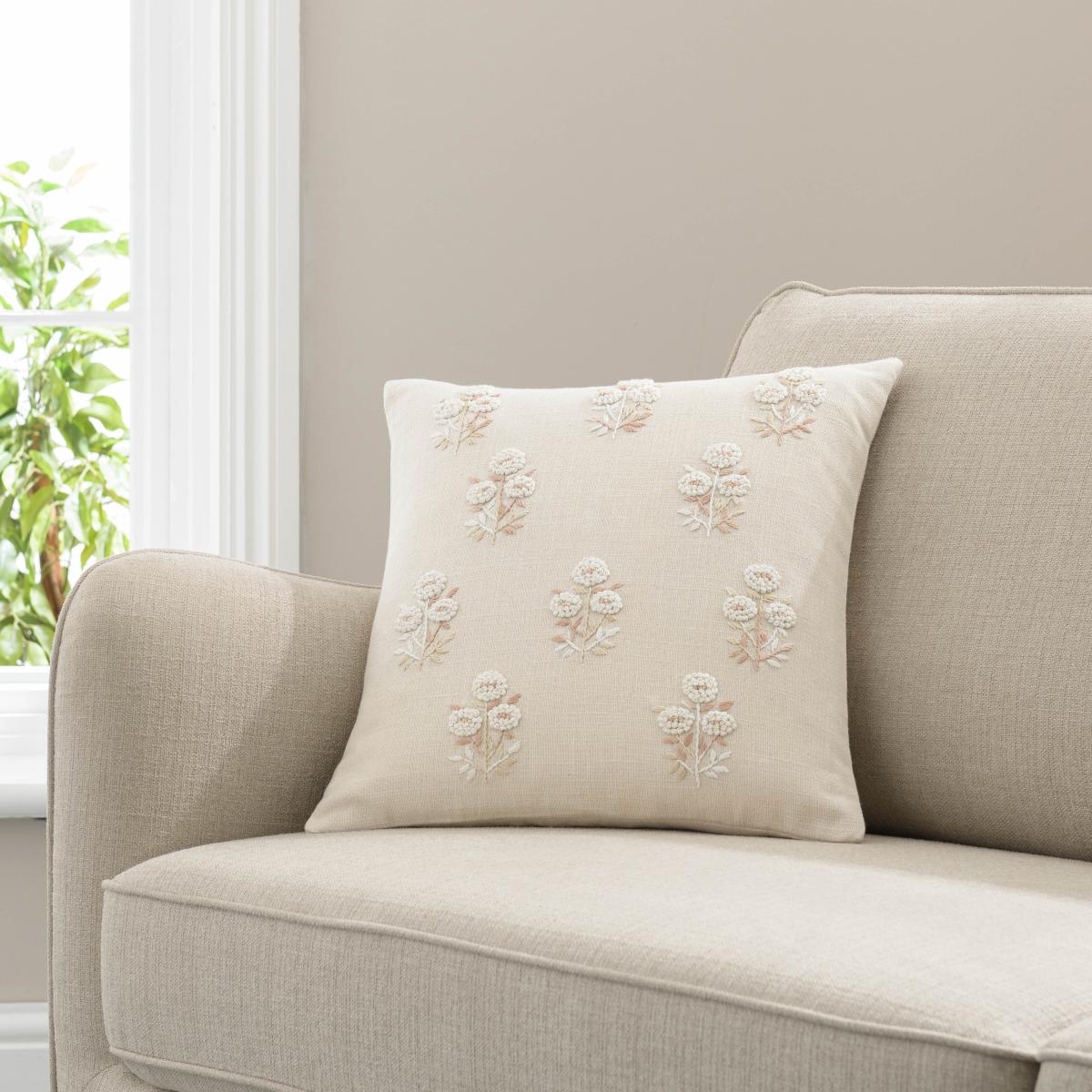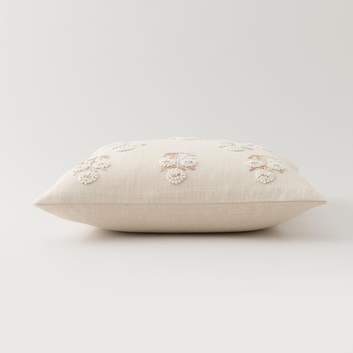 * Hand-embroidered cushion cover* Cotton slub cushion cover* Softly coloured with natural dyes* Hand-embroidered floral posies realised in French knots Add a touch of elegance and sophistication to your living space with this stunning French Knot Floral Cushion Cover. Each piece is crafted from Cotton and dyed using natural colours, ensuring that no two covers are alike. The hand-embroidered floral posies in French knots add a charming touch, making this cover perfect for country-style decor.