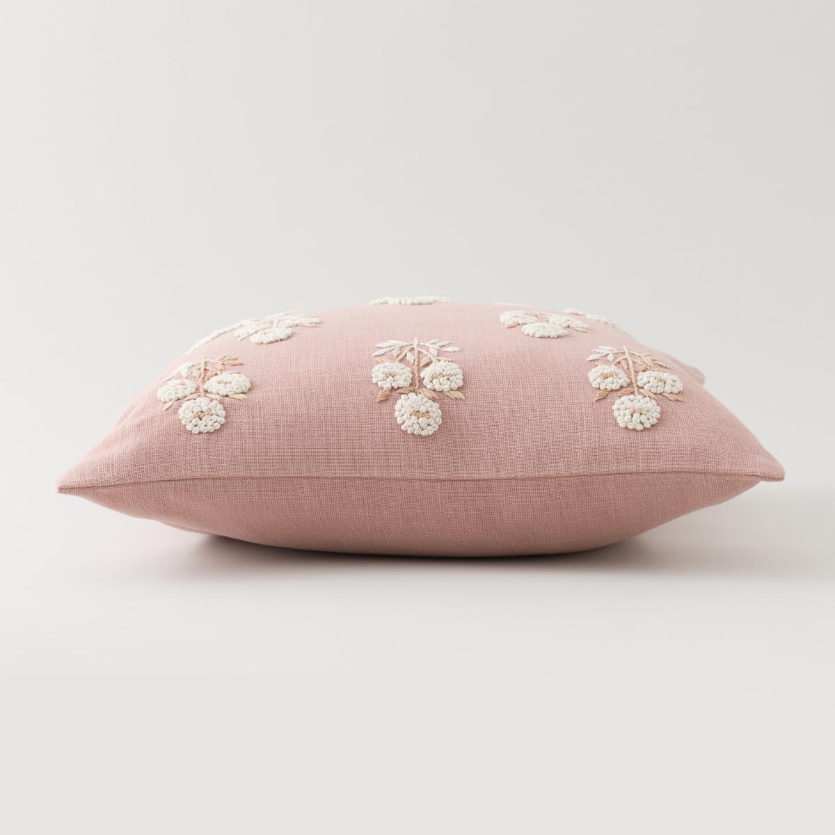 * Hand-embroidered cushion cover* Cotton slub cushion cover* Softly coloured with natural dyes* Hand-embroidered floral posies realised in French knots Add a touch of elegance and sophistication to your living space with this stunning French Knot Floral Cushion Cover. Each piece is crafted from Cotton and dyed using natural colours, ensuring that no two covers are alike. The hand-embroidered floral posies in French knots add a charming touch, making this cover perfect for country-style decor.