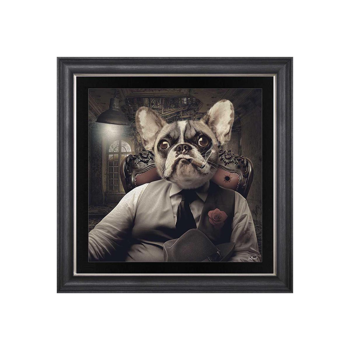 If you’re the owner of a French bulldog, then this is for you. This playful piece of framed art is filled with humour and character, and makes a lovely gift for another dog lover. Why you'll love it. French bulldog framed art brims with personality. Charming and witty. Mafia-inspired portrait is so eye-catching. Elegant grey frame. Creative and beautifully crafted wall art. Made to order in the UK. This piece of framed art is part of the Furniture Village accessories collection. What you need to know. Indoor use only. Do not use wire or string to hang. Hanging instructions supplied with artwork. Dimensions. Height: 90 cm (36 in). Width: 90 cm (36 in).