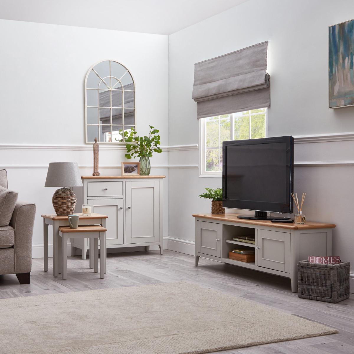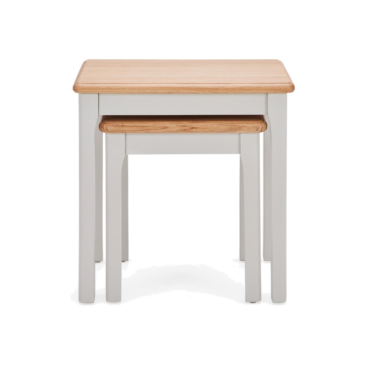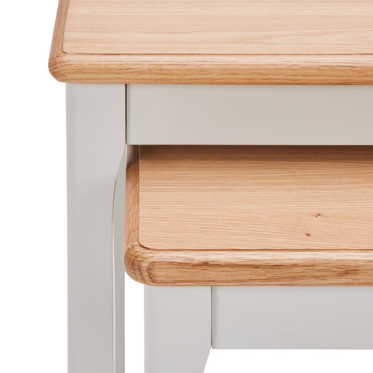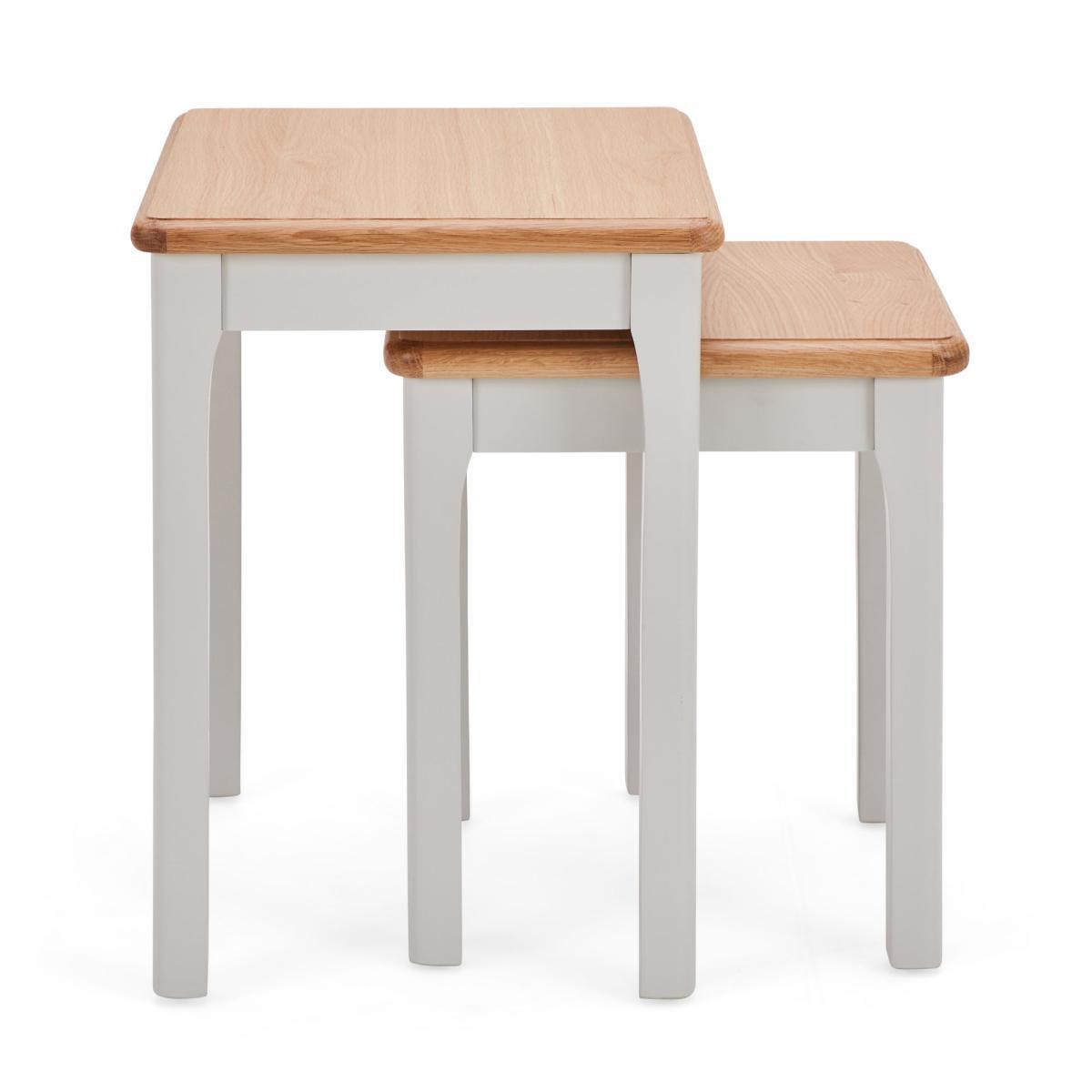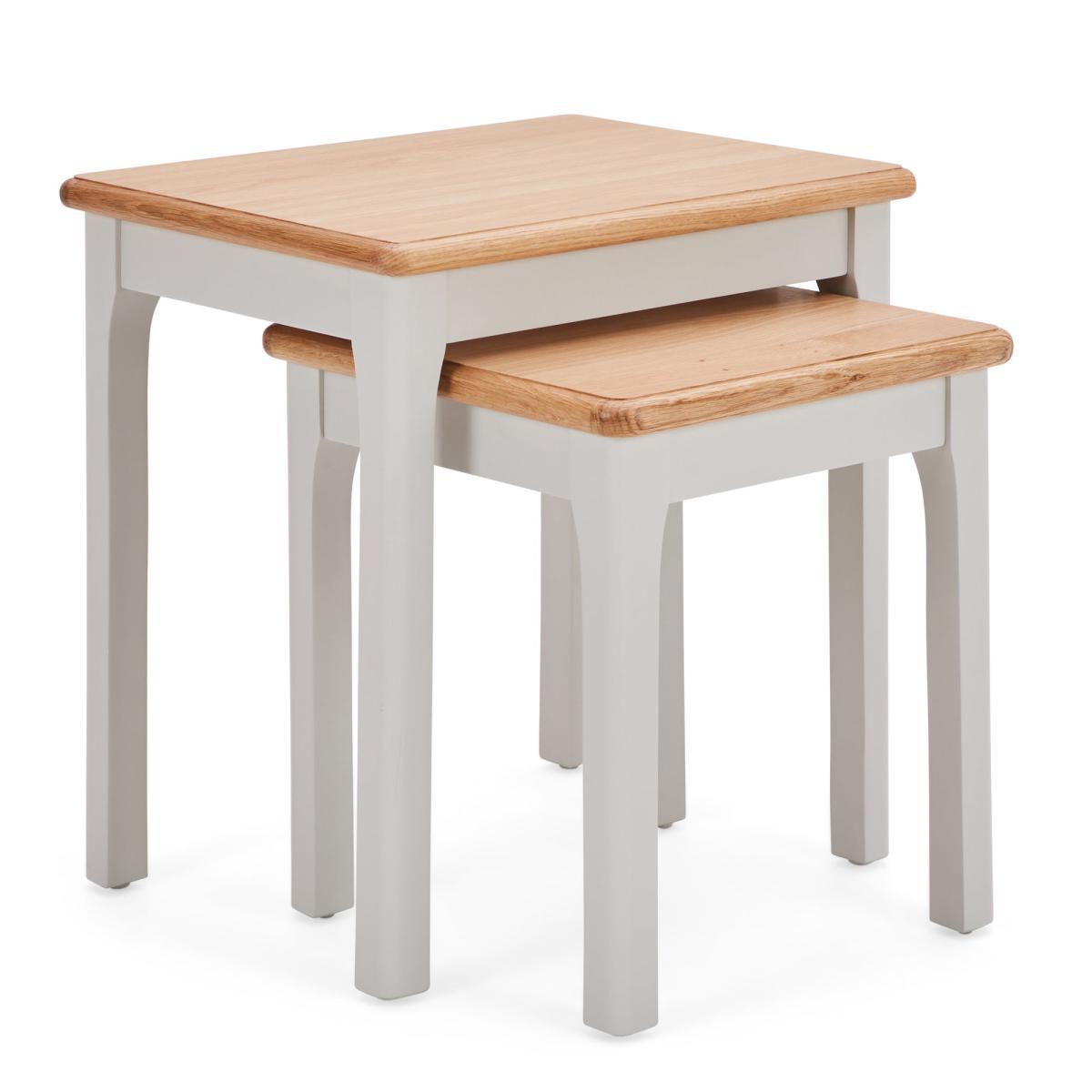 Dunelm Exclusive - Designed and Developed by Dunelm. Offering a unique twist on a traditional design, the beautifully crafted Freya collection is characterised by the stunning grey painted finish, chrome handles and solid oak and oak veneer tops. This range would be perfect for a wide range of décor styles. Complete with sturdy, solid oak tops, the Freya nest of tables offer a convenient, space saving solution for your living room. This part assembly pair of occasional tables nest comfortably together, making it easy to store away when not in use.