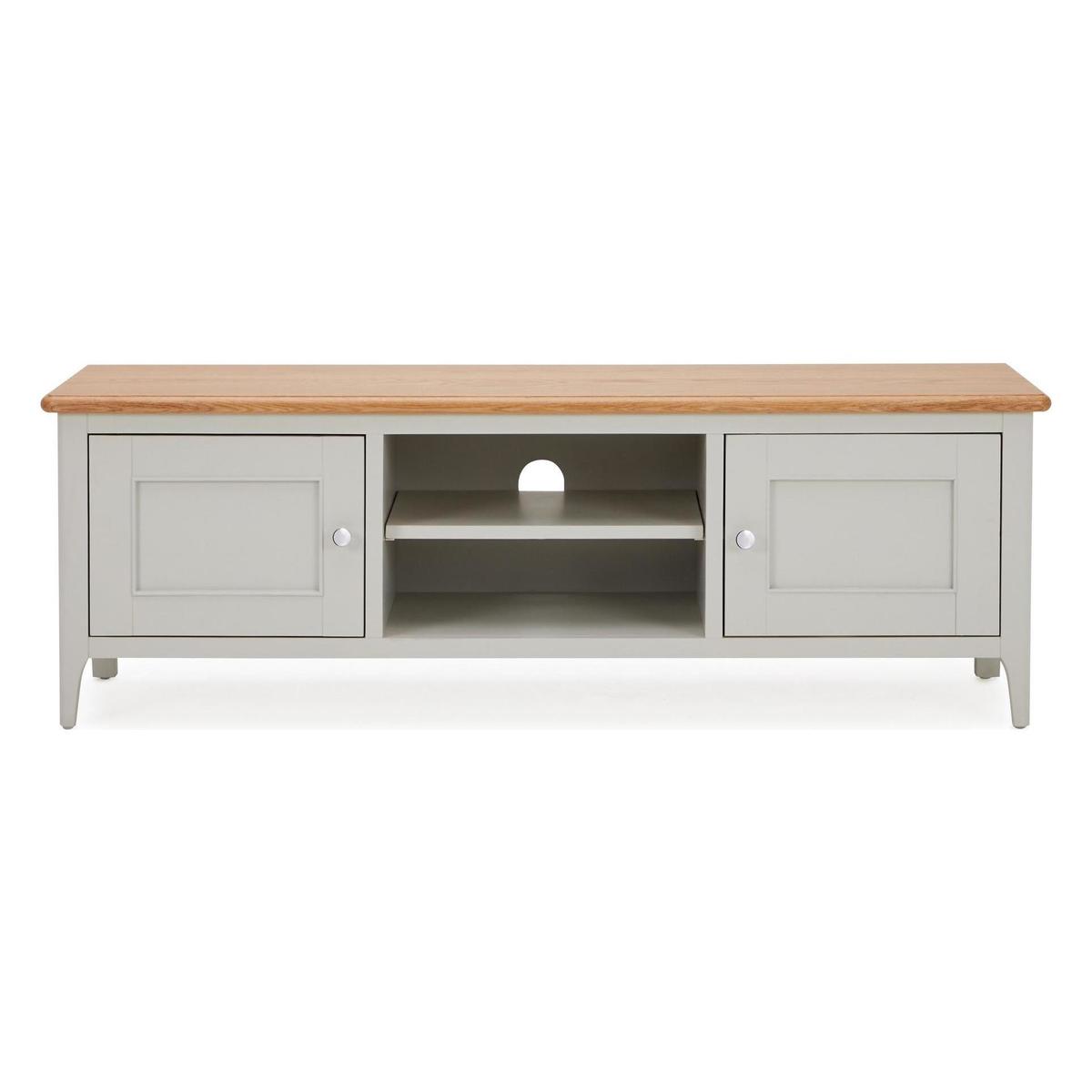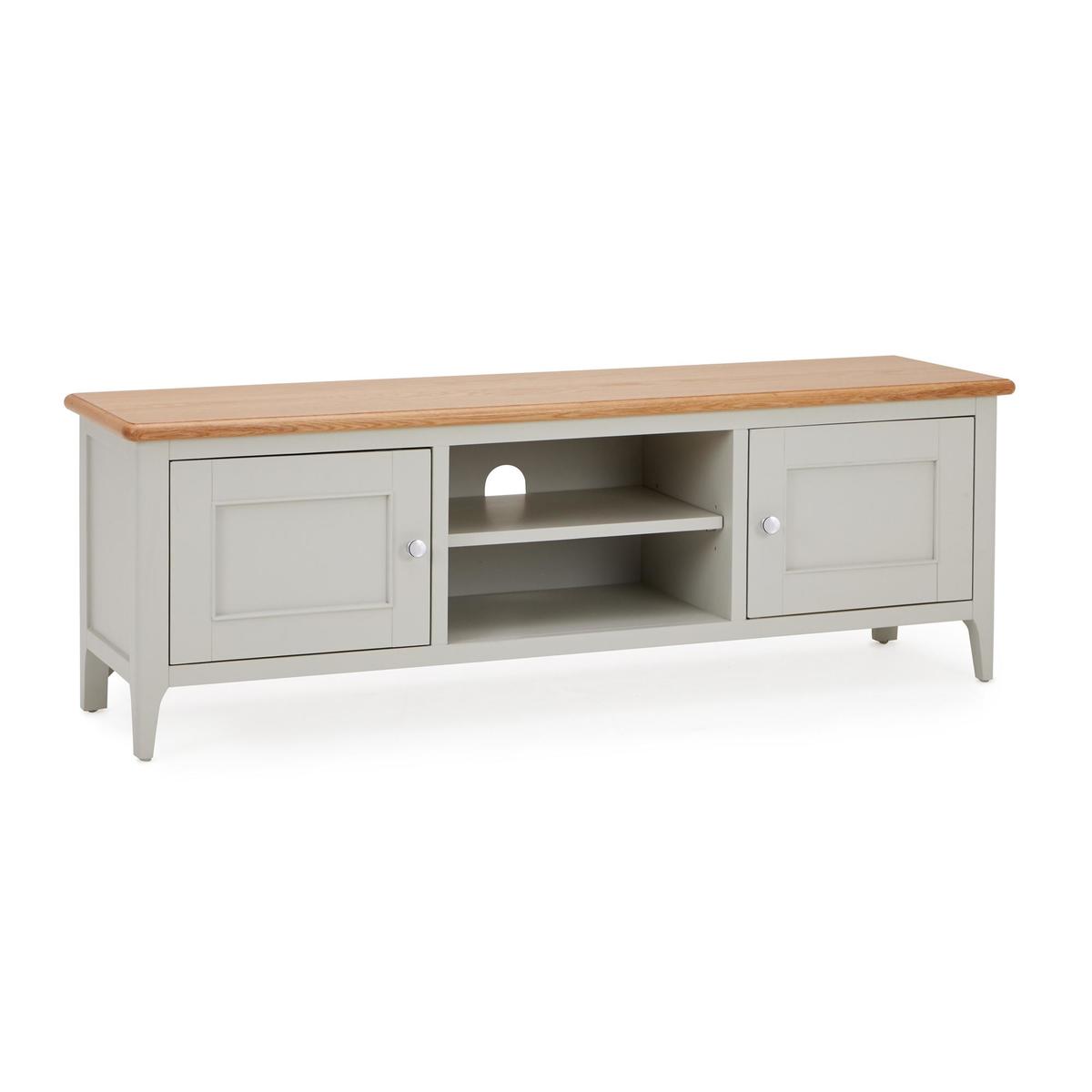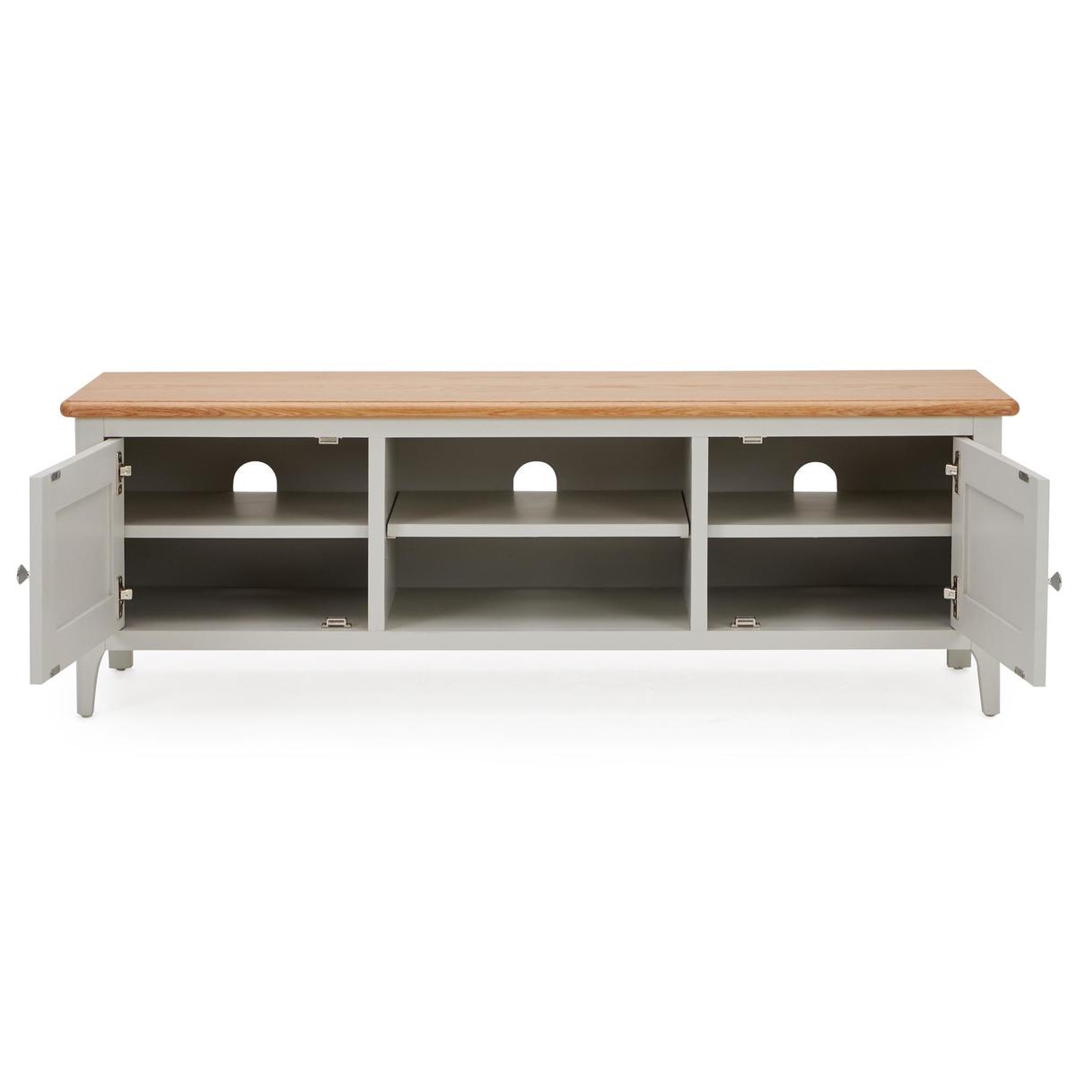 Dunelm Exclusive - Designed and Developed by Dunelm. Offering a unique twist on a traditional design, the beautifully crafted Freya collection is characterised by the stunning grey painted finish, chrome handles and solid oak and oak veneer tops. This range would be perfect for a wide range of décor styles. Complete with a natural, solid oak top, the fully assembled Freya wide TV stand offers plenty of space for your consoles and devices, thanks to the two spacious cupboards, each with two shelves, as well as two additional open shelves, each with a handy cable aperture.
