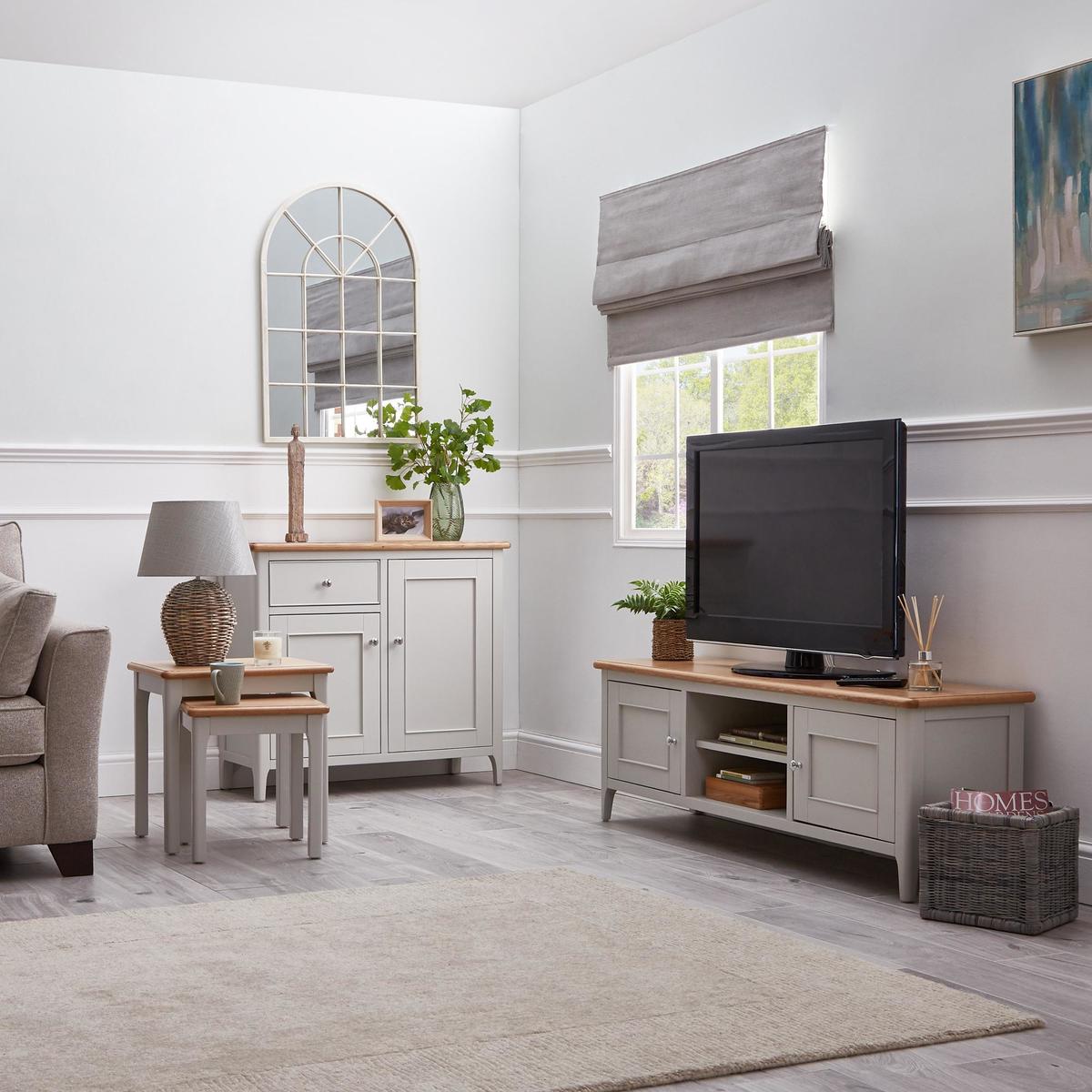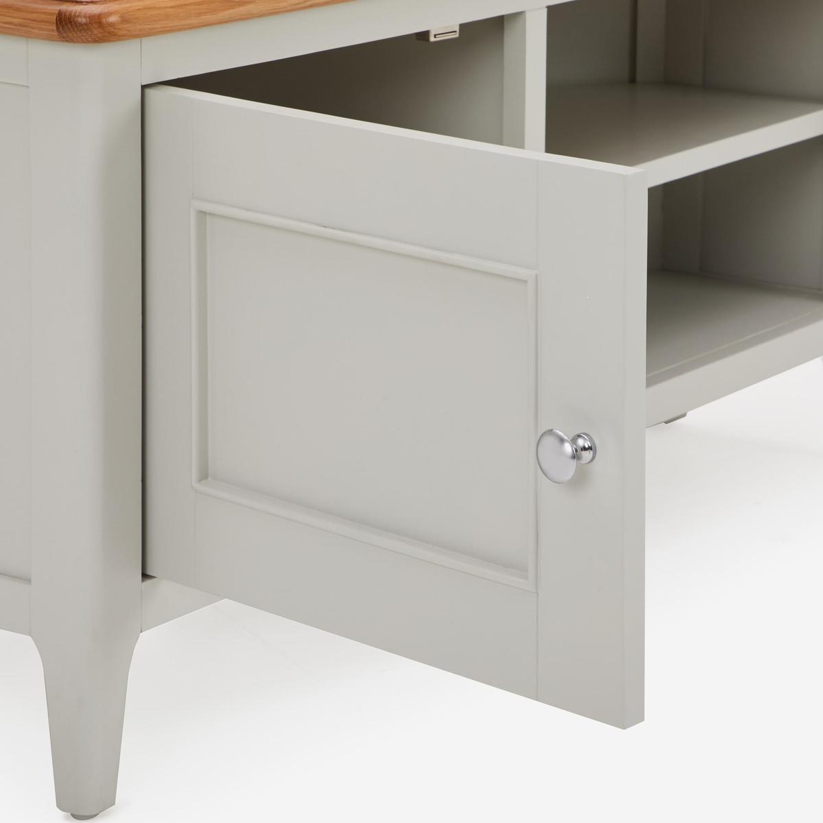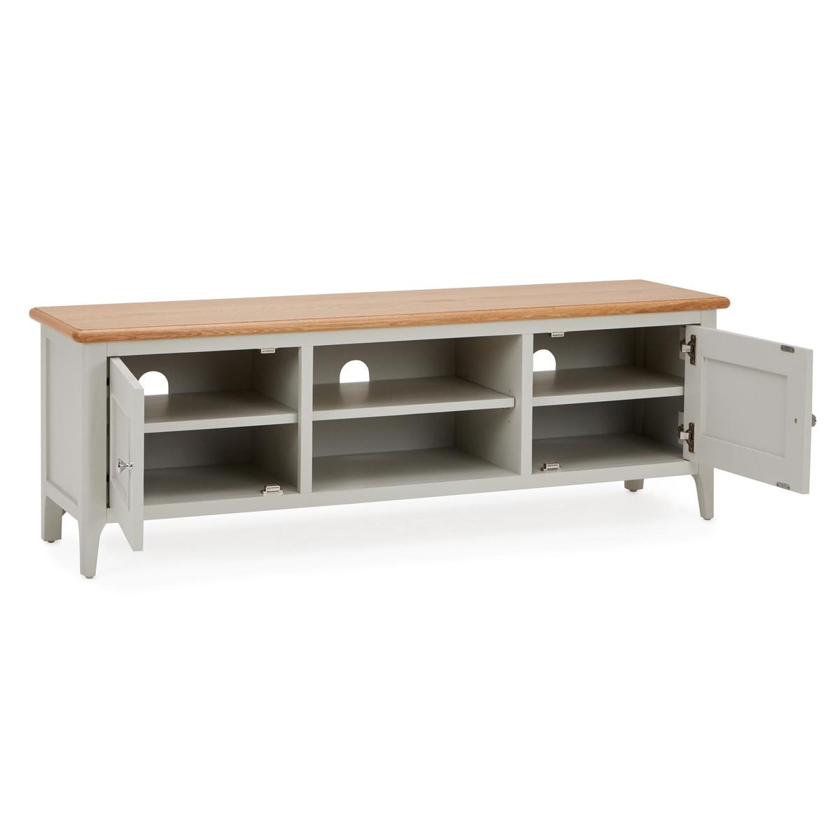 Dunelm Exclusive - Designed and Developed by Dunelm. Offering a unique twist on a traditional design, the beautifully crafted Freya collection is characterised by the stunning grey painted finish, chrome handles and solid oak and oak veneer tops. This range would be perfect for a wide range of décor styles. Complete with a natural, solid oak top, the fully assembled Freya wide TV stand offers plenty of space for your consoles and devices, thanks to the two spacious cupboards, each with two shelves, as well as two additional open shelves, each with a handy cable aperture.