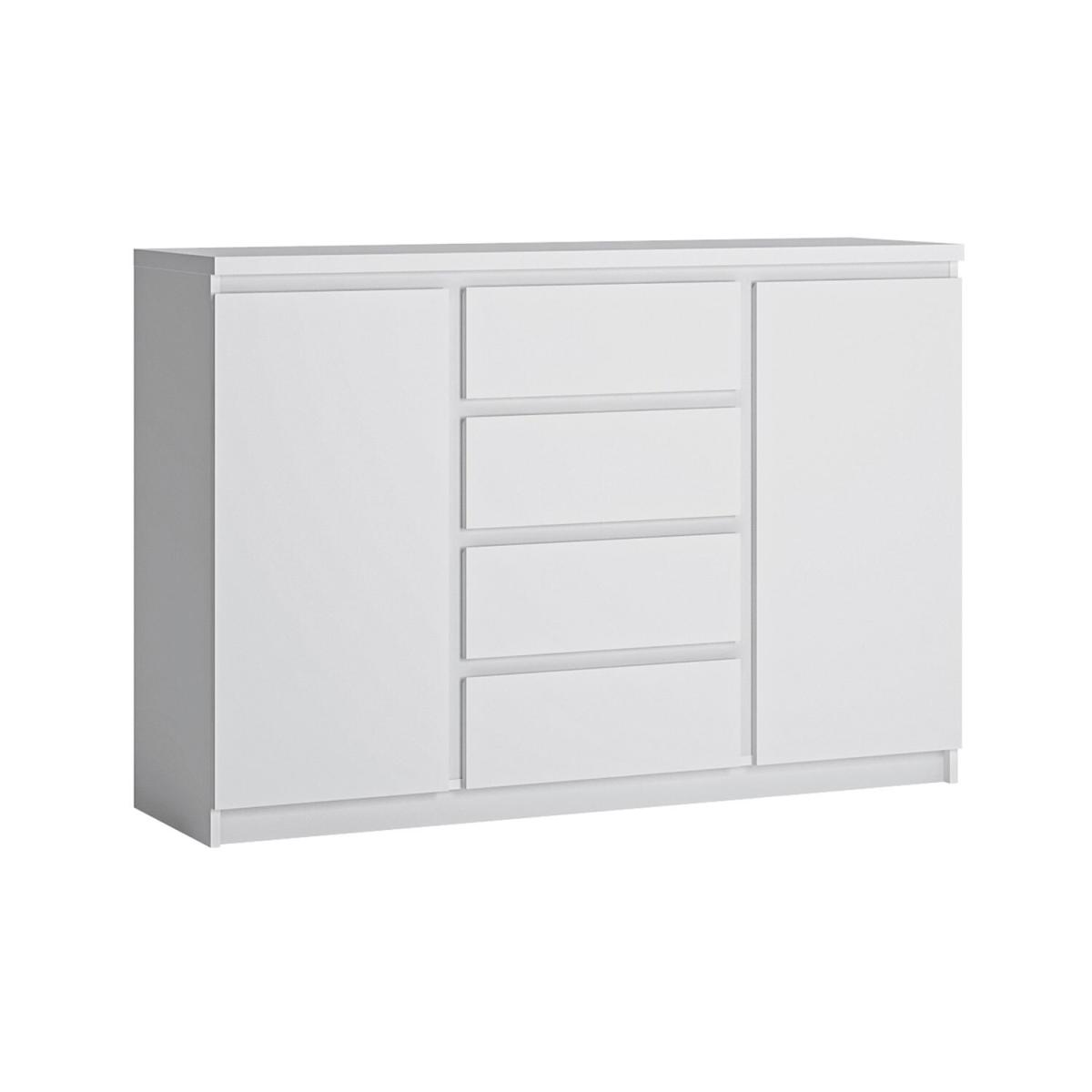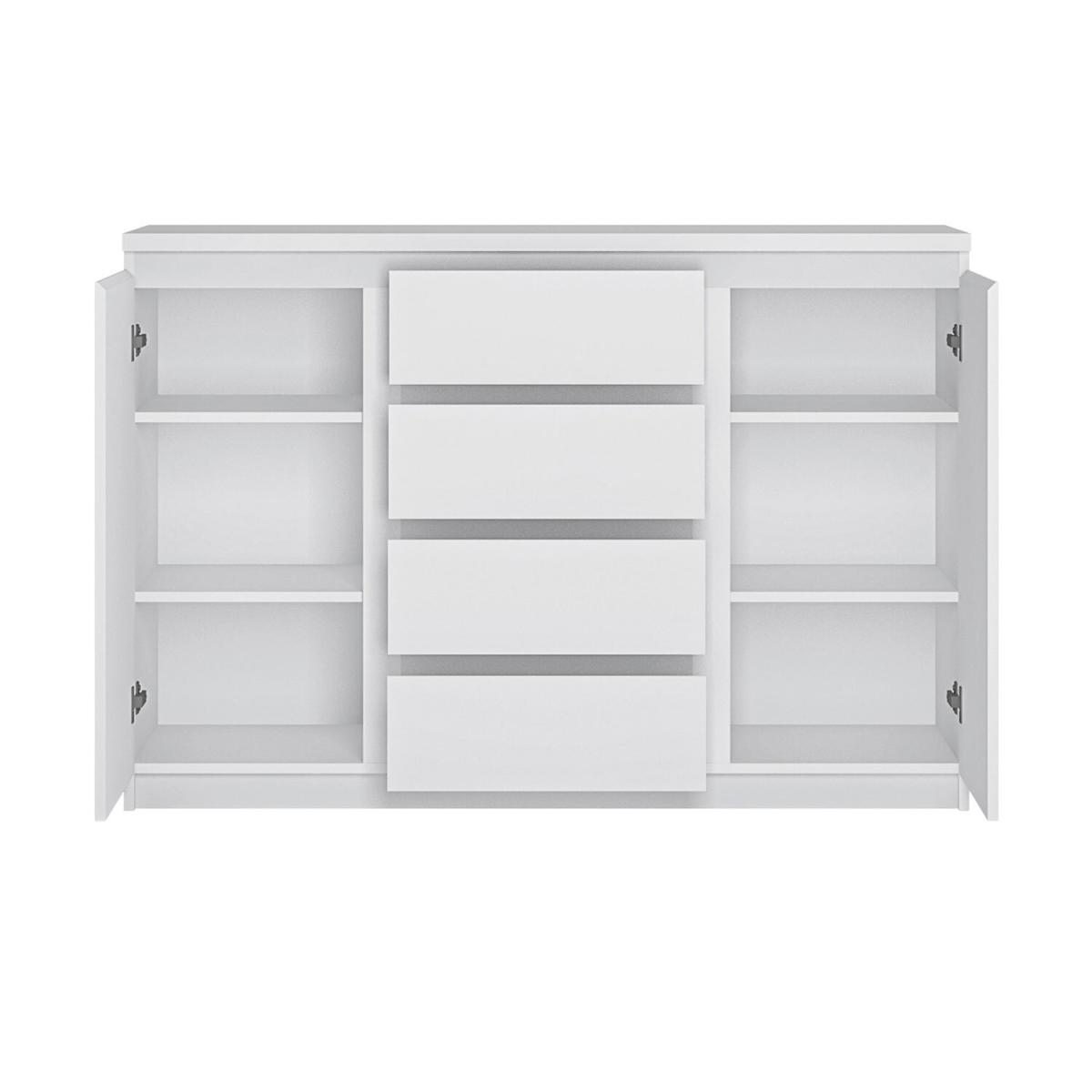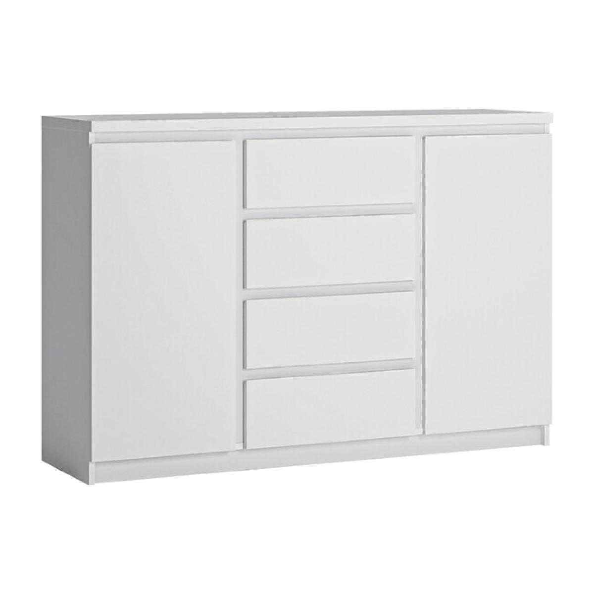 The Fribo 2-Door 4-Drawer Sideboard from the Fribo collection is a piece of furniture for people who value functionality combined with an interesting design. Its design is well thought out, allowing you to store many things on the four spacious drawers and shelves inside the unit. The tabletop can be used to display your favourite accessories or to store small items in decorative boxes. The cabinet from the Fribo collection is equipped with a modern handle-free system, which increases the convenience of using the furniture, and full extension guides that allow the drawer to be pulled out to the very end.
