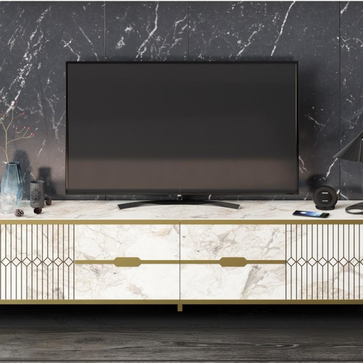 Frida 180 cm Wide Tv Stand - White, Ephesus and Gold - Marble Effect
