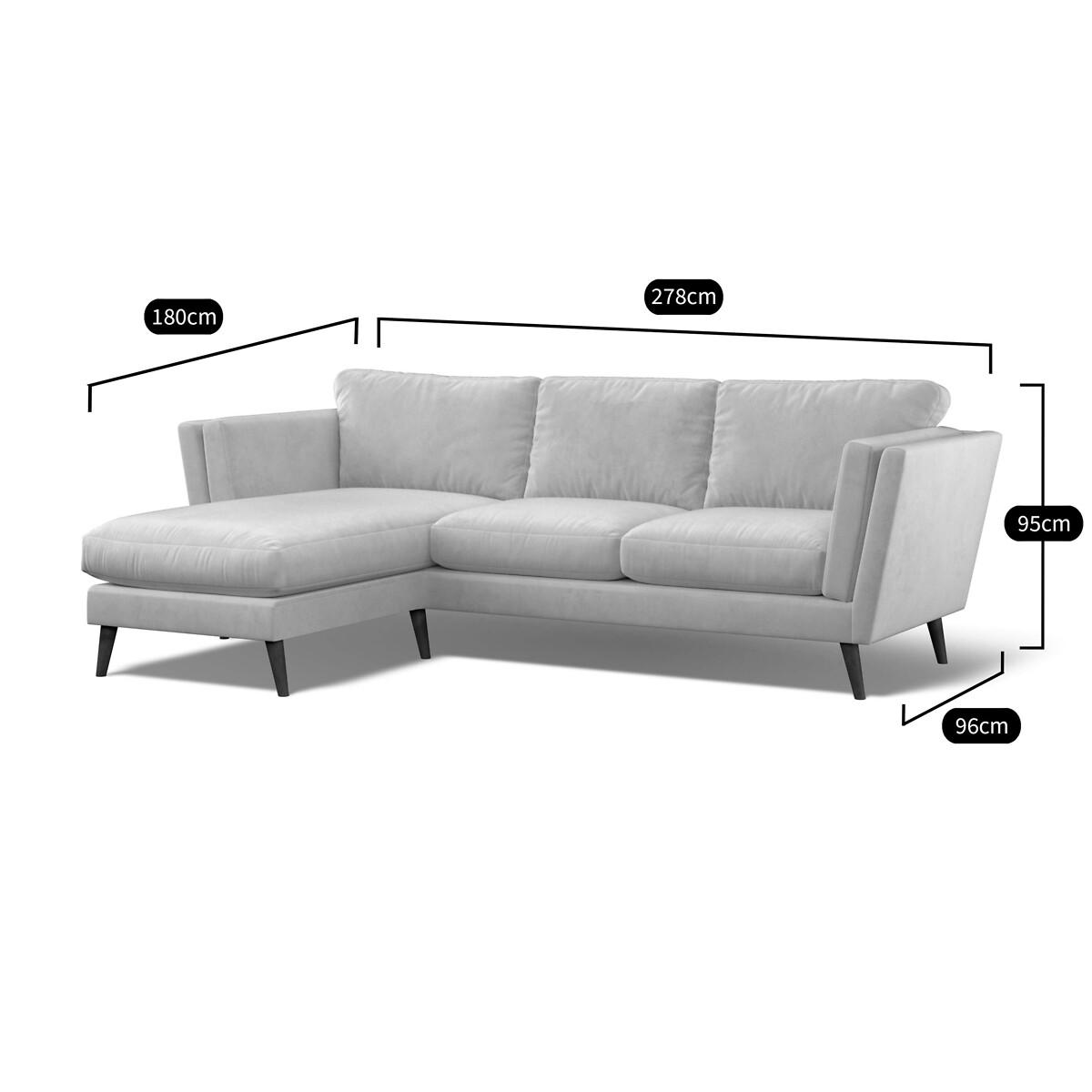 Curl up and cocoon with the beautifully designed Frida. Taking inspiration from ‘60s lounging, the Frida has a high architectural back and extra padding on the arms. Stretch out on the chaise corner and sink into squishy feathery cushions - perfect for cosy afternoon naps. Add some tapered wood legs and you have the very essence of vintage modern, and an easy way to add style to a midecntury inspired living room. Choose from our soft brushed fabric for ultimate cosiness or velvet for luxe living. A right hand sofa is also available, as well as a 2 seater, 3 seater and matching armchair. Product details• Soft Brushed - A cosy and practical flat woven fabric featuring a subtle brushed handle for a superbly snuggly seat. Check it's right for you - order a FREE swatch above.• Created with medium density foam fillings for a sofa with a level of comfort suitable for most. • Luxury seating cushions made from a blend of foam, feather and fibres offer the best of both words. A foam core with a feather wrap gives the cushion increased resilience and support without compromising on comfort, whilst fibre fillings add softness and body. Feather fillings allow air to circulate better, whilst being great at retaining heat in colder months. • Fibre backs provide extra softness and give you that "sink in" feeling.• Just flip to freshen up - the back cushions are fully finished both sides and reversible so it's easy to keep your sofa looking its best. Seat cushions are not reversible but are removable. • Both seat and back covers are removable (zip fastening)• FSC® solid beech hardwood frame - made of wood from responsibly managed forests that provide environmental, social and economic benefits.• Tapered feet crafted entirely from solid wood ensure durability and stability.• Removable feet.• Lovingly handmade in the UK.All our made to order sofas are carefully manufactured in the UK.Each hardwood frame is dowelled, glued, and screwed before being paired with the finest fabrics and fillings. And it doesn't stop there - for customer peace of mind and safety, all frames and fabrics are rigorously examined, inspected, and tested to the highest standards. All filling material(s) and covering fabric(s) meet the requirements for resistance to cigarette and match ignition in the 1988 safety regulations. This sofa comes with a 3 year manufacturer warranty from date of delivery (subject to terms and conditions)Product composition• Fabric - Soft Brushed (100% polyester)• Seat fillings - foam/fibre/feather• Back Fillings - Fibre• Frame - Beech Hardwood (FSC), OSB (UK origin, FSC)• Feet - Solid Wood. Product Dimensions Overall width: 278 cm. Overall depth: 96/180 cm. Overall height: 95 cm. Seat height: 48 cm. Seat depth: 60 cm. Seat width between the arms: 245 cm Arm width (at highest point): 8 cm excluding cushioned part, 20 cm including cushioned part. Back height (from base): 75 cm. Back height (from seat): 46 cm. Arm height (from floor): 80 cm. Arm height (from seat): 40 cm Clearance to floor (leg height): 20 cm. Please remember to measure your available space before ordering to be sure your sofa will fit. Don't forget to measure accessways and corners, and consider any obstacles. Package DimensionsL22. 1 cm x W151 cm x H96 cm, Weight 86 kg. This product will be dispatched by one of our trusted suppliers. You’ll be contacted by their selected courier about your delivery. Your product will be delivered to your room of choice. Feet may be assembled on arrival. BELFI01